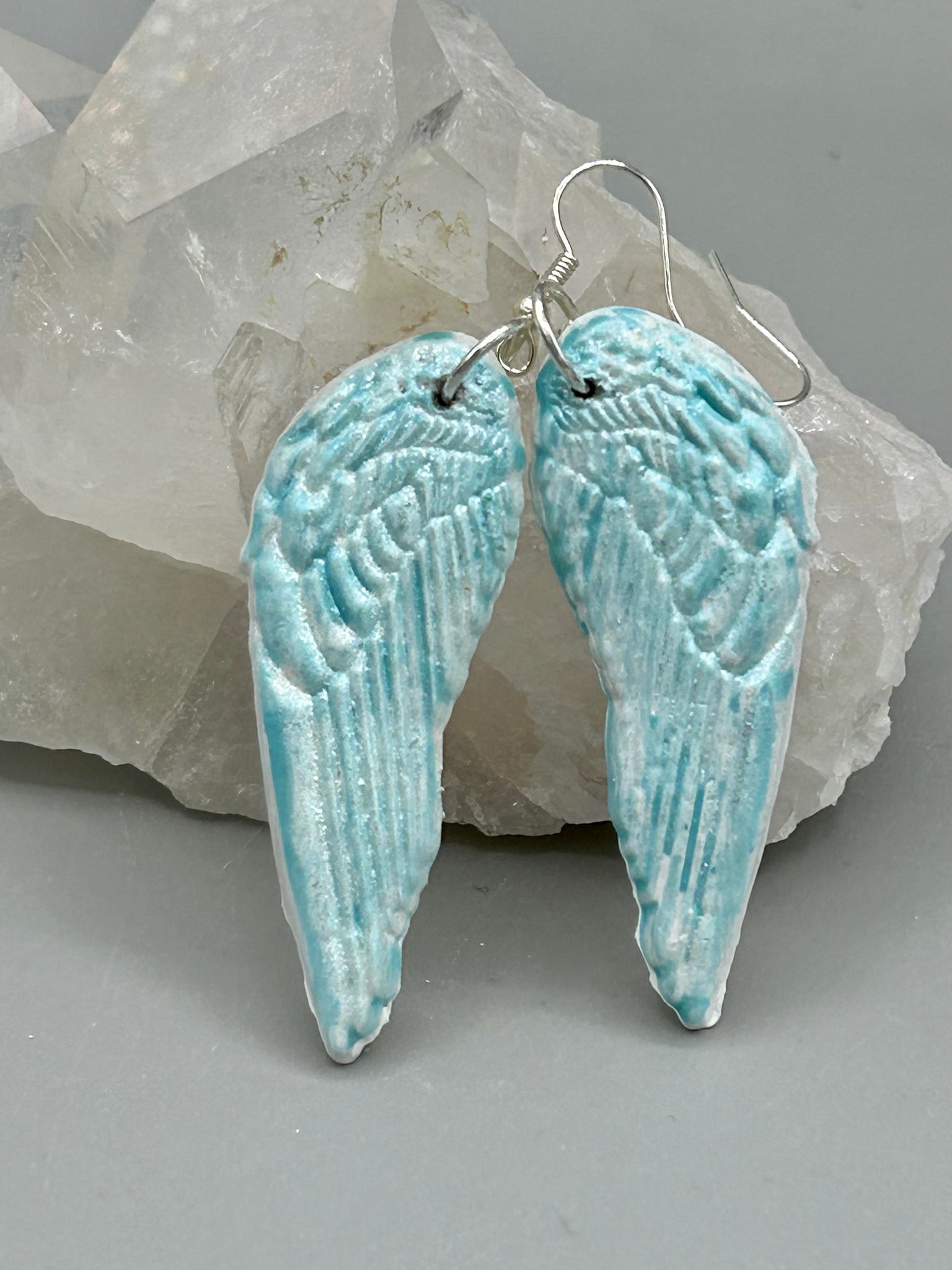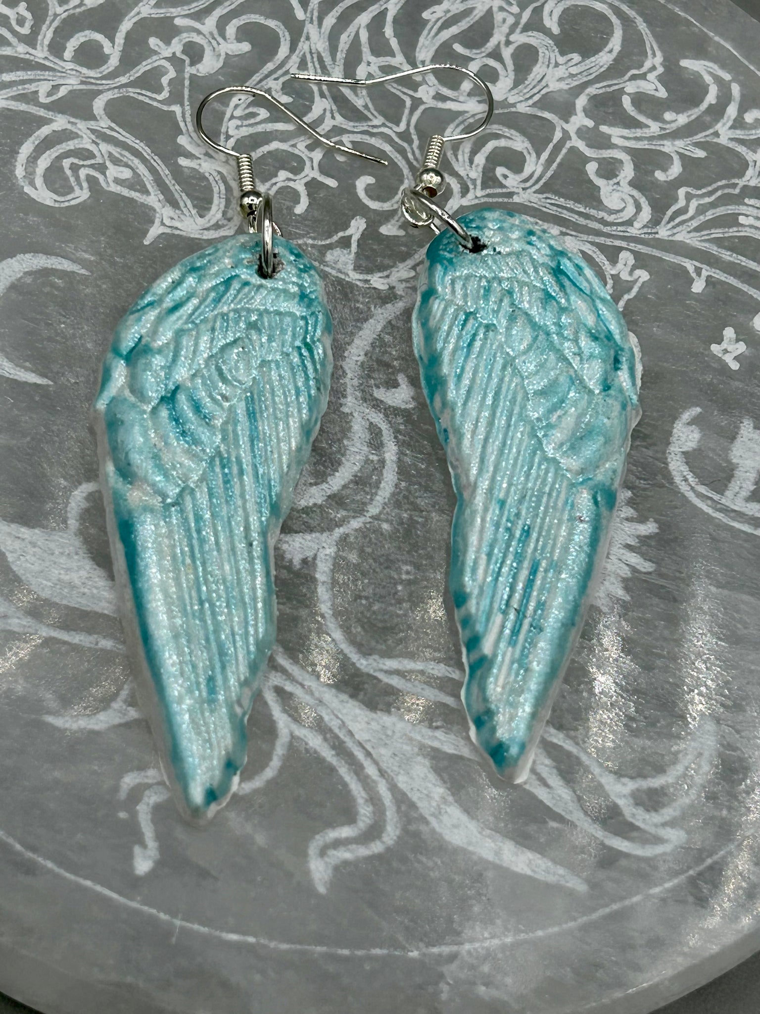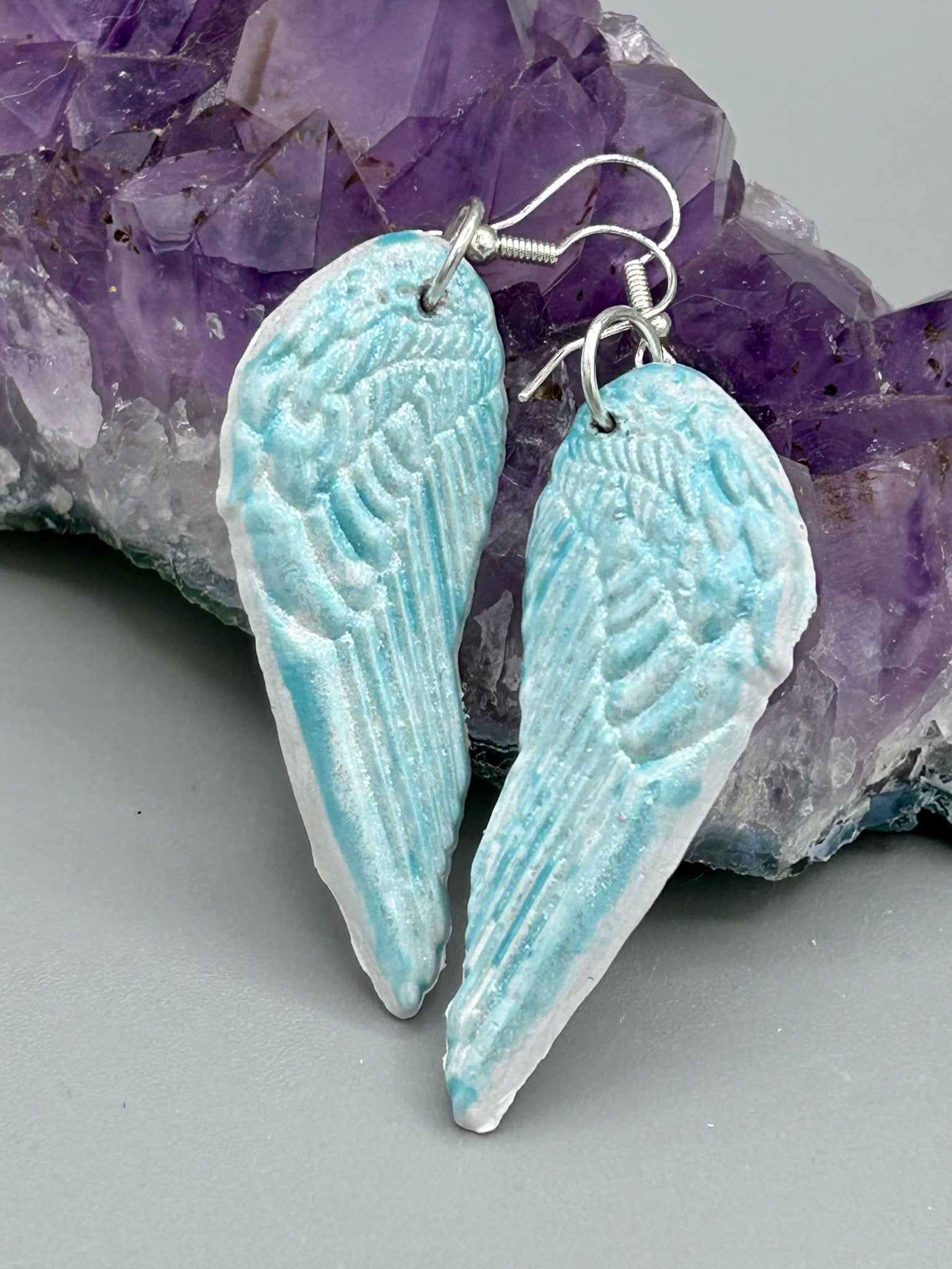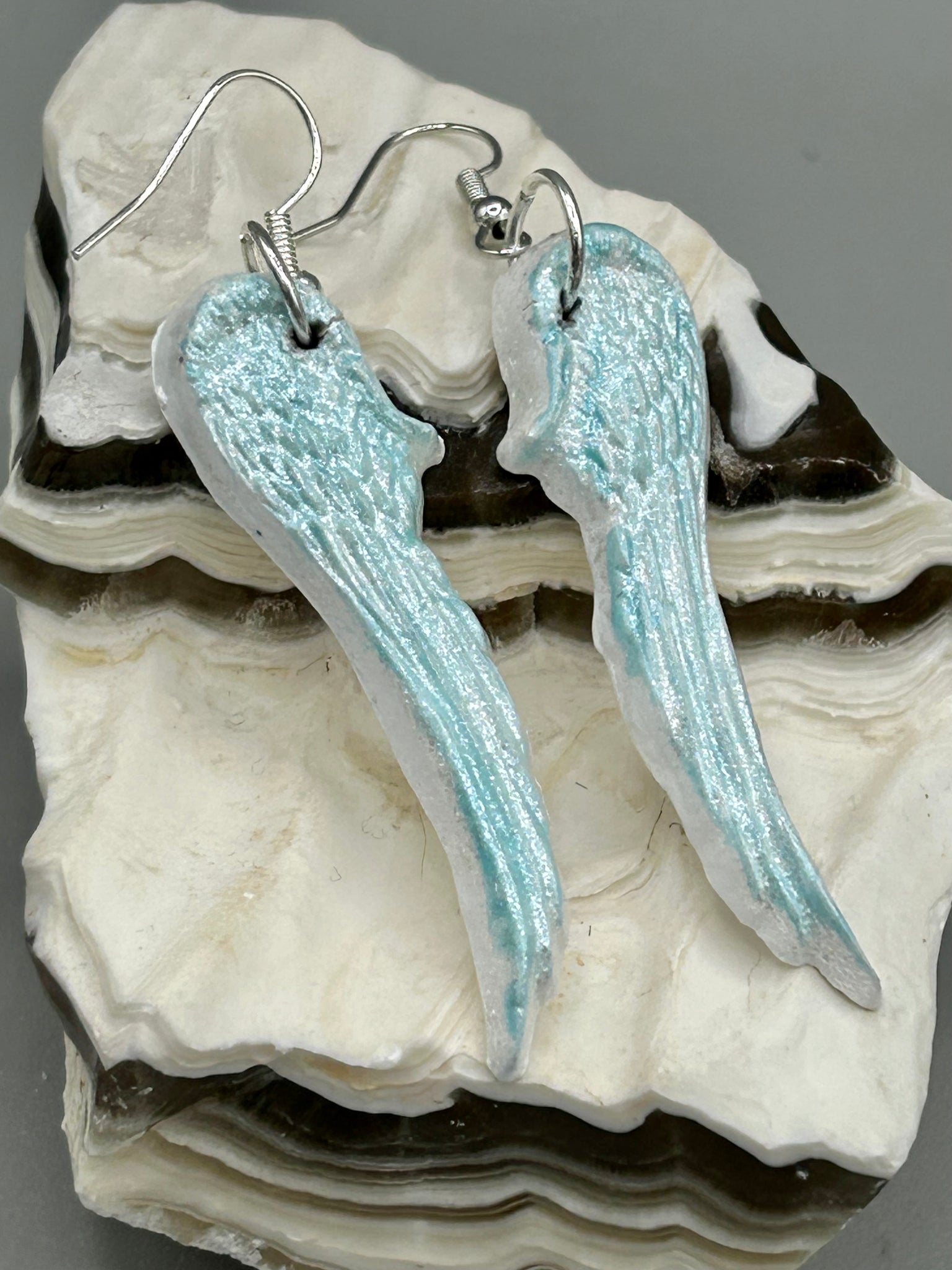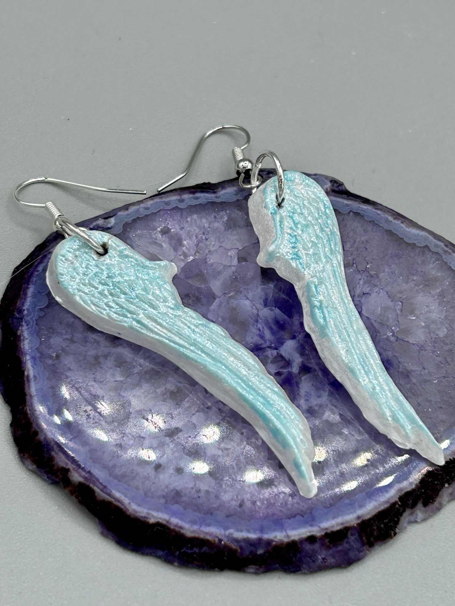 Cutely designed light baby blue polymer clay earrings in the shape of angel wings are perfect for a subtle yet elegant look. These earrings are designed to face forward when worn for a more flattering silhouette.