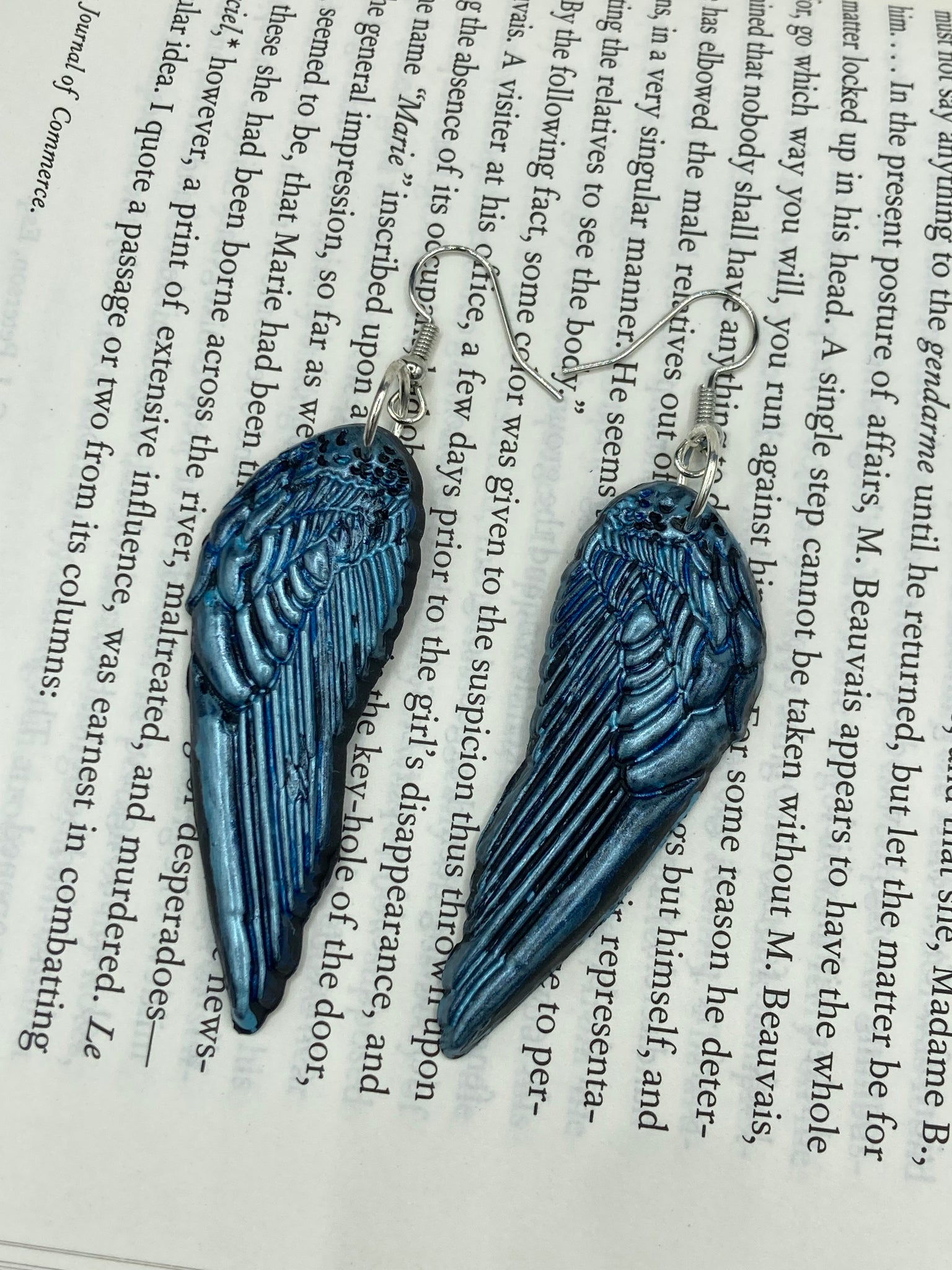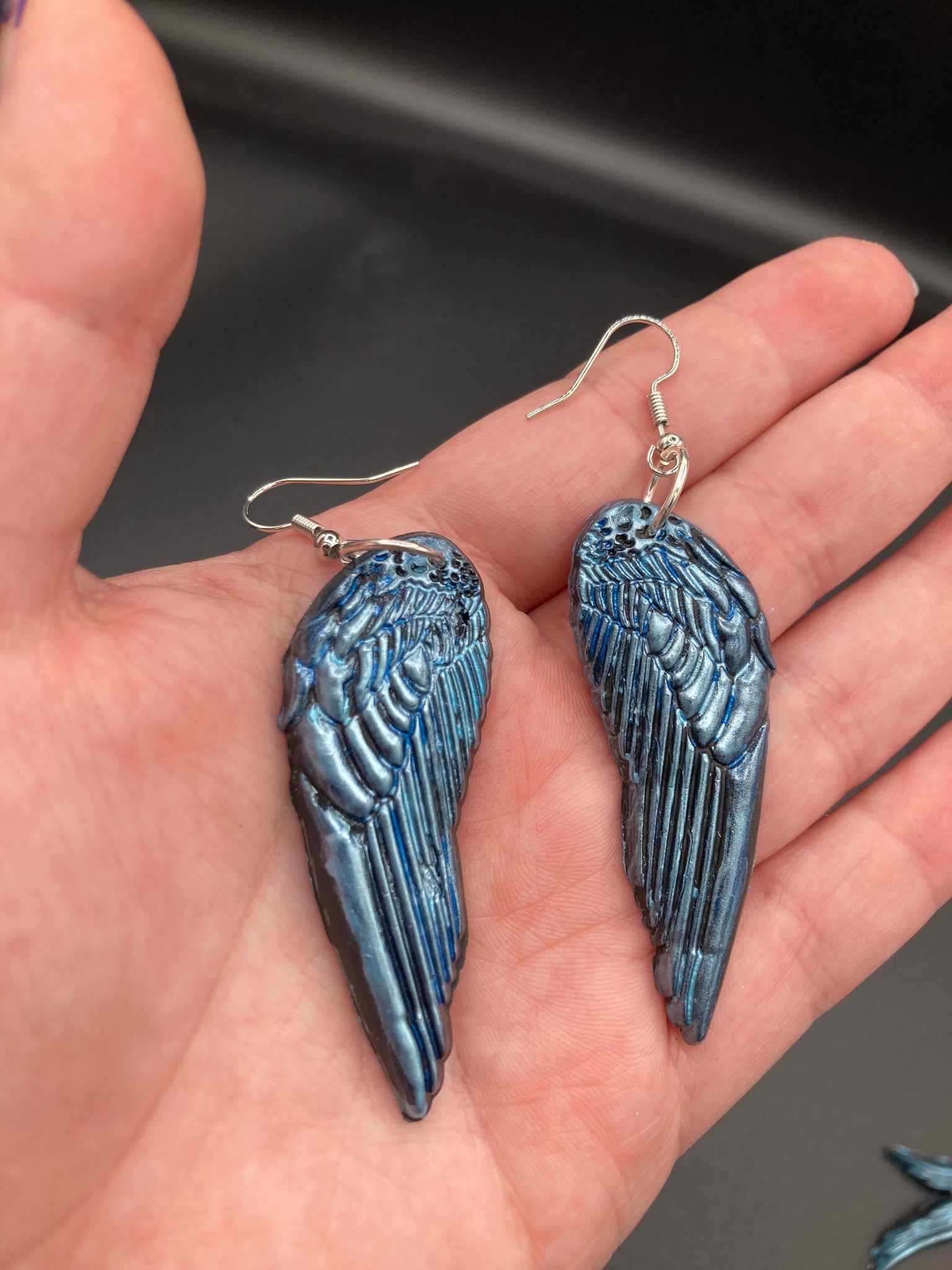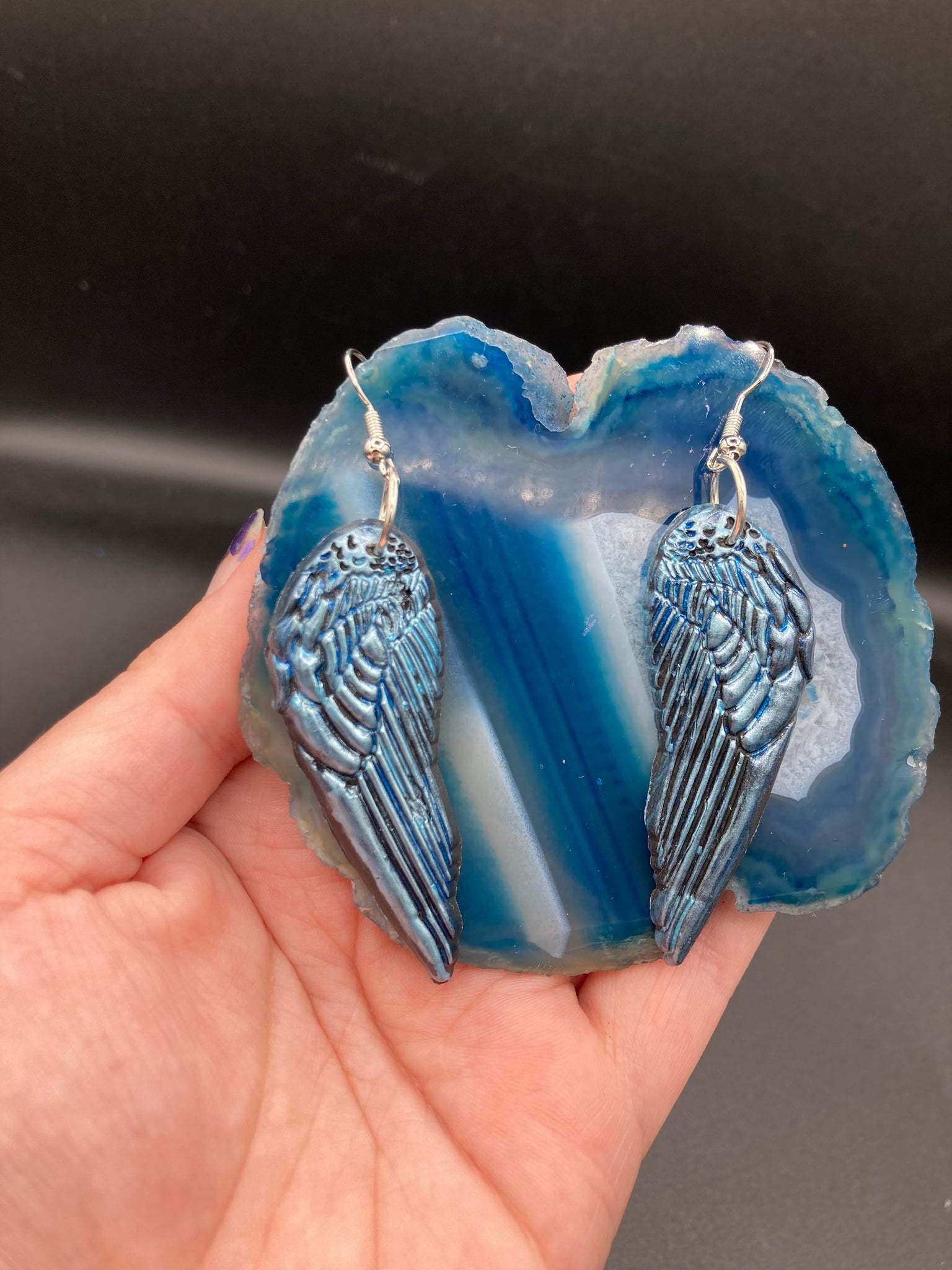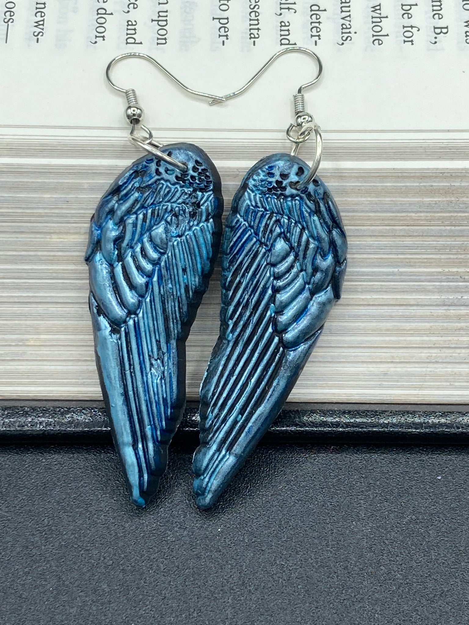 Sparkling light blue angel wings earrings made of polymer clay. These earrings are designed to face forward when worn instead of the front wings showing on the side.