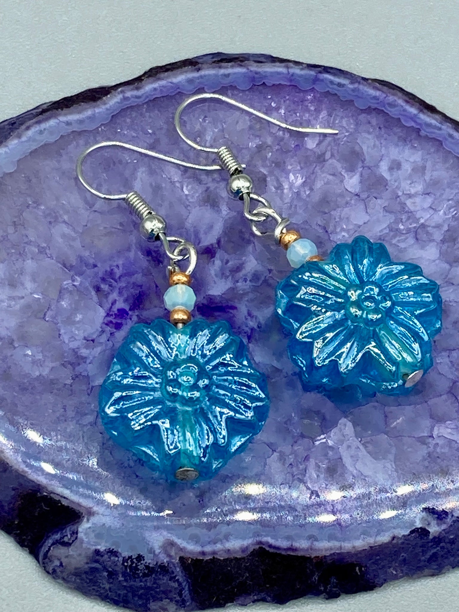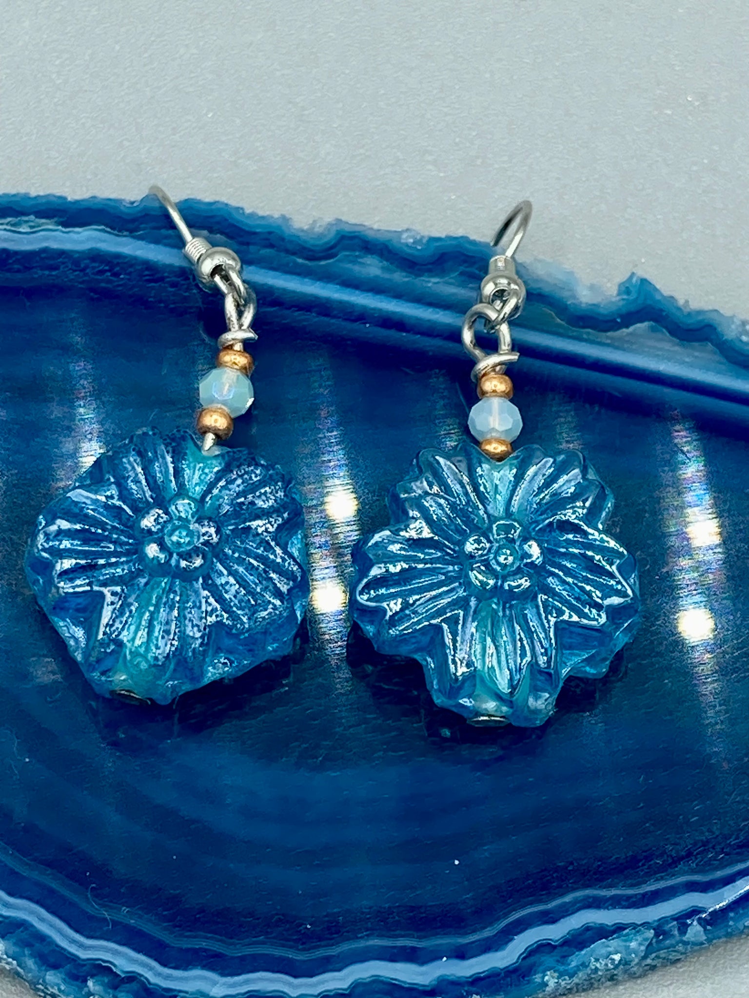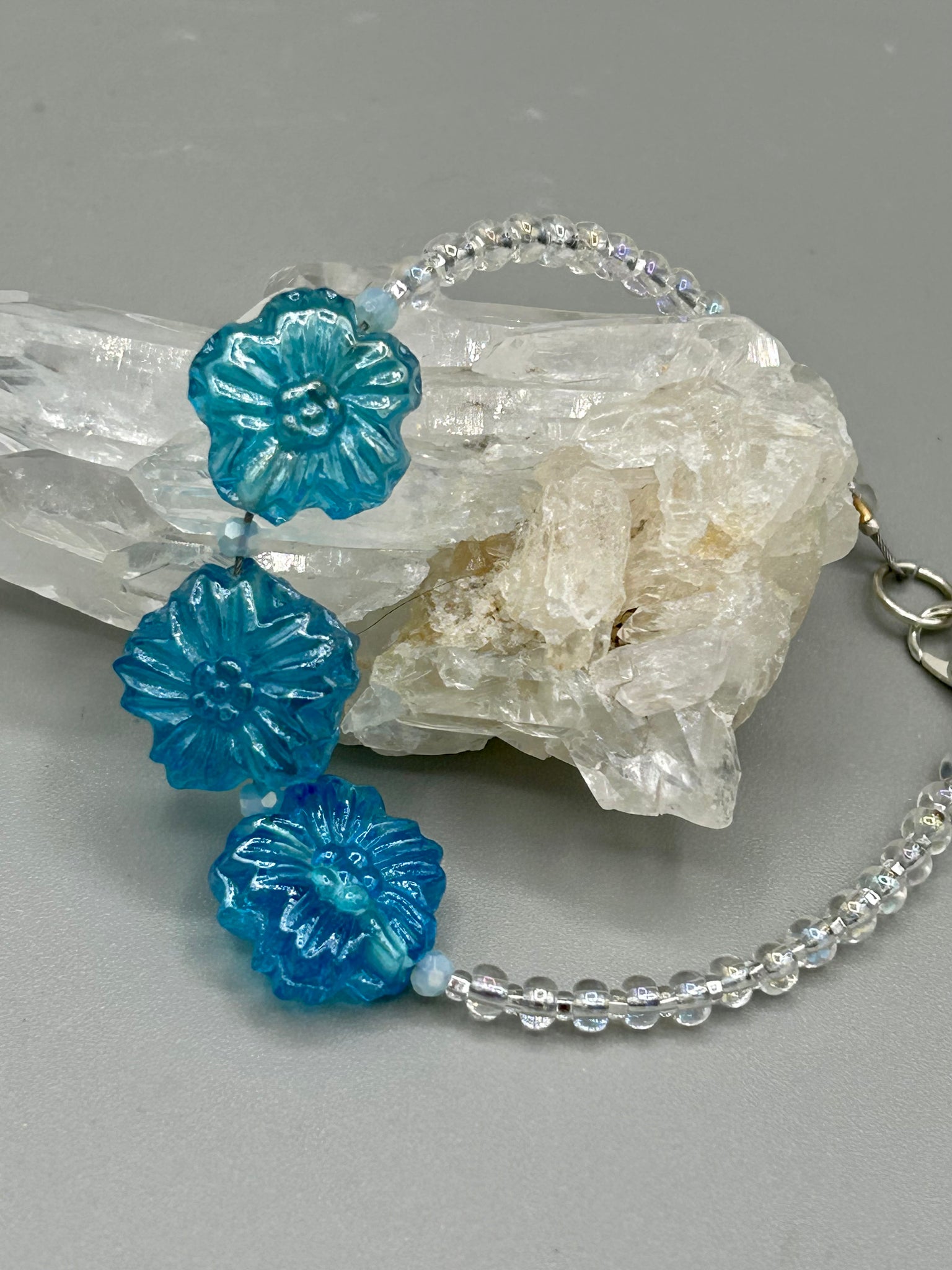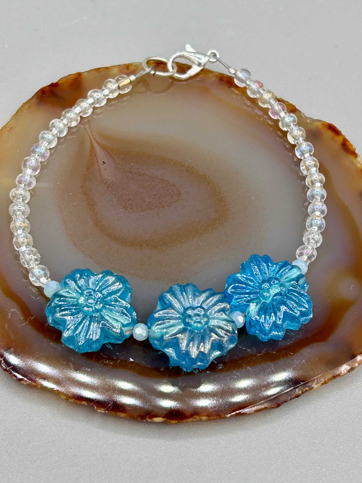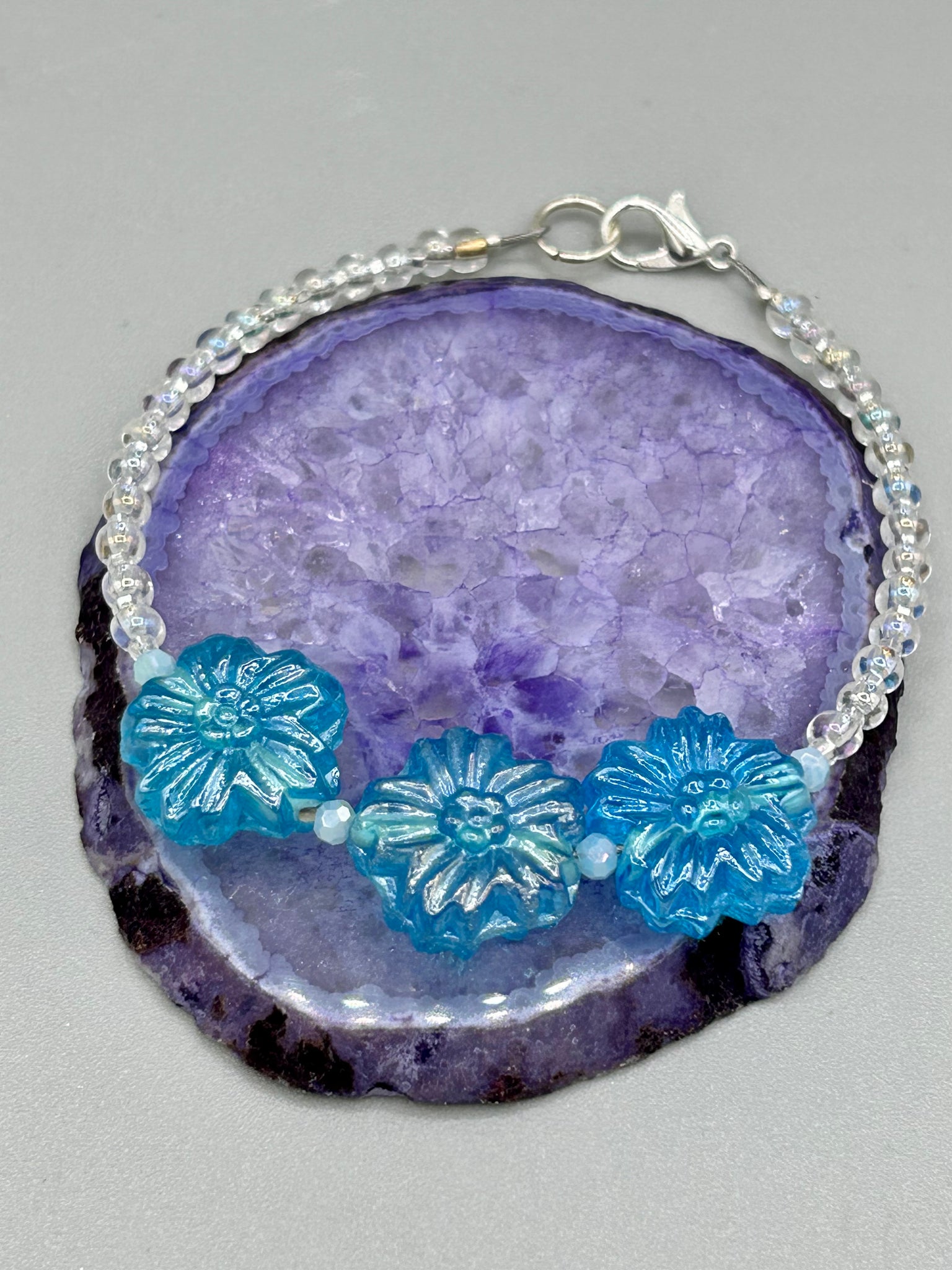 This light blue pressed glass floral bracelet is a sophisticated addition to any summer look. Its iridescent shimmer finish adds a classy touch to its intricate metal wire and lobster claw clasp. Perfect for any nature-inspired wardrobe.