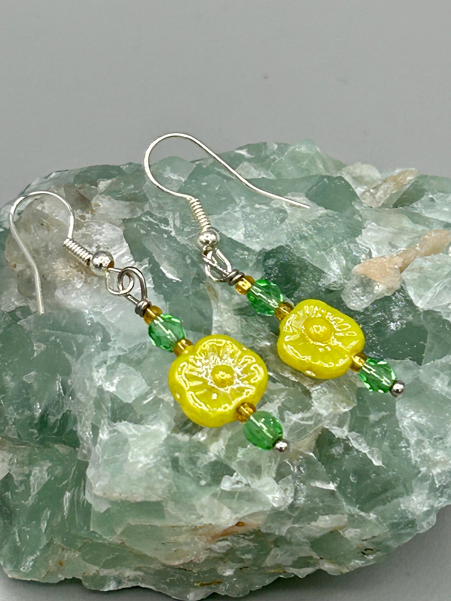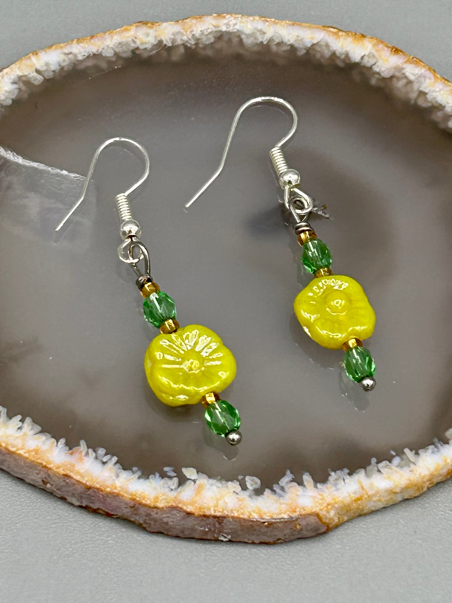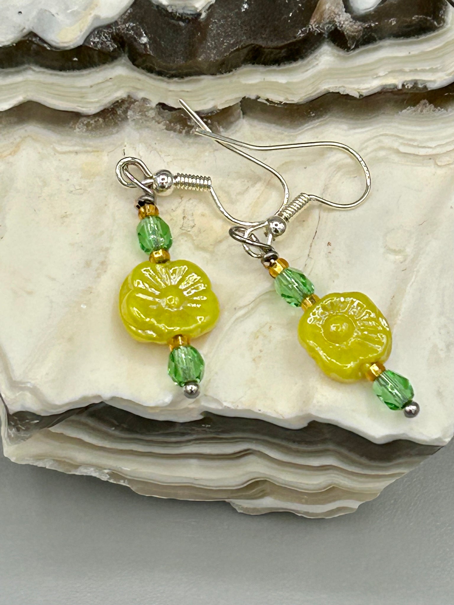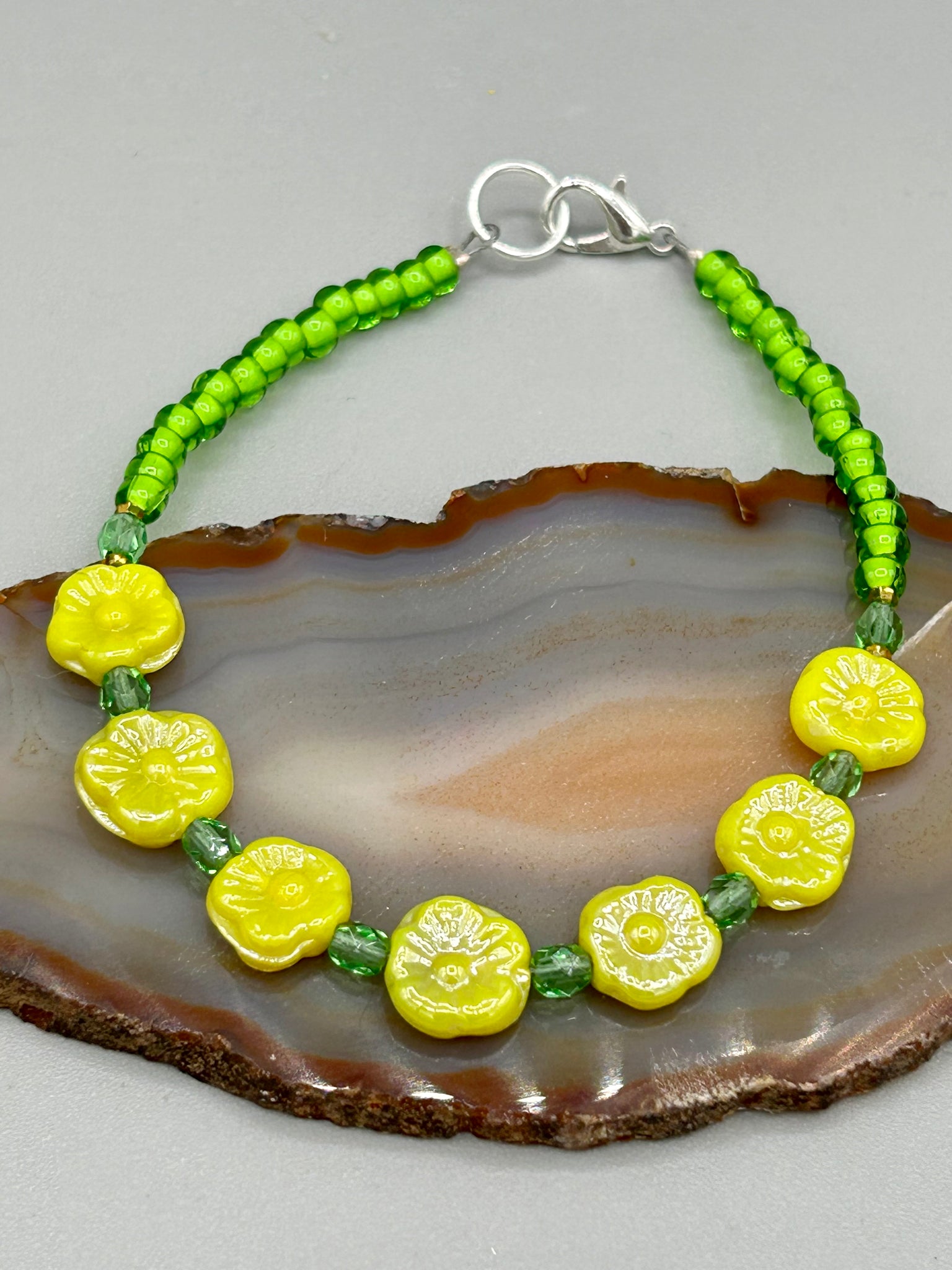 This delicate jewelry displays an array of gentle hues, vibrant yet soft.This light yellow pressed glass floral beaded bracelet and earrings set features an iridescent shimmer finish and is crafted with metal wire and a lobster claw clasp for easy closure.