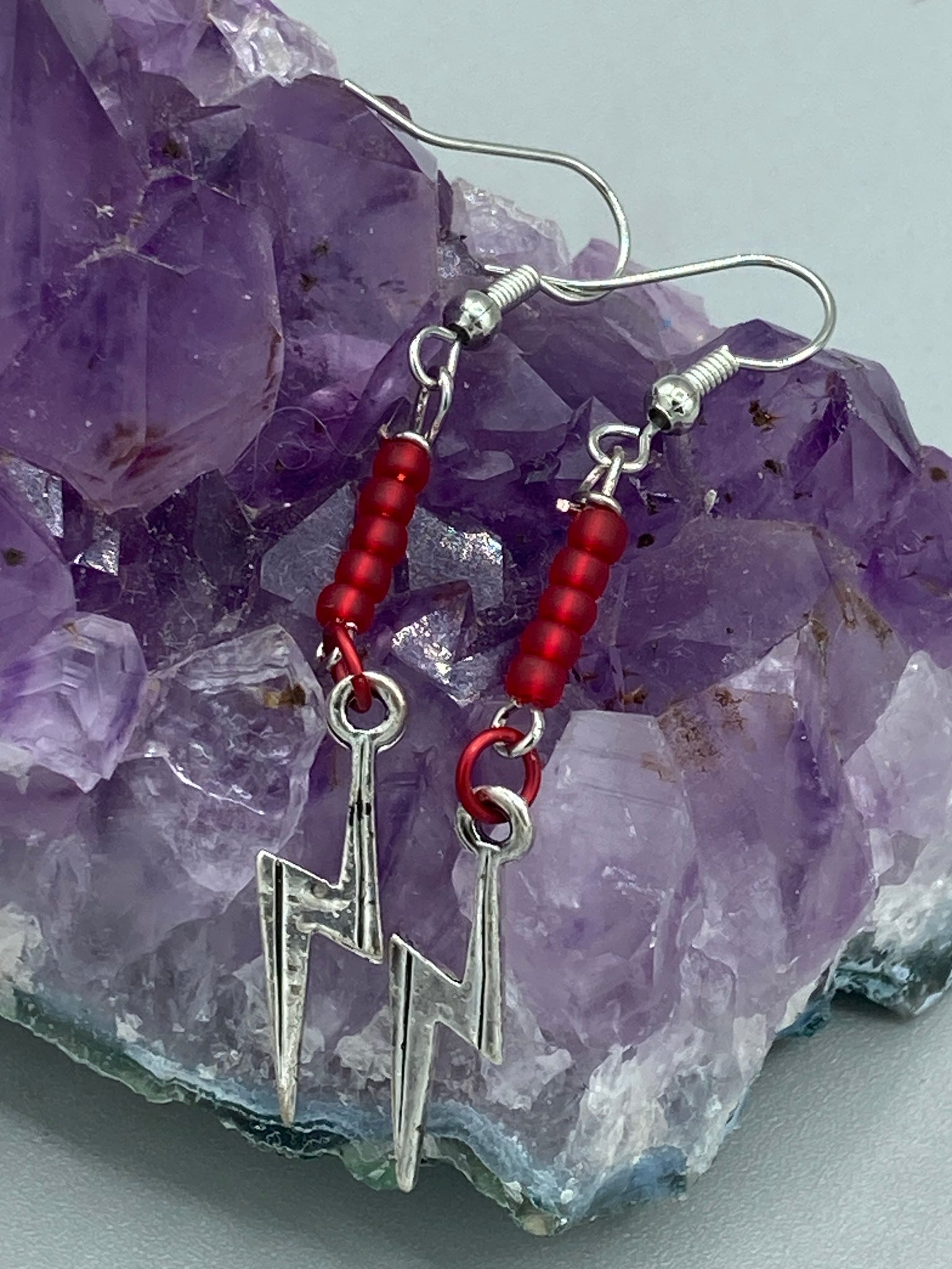 These Lightning Bolt Drop Earrings feature flat matte ruby-red glass beads and elegant lightning bolt charms. Measurements: 1 1/2” in length