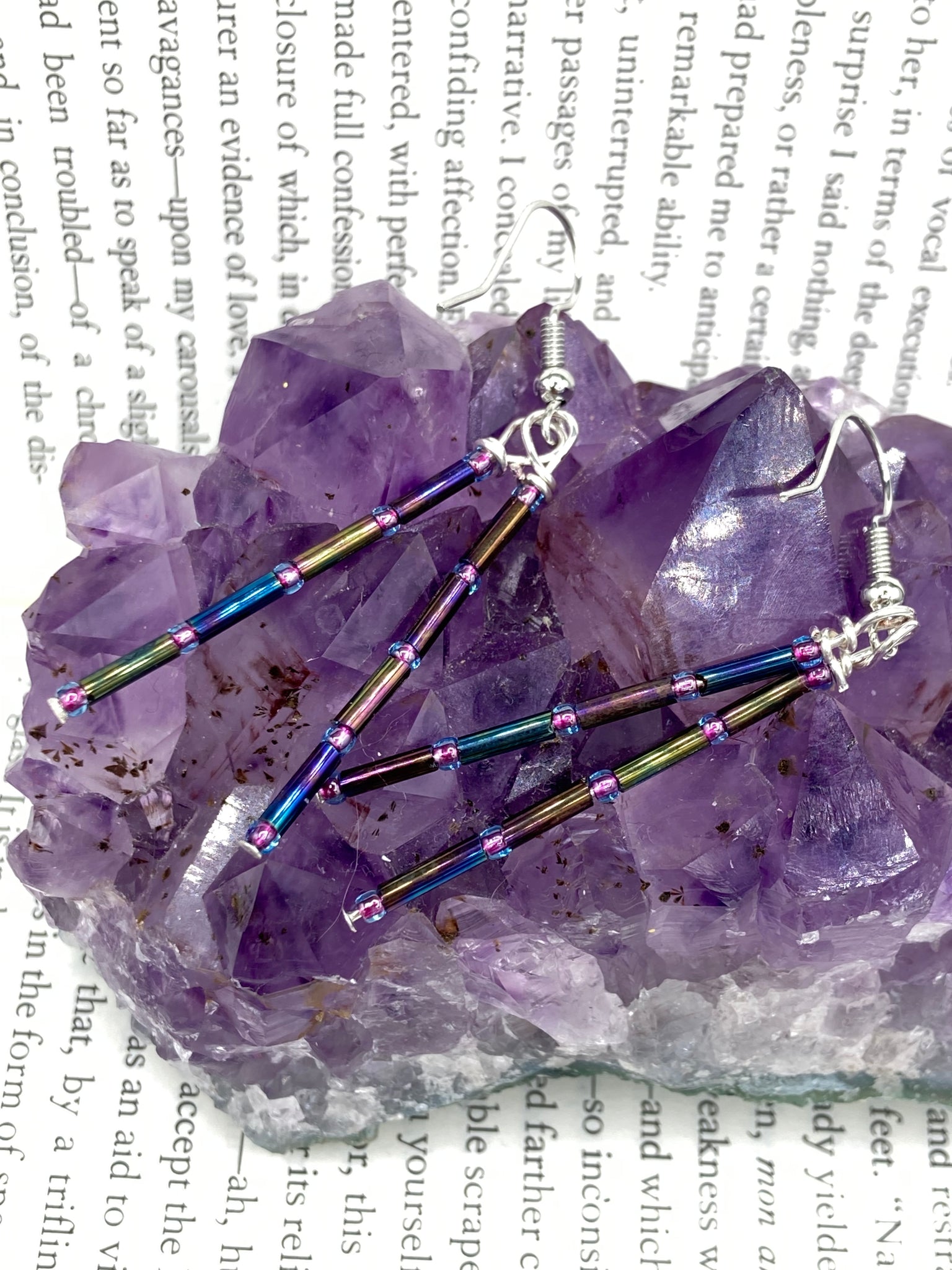 Shimmery glass beads contain hues of blues, purples, green, and a tint of gold. This pair goes with any outfit.