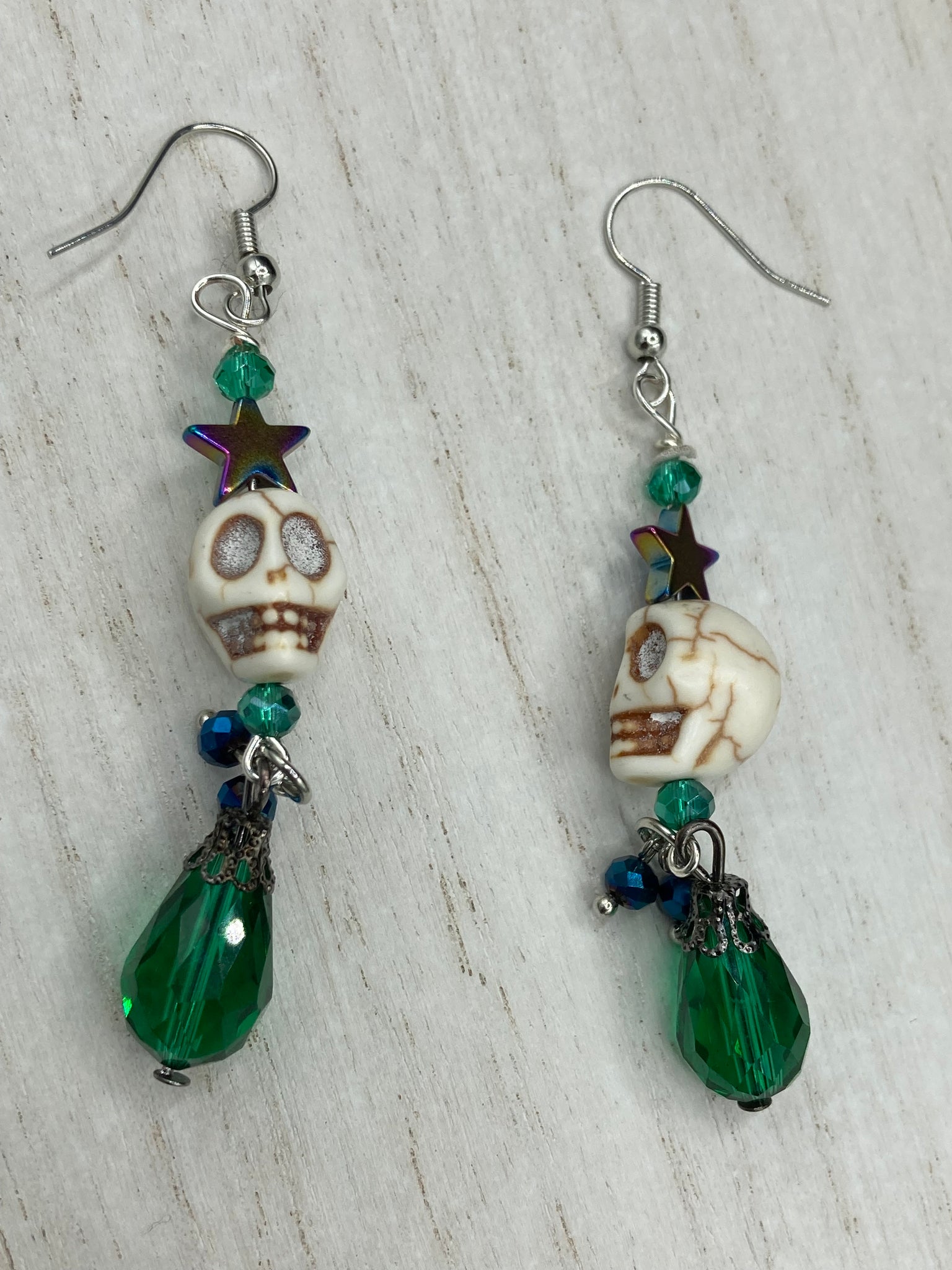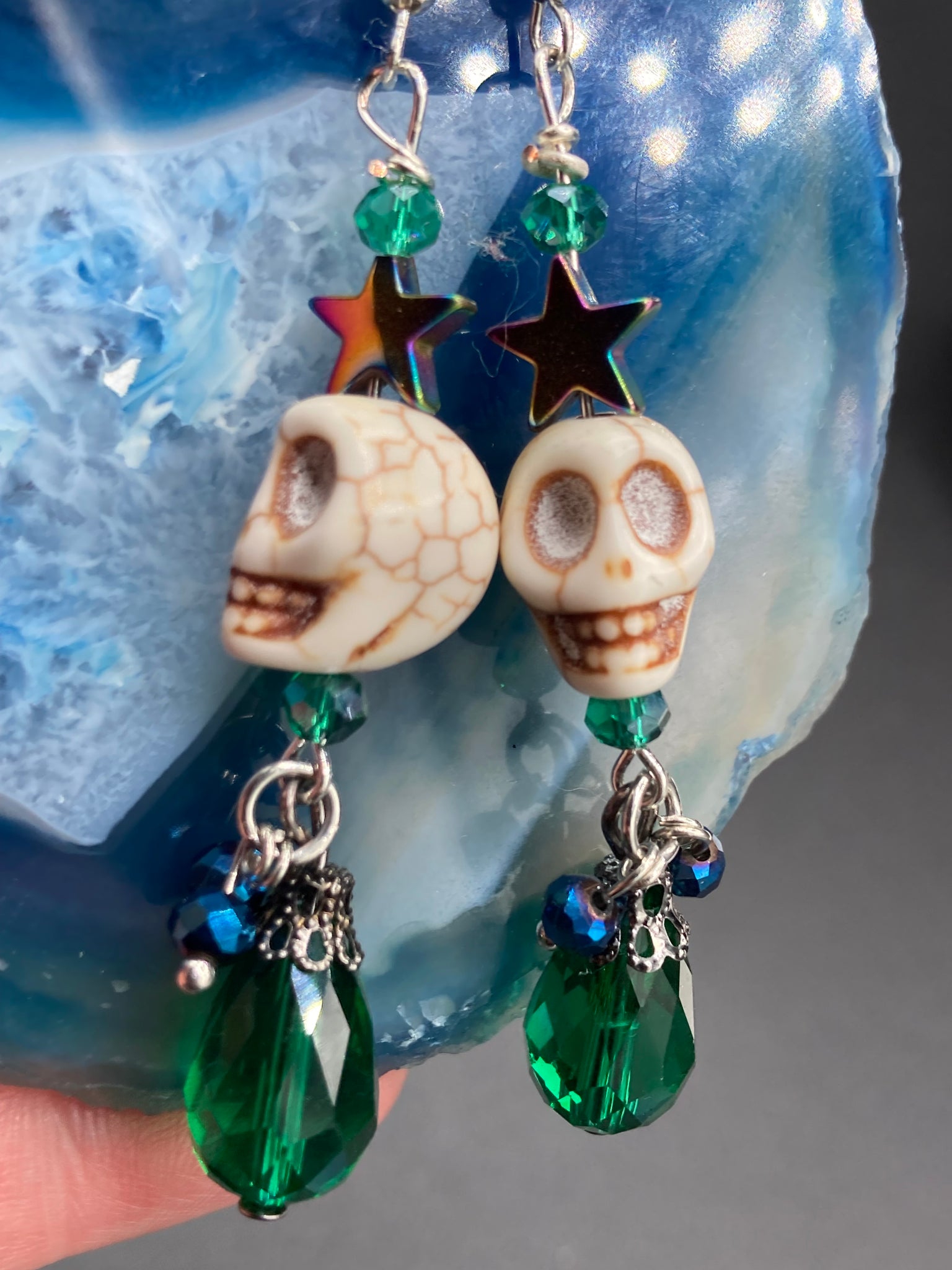 Mini Howlite Skull Bead Earrings large star shaped rainbow hematite bead with a large bright green teardrop shaped glass bead on the bottom of the skull for max shimmer and movement. Ultimate Chingona, Cabrona, Latina Chicana, Goth, Vampire Goth, Dark Witchy, La Bruja Style. You can dress these up or down, it will definitely give your outfit a unique look. You can dress these up or down, it will definitely give your outfit a unique look.