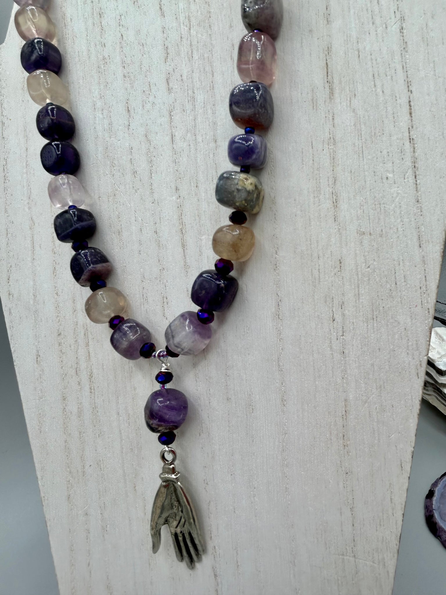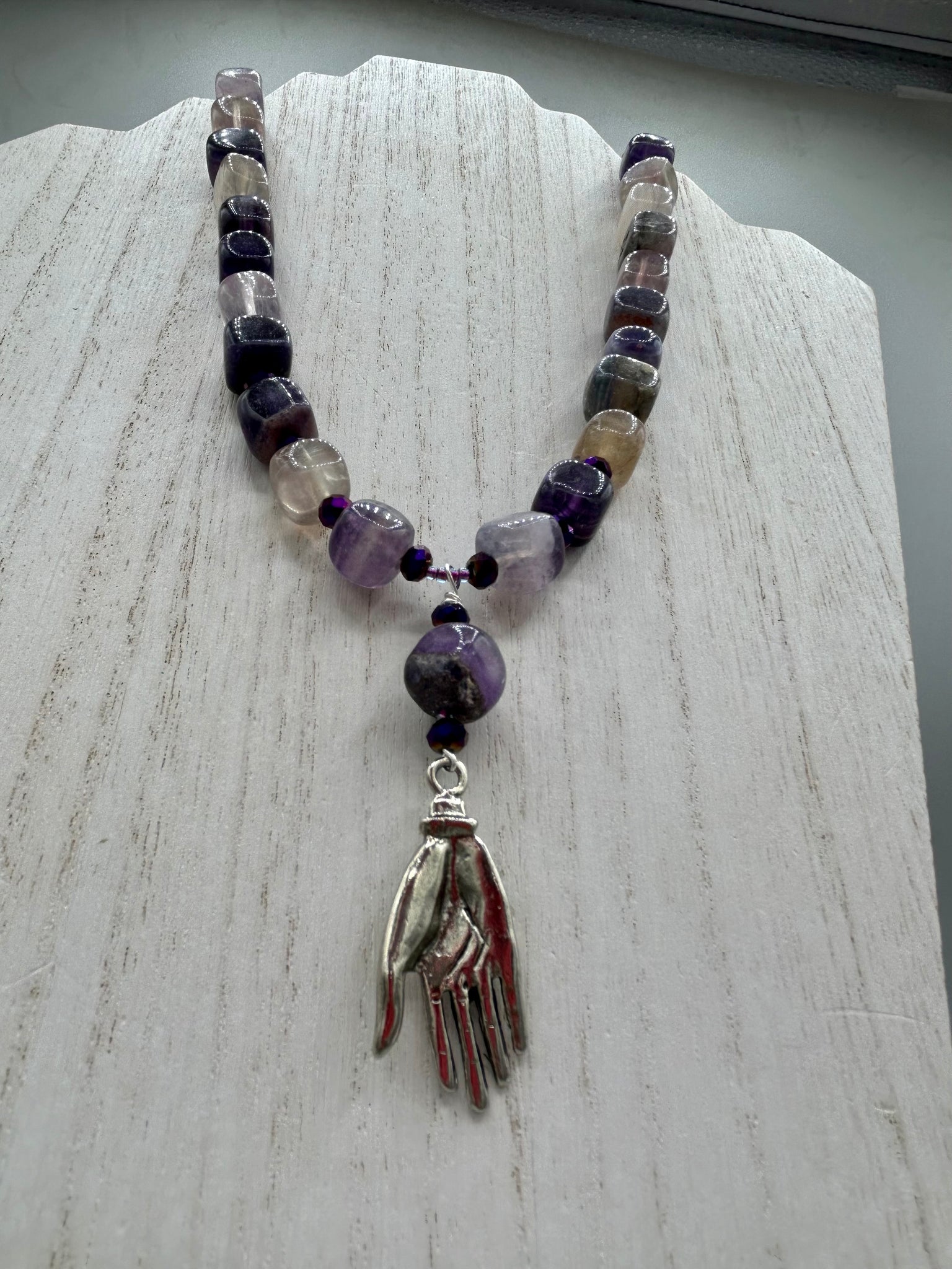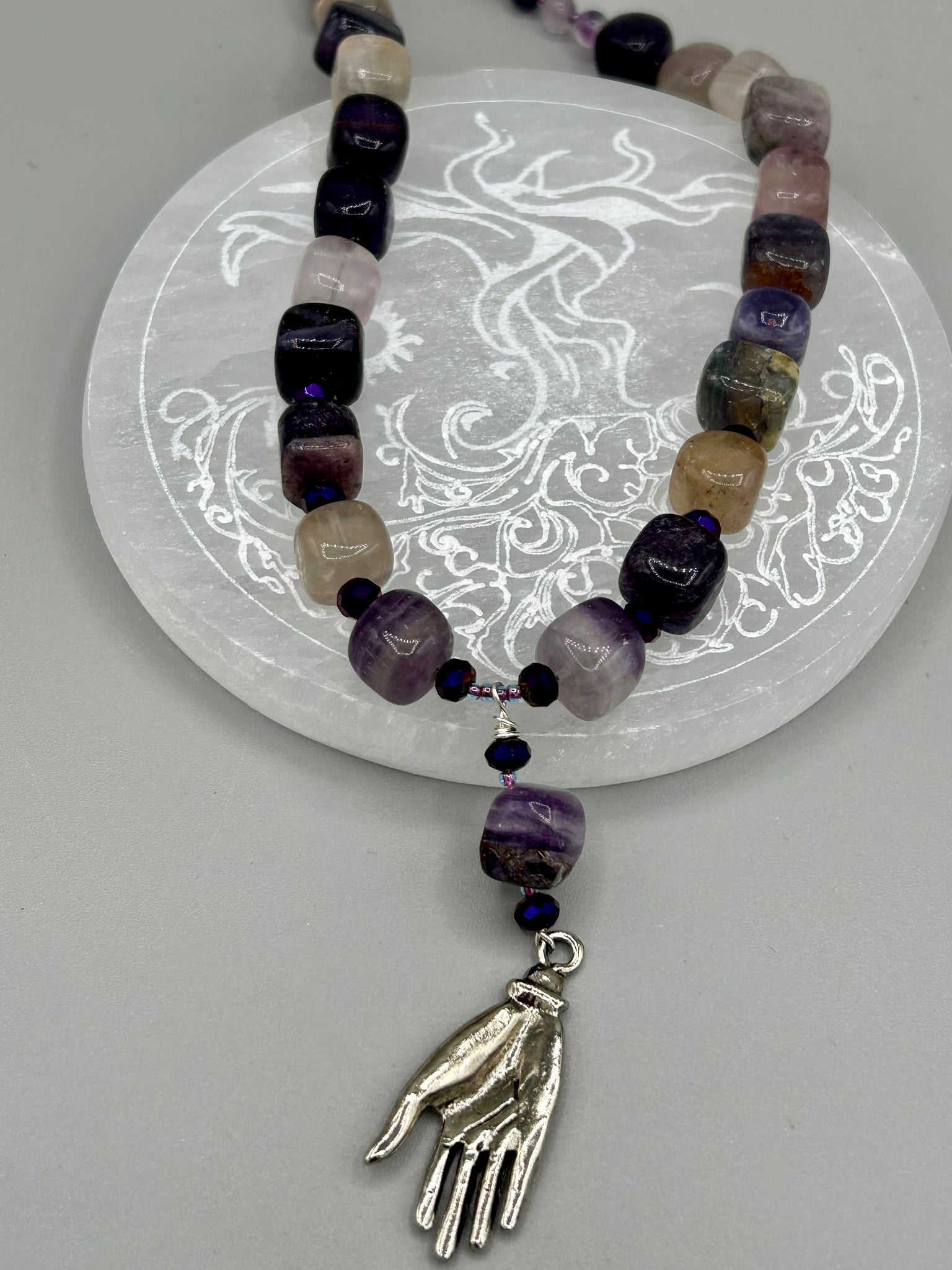 This nature-inspired accessory features an array of unique hues, including rainbow fluorite stone beads and iridescent dark shimmery purple glass beads with hints of gold, blue, pink, and green. The secure hook-eye clasp makes it perfect for day to night wear, allowing you to add a touch of summer to your wardrobe. The necklace is further complemented by a large square-shaped rainbow fluorite bead and a lucky hand charm.