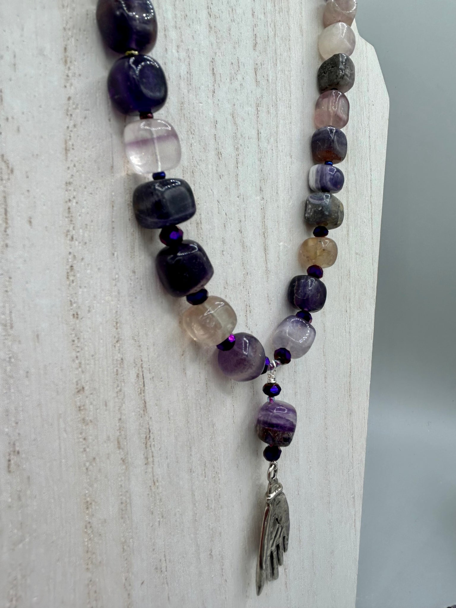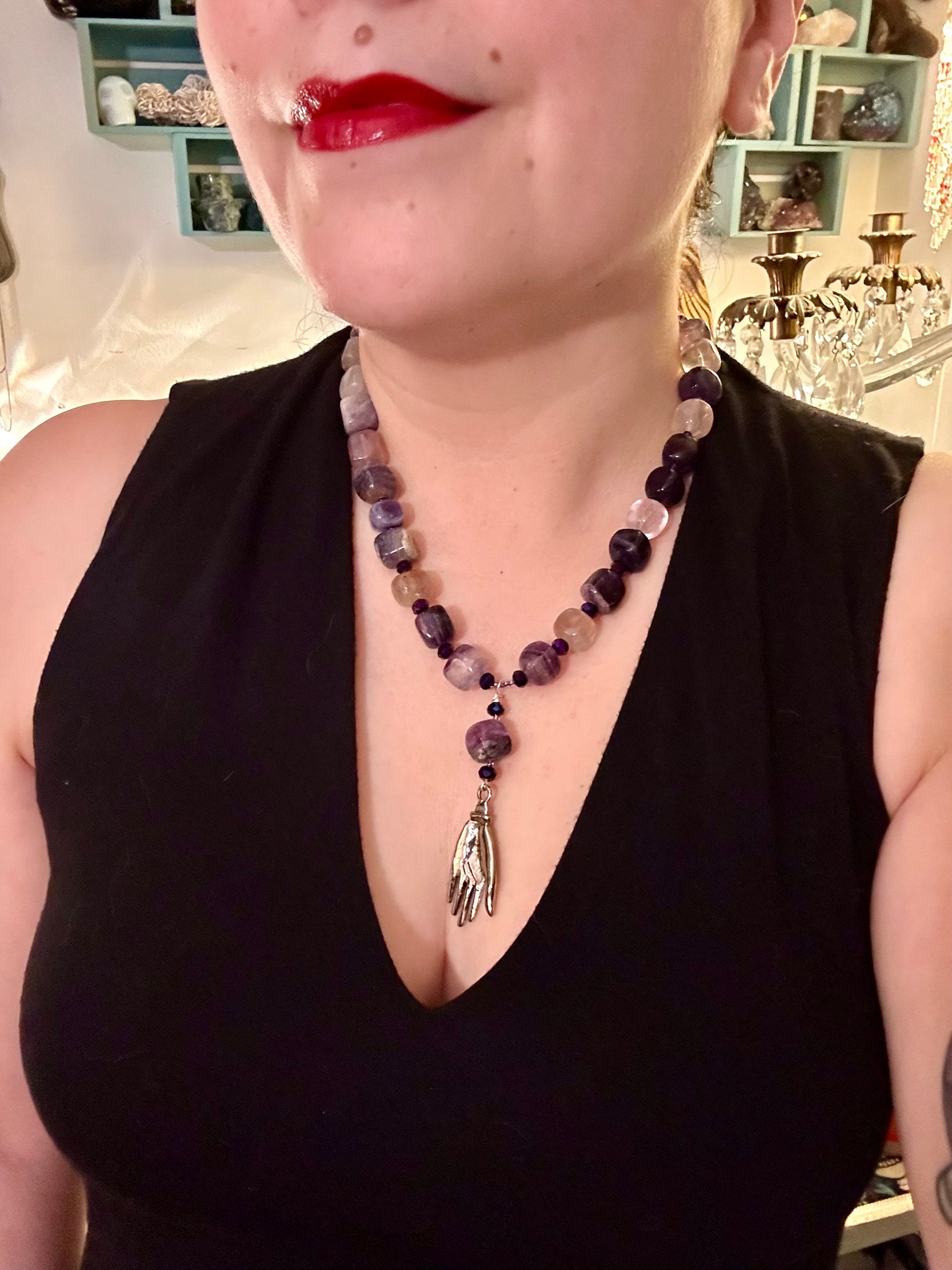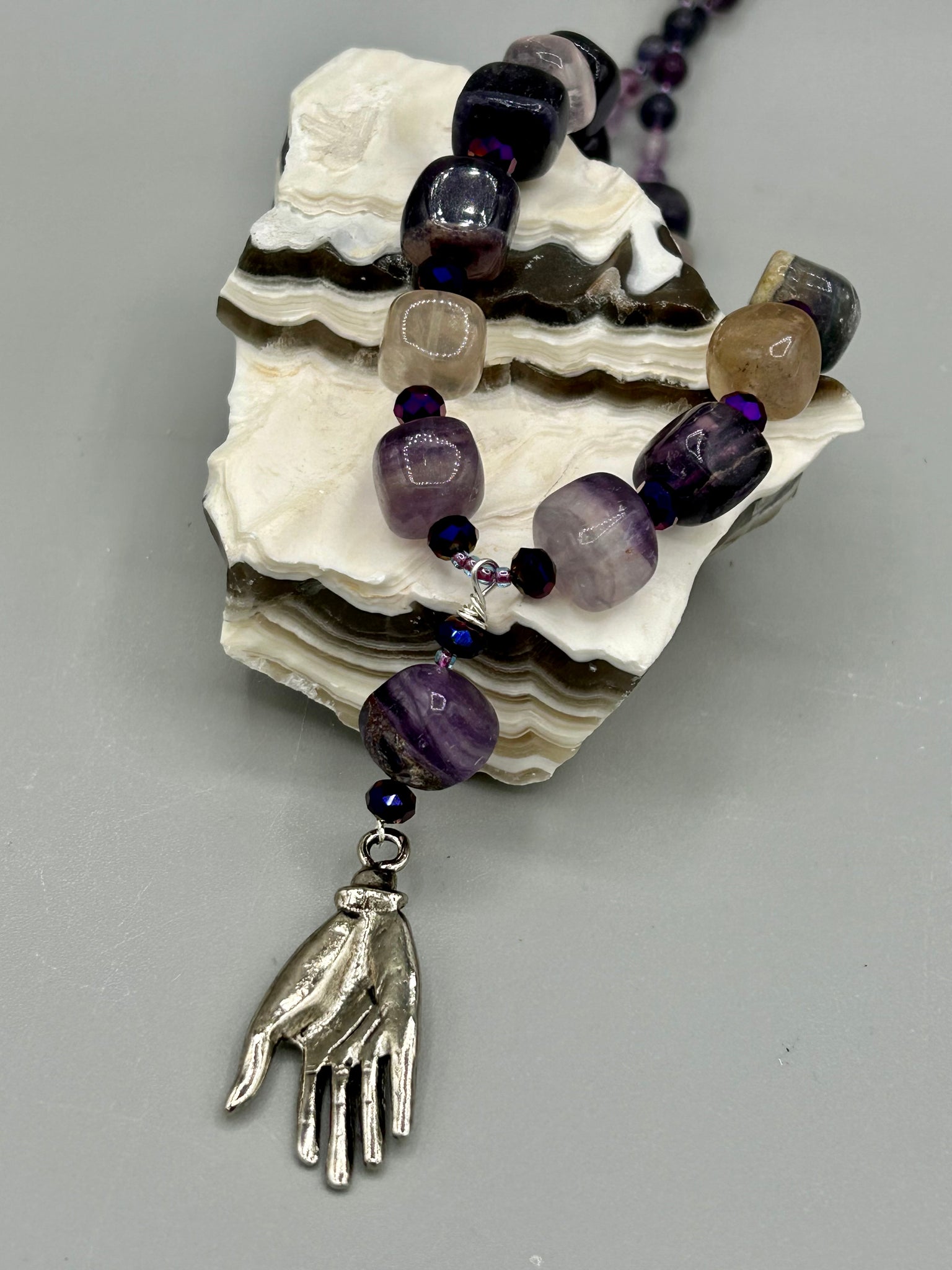 This nature-inspired accessory features an array of unique hues, including rainbow fluorite stone beads and iridescent dark shimmery purple glass beads with hints of gold, blue, pink, and green. The secure hook-eye clasp makes it perfect for day to night wear, allowing you to add a touch of summer to your wardrobe. The necklace is further complemented by a large square-shaped rainbow fluorite bead and a lucky hand charm.