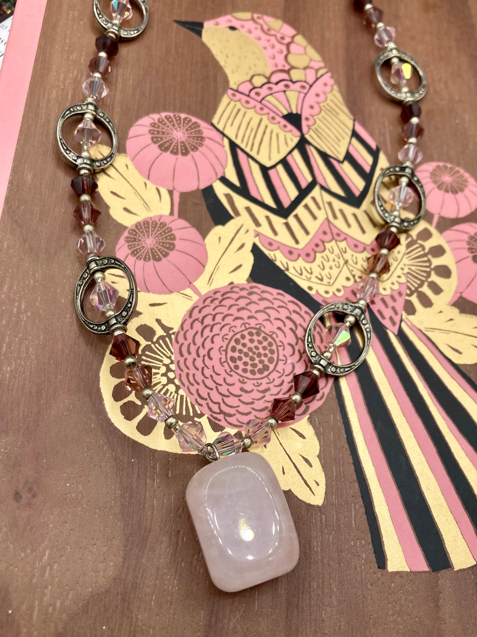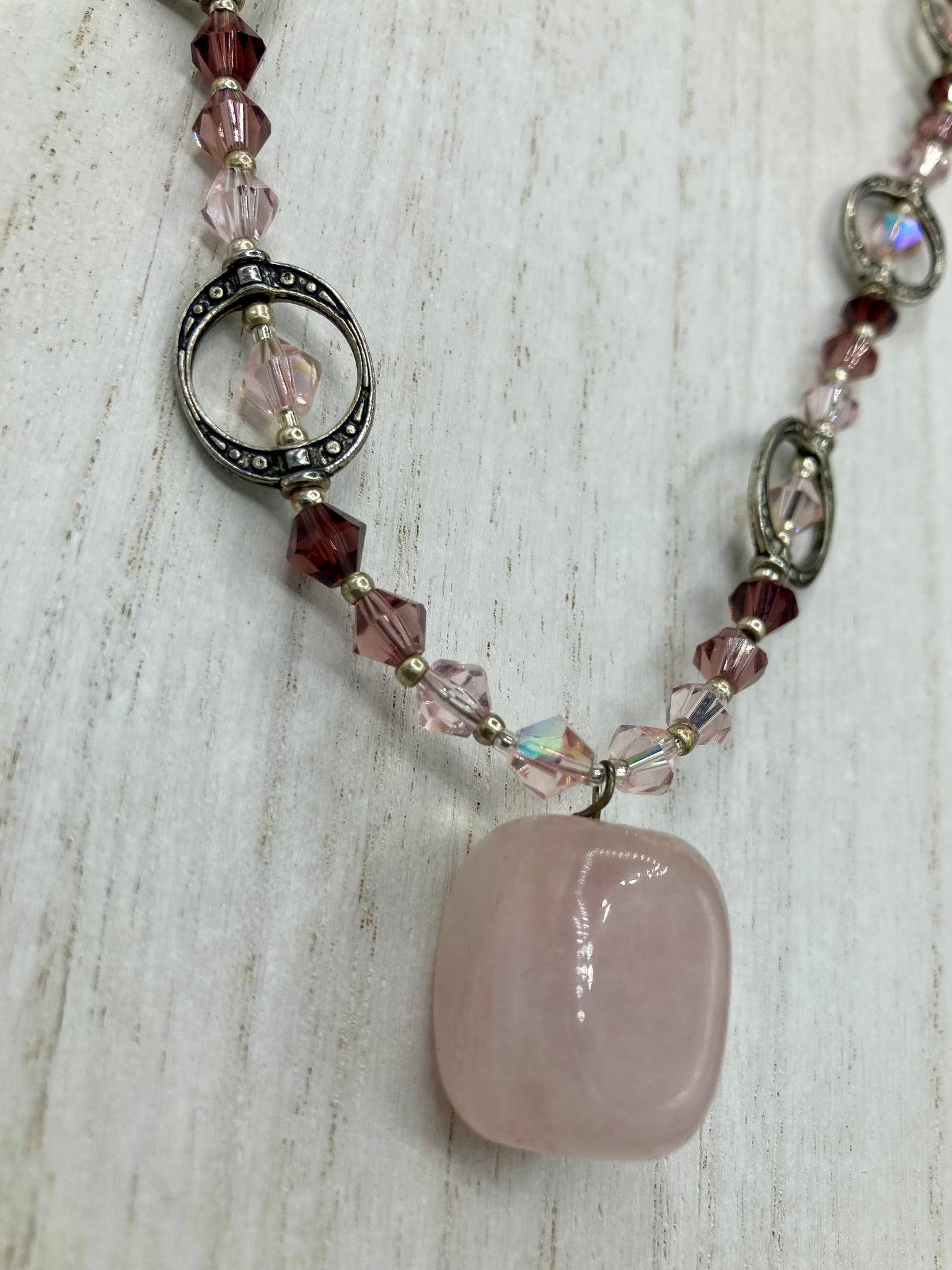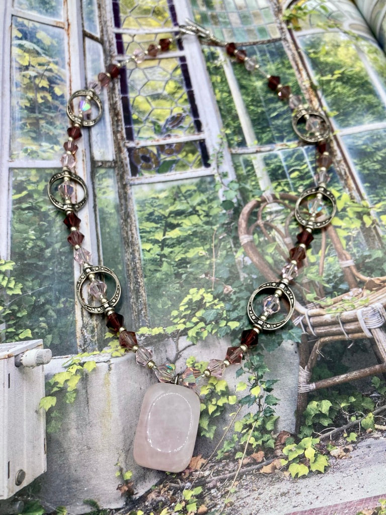 This exquisite necklace features a soft pink Rose Quartz pendant with multi-colored glass beads that transition from iridescent pink, to light purple and darker shades of purple. The sequence of beads complements the Rose Quartz pendant's delicate hue, and is accompanied with a set of subtly-styled matching earrings for a complete look.