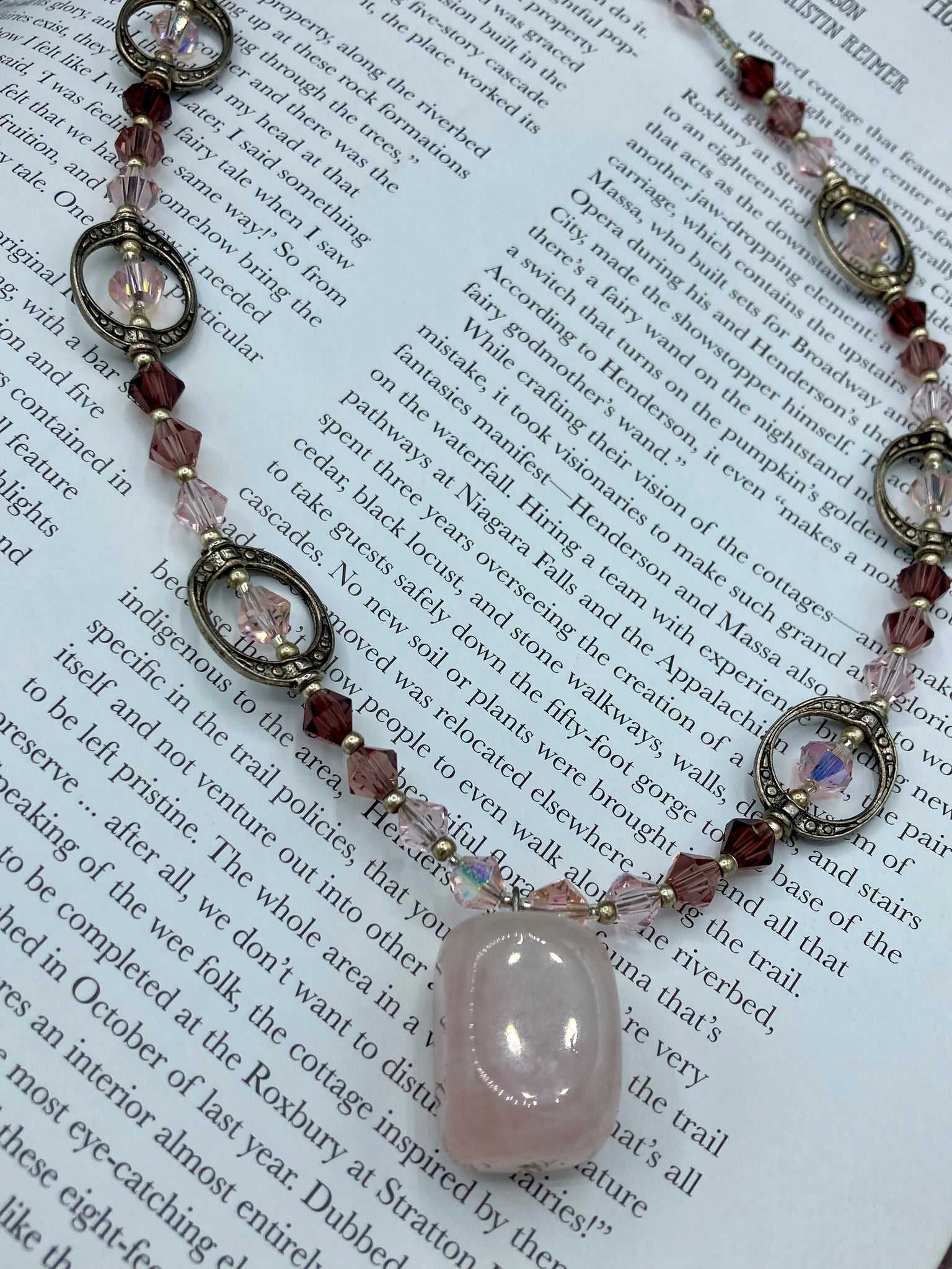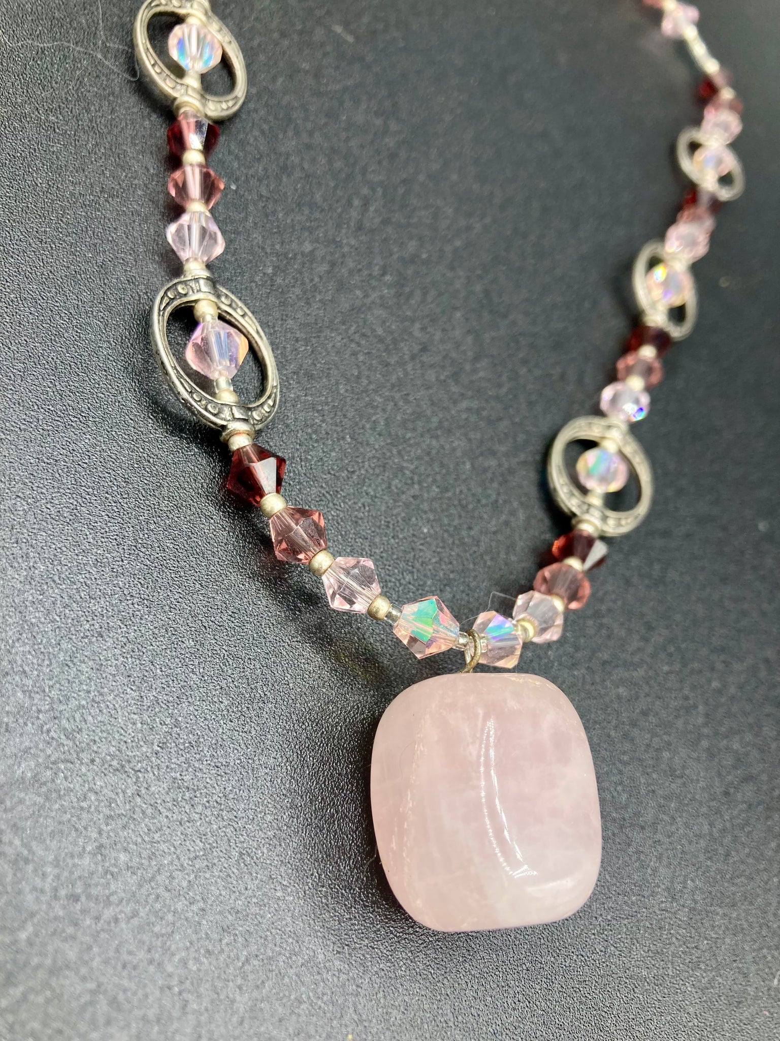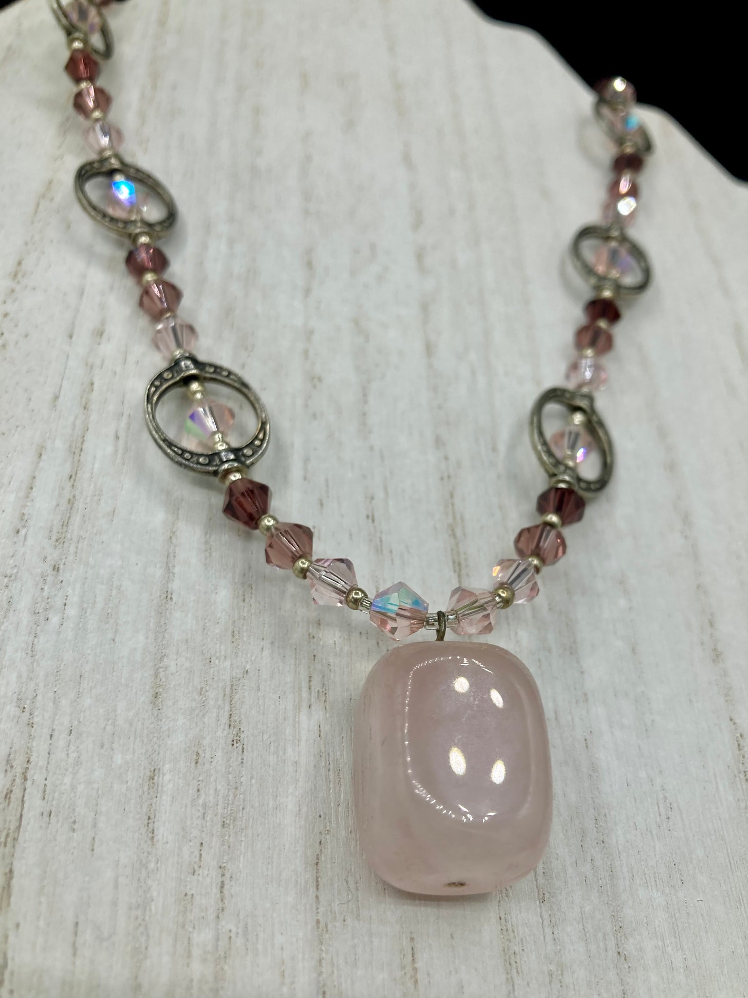 This exquisite necklace features a soft pink Rose Quartz pendant with multi-colored glass beads that transition from iridescent pink, to light purple and darker shades of purple. The sequence of beads complements the Rose Quartz pendant's delicate hue, and is accompanied with a set of subtly-styled matching earrings for a complete look.