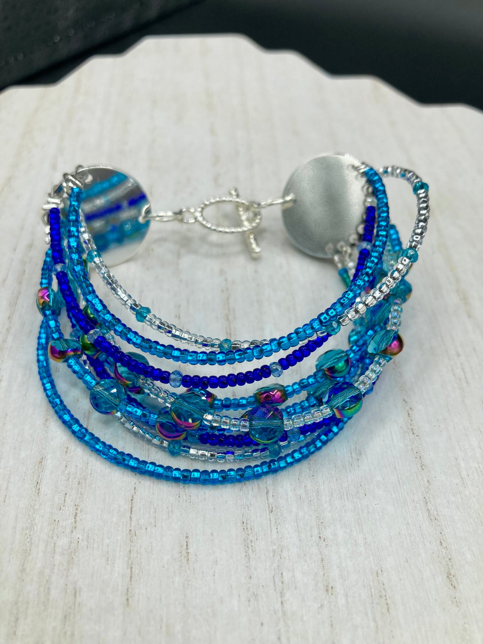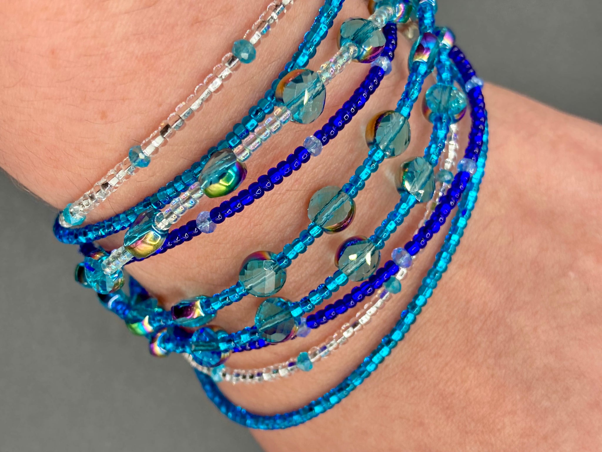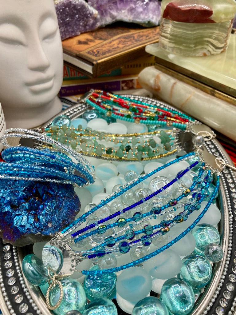 This Ocean Blue Waves Nine Stands Glass Beaded Chunky Wide Bracelet is the ideal accessory for any summer seaside look. Measurements: 8" in length