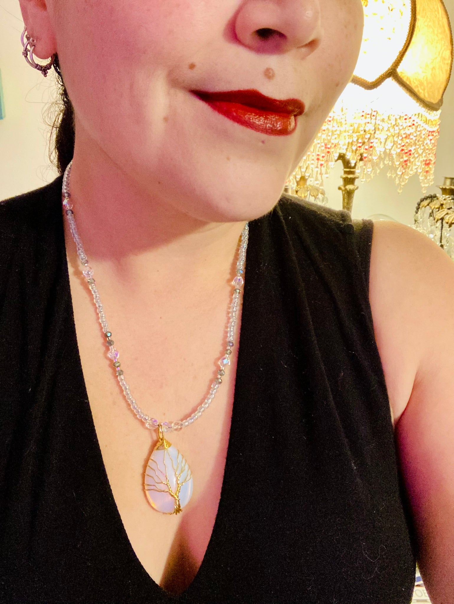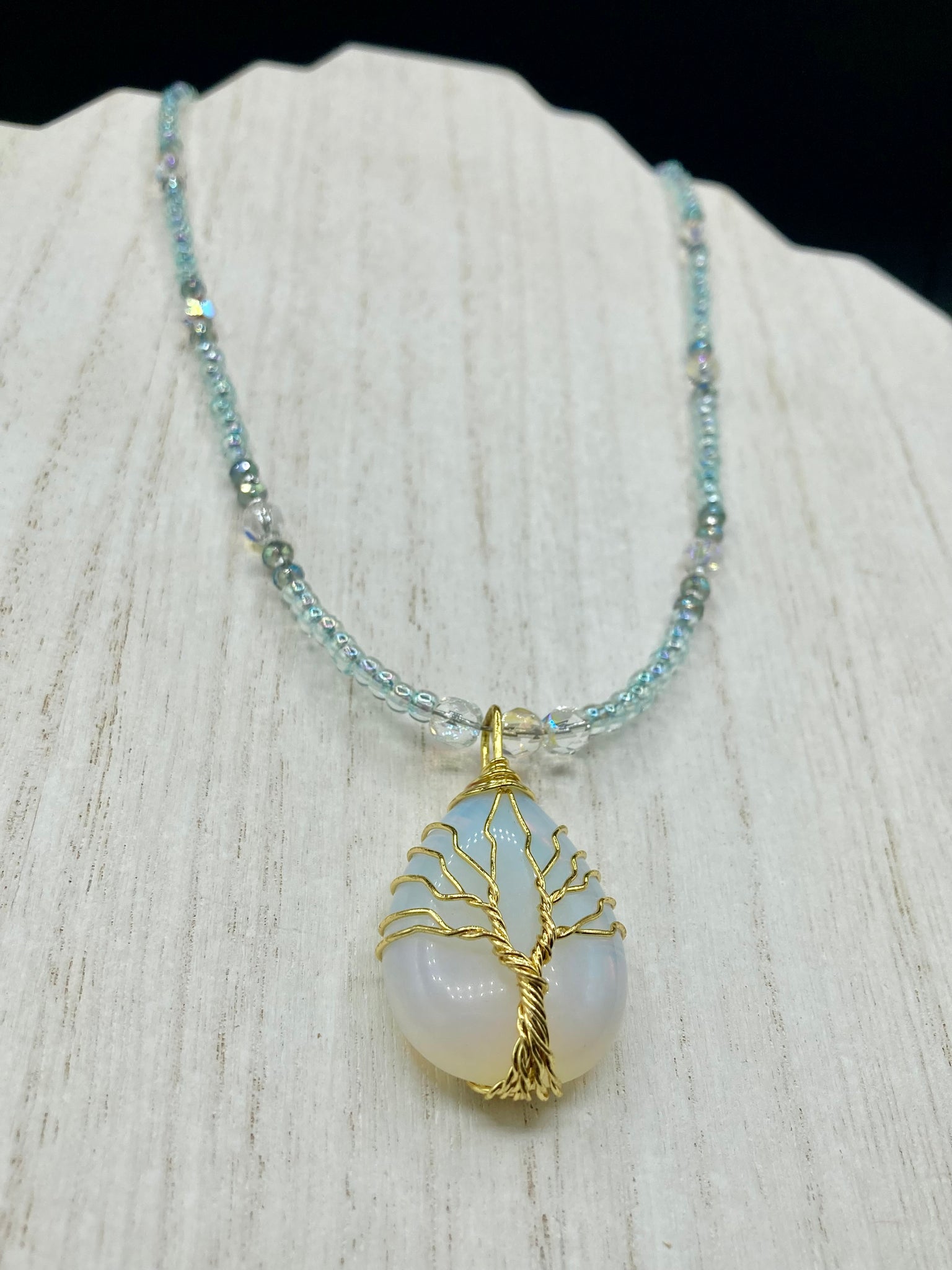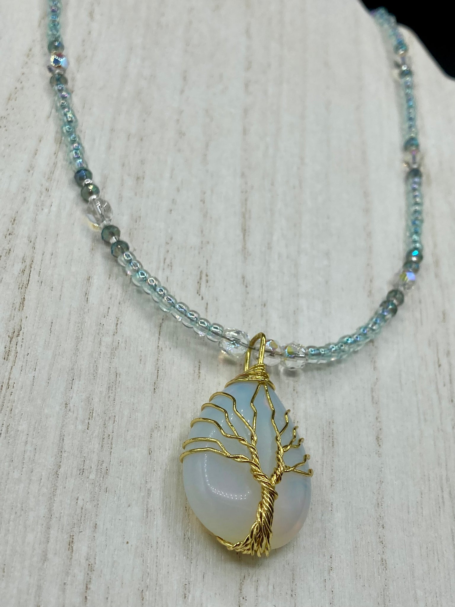 This opalite stone pendant with its shimmering hues of blue, gold, and pink is inspired by the whimsical beauty of nature. I created a beaded necklace using iridescent glass beads with the same colors of blue, gold, and pink to enhance the look of the Vibrant Tree Of Life Opalite Wired Stone Pendant.