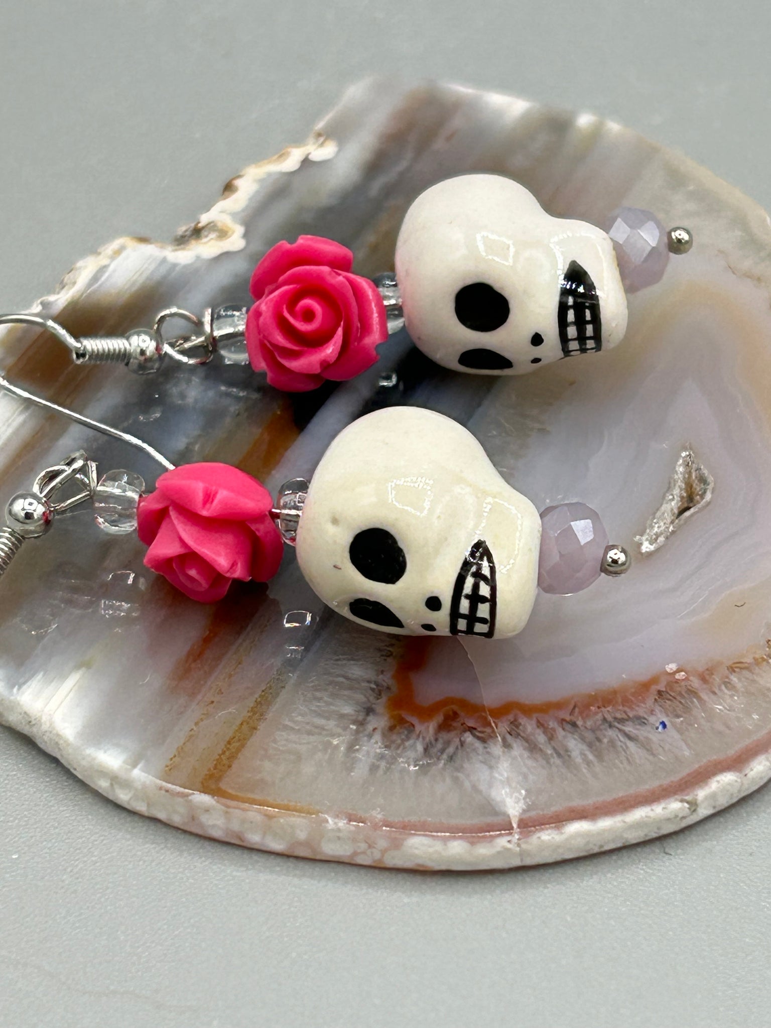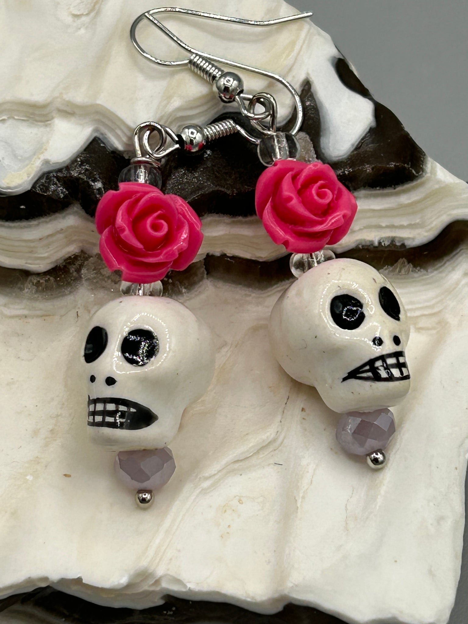 Peruvian off white ceramic skull beads come with quartzite pink floral rose beads. These stylish skull earrings are perfect for adding a unique flair to any outfit. Whether you're looking for a Dia De Los Muertos accessory or simply looking to draw inspiration, these goth pieces perfectly capture the vampire goth, witchy, dark, Chingona Cabrona, Latina Chicana styles.