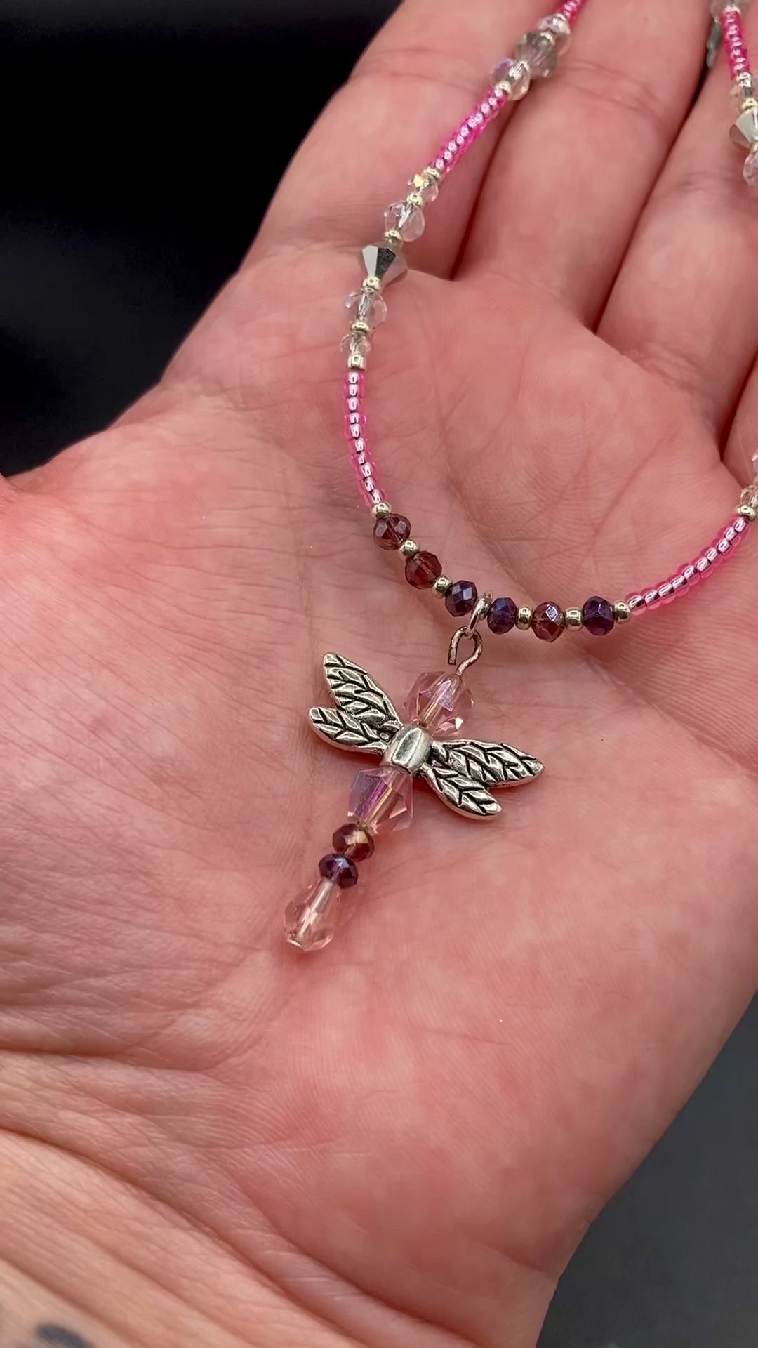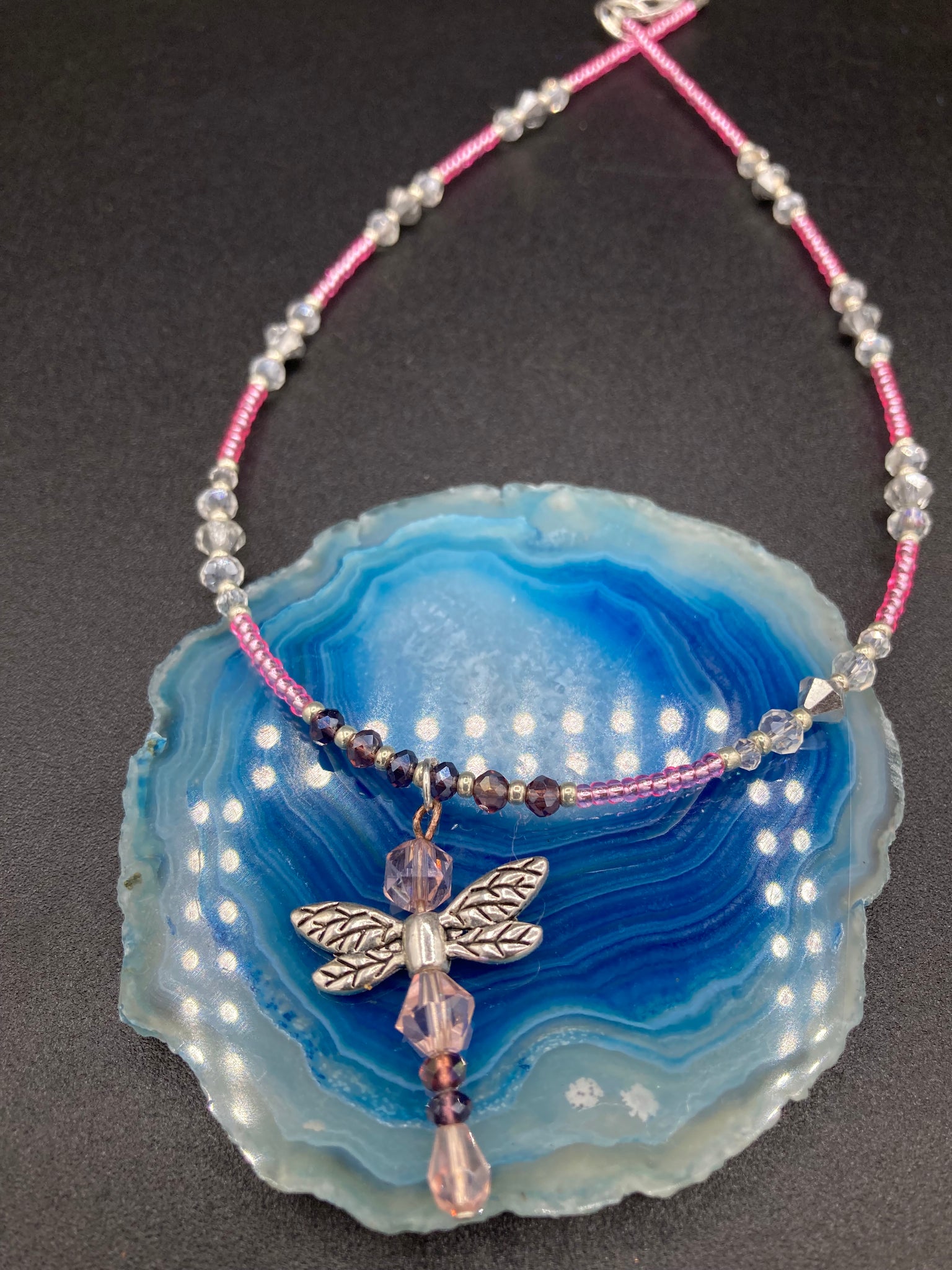 This softy pink and purple choker style necklace with a silver dragonfly pendant is perfect for nature lovers. Glass beads make the necklace adjustable, and it comes with matching dragonfly earrings for a truly magical, fairy princess look. An ideal accessory for summer.