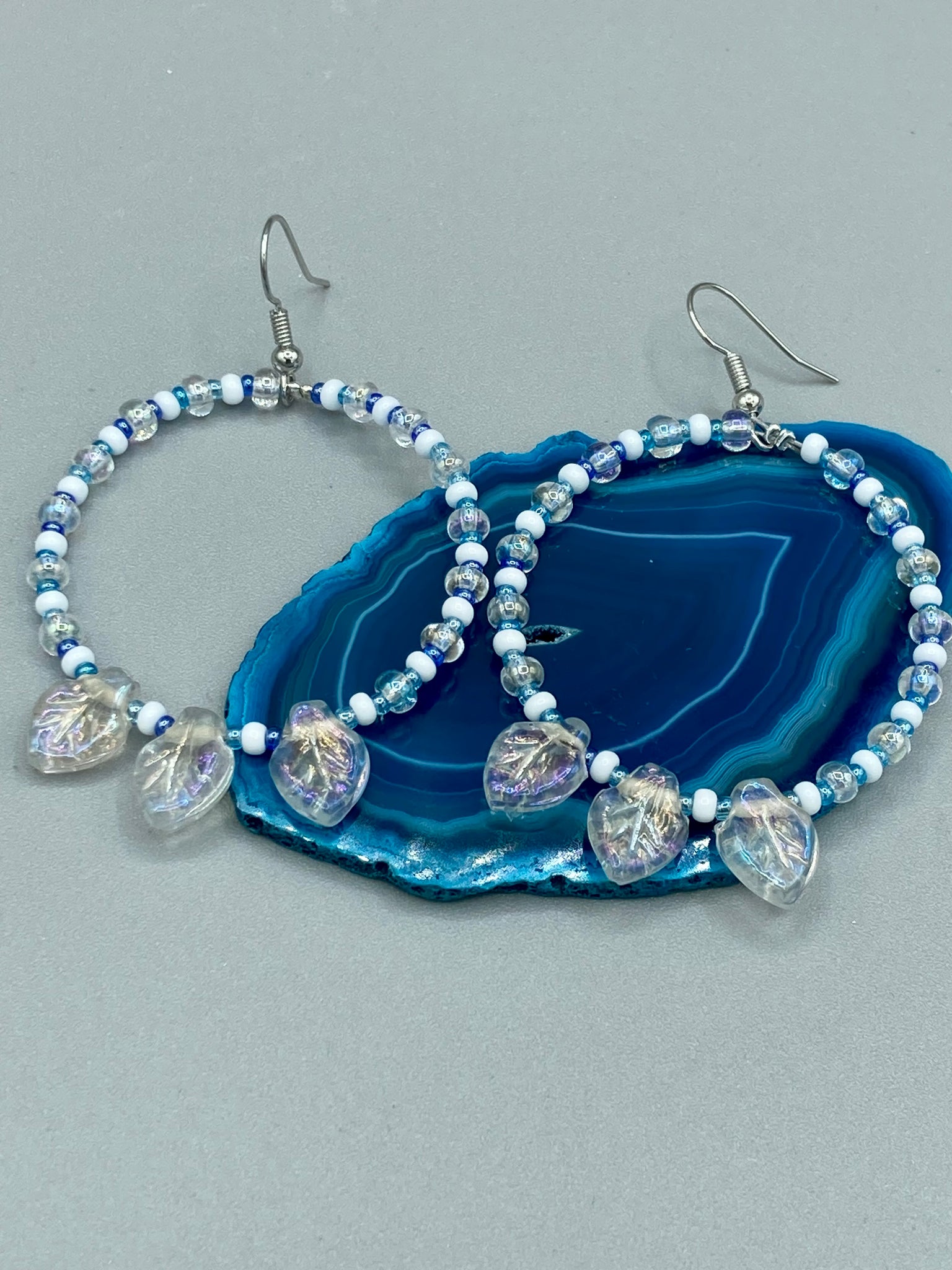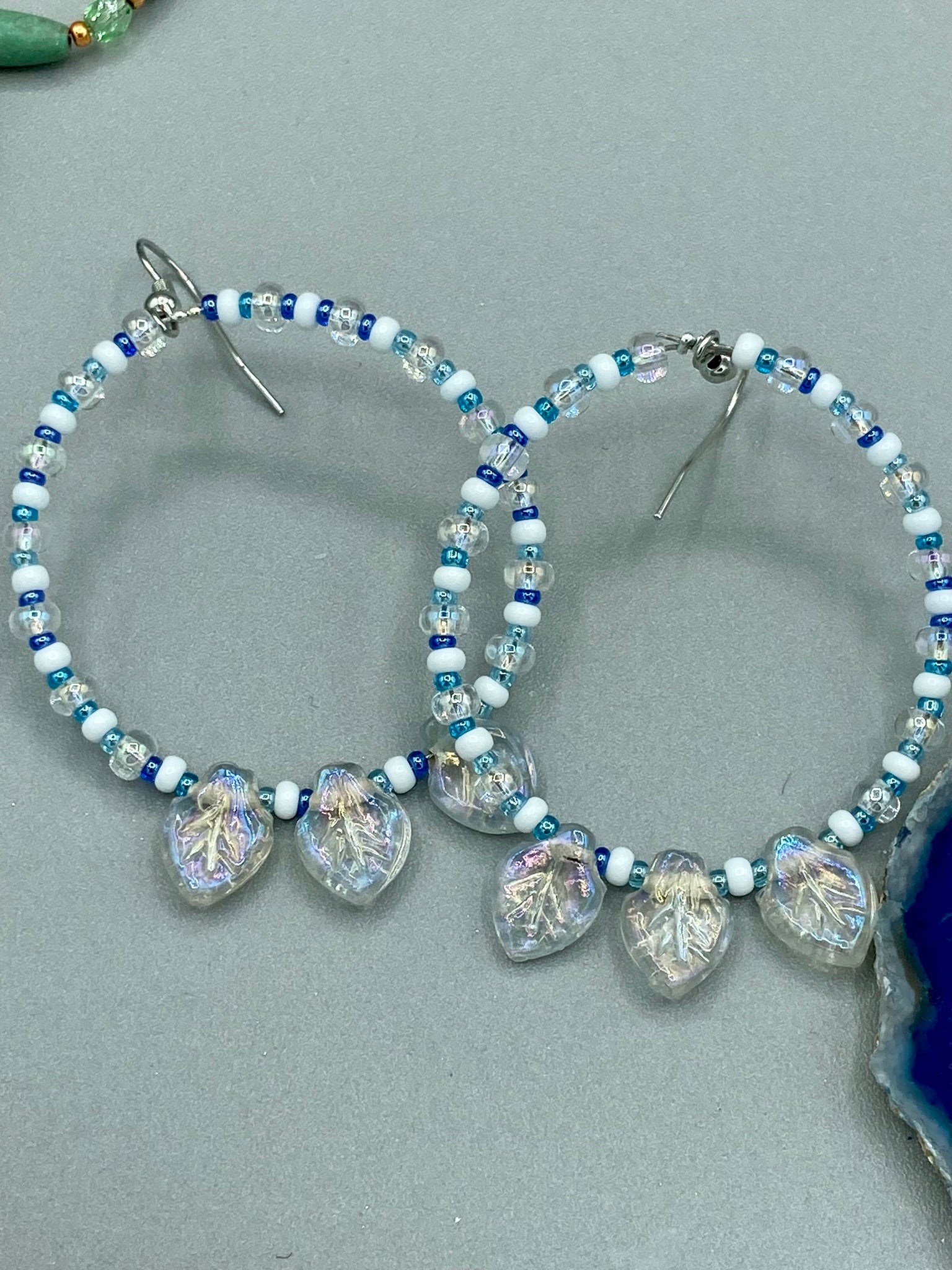 These Pressed Glass Leaf Beaded Hoop Earrings are perfect for a shabby chic, bohemian, or hippie vibe. The iridescent glass beads give off a soft and glamorous sparkle, while the clear glass charms have a shimmer finish with hints of gold, purple, blue and pink. They are the perfect nature-inspired accessory.