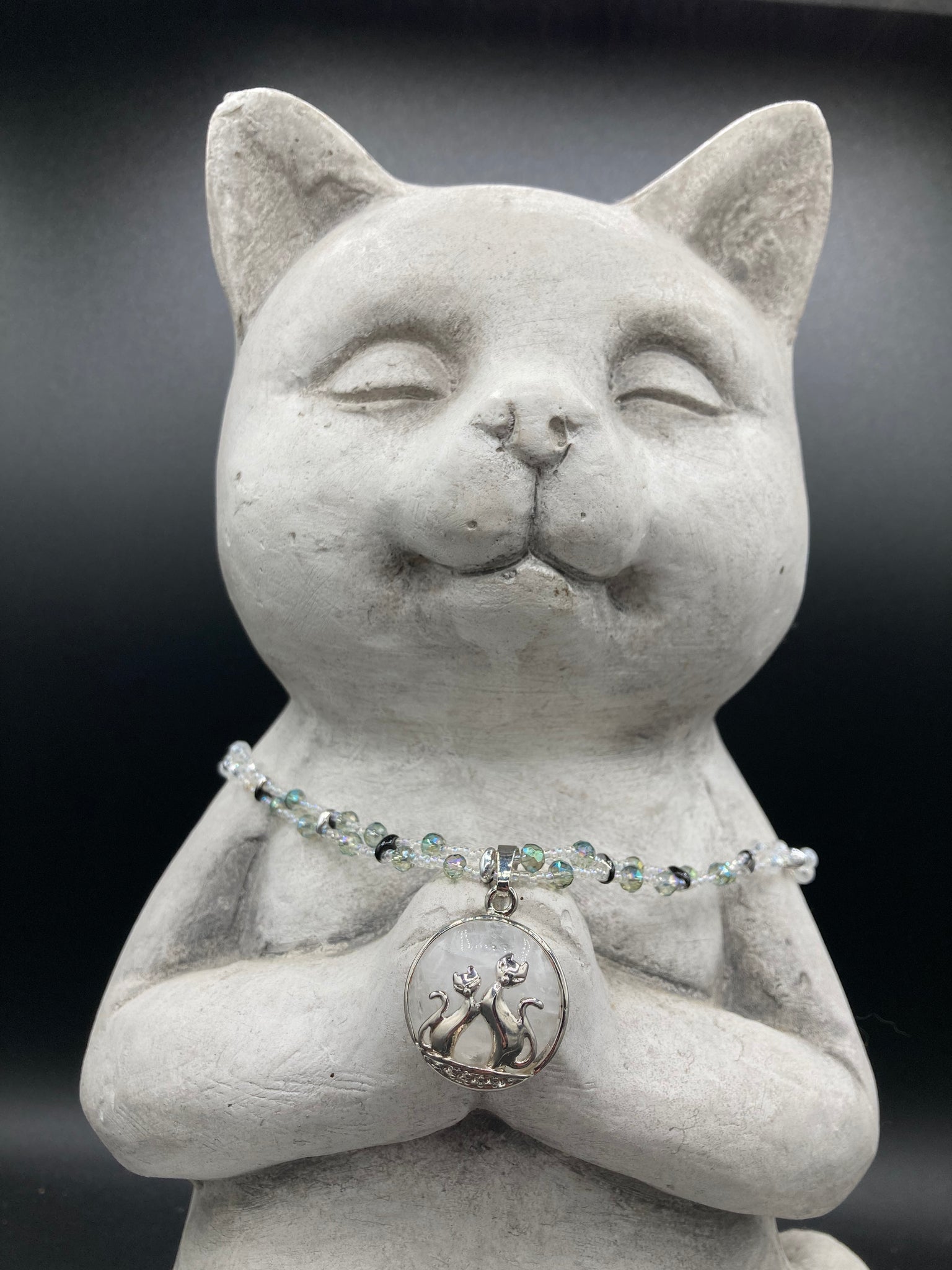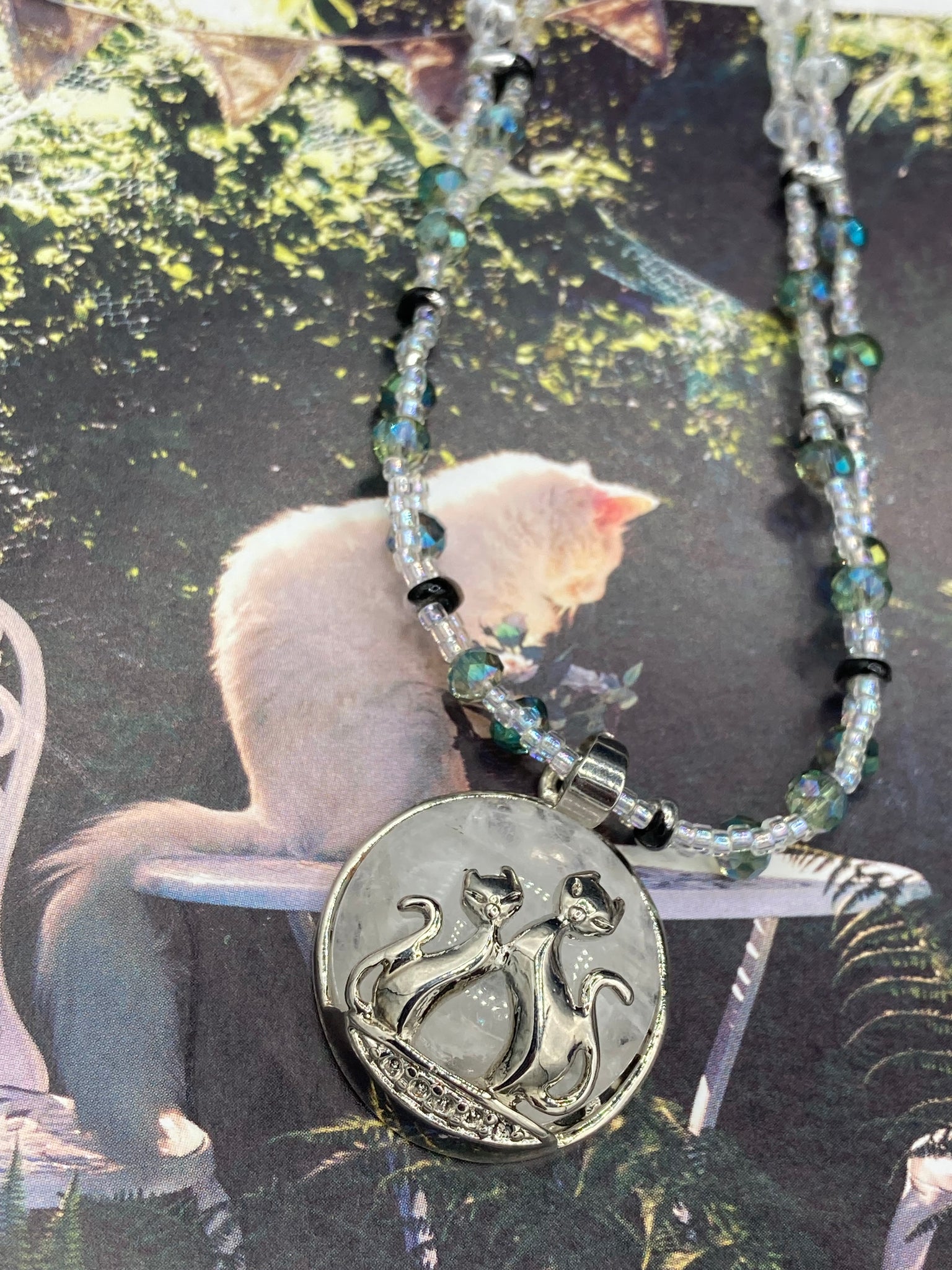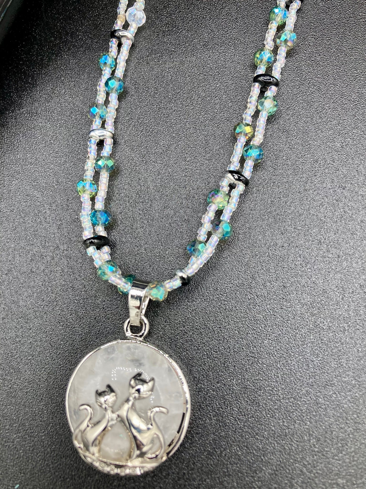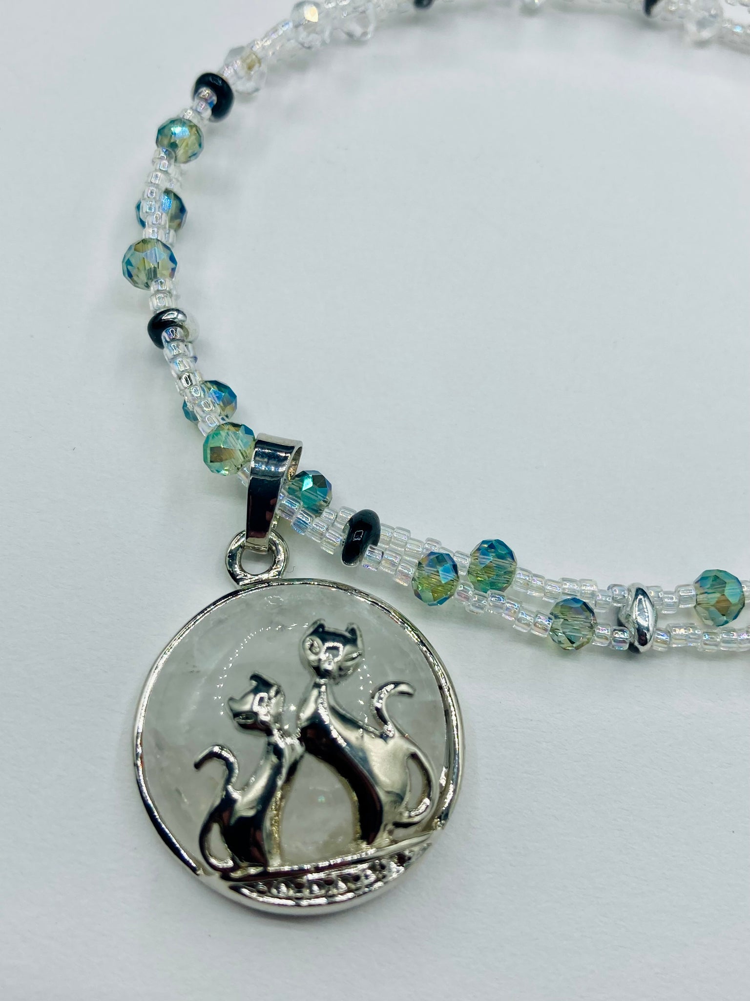 This stylish necklace features a shimmery sterling silver quartz pendant with cats and stars, making it the perfect accessory for any cat lover. With two-hole silver and black beads that stand out against the light aquamarine glass beads, this double strand necklace holds a round kitty pendant made with various hues of clear and iridescent glass beads. Add a touch of purrfection to your look with this statement piece.