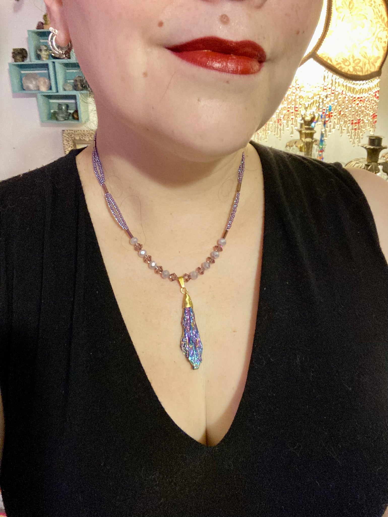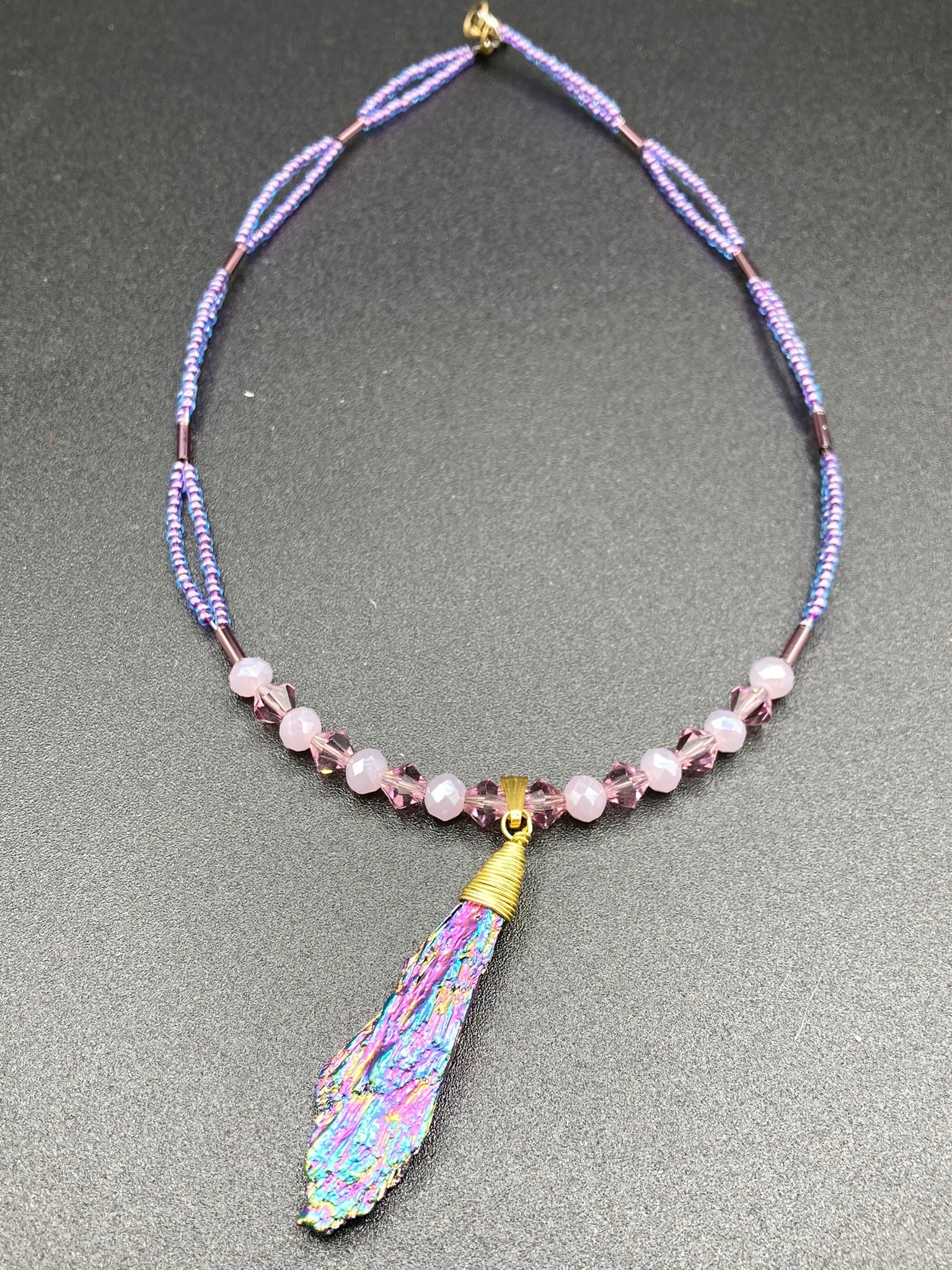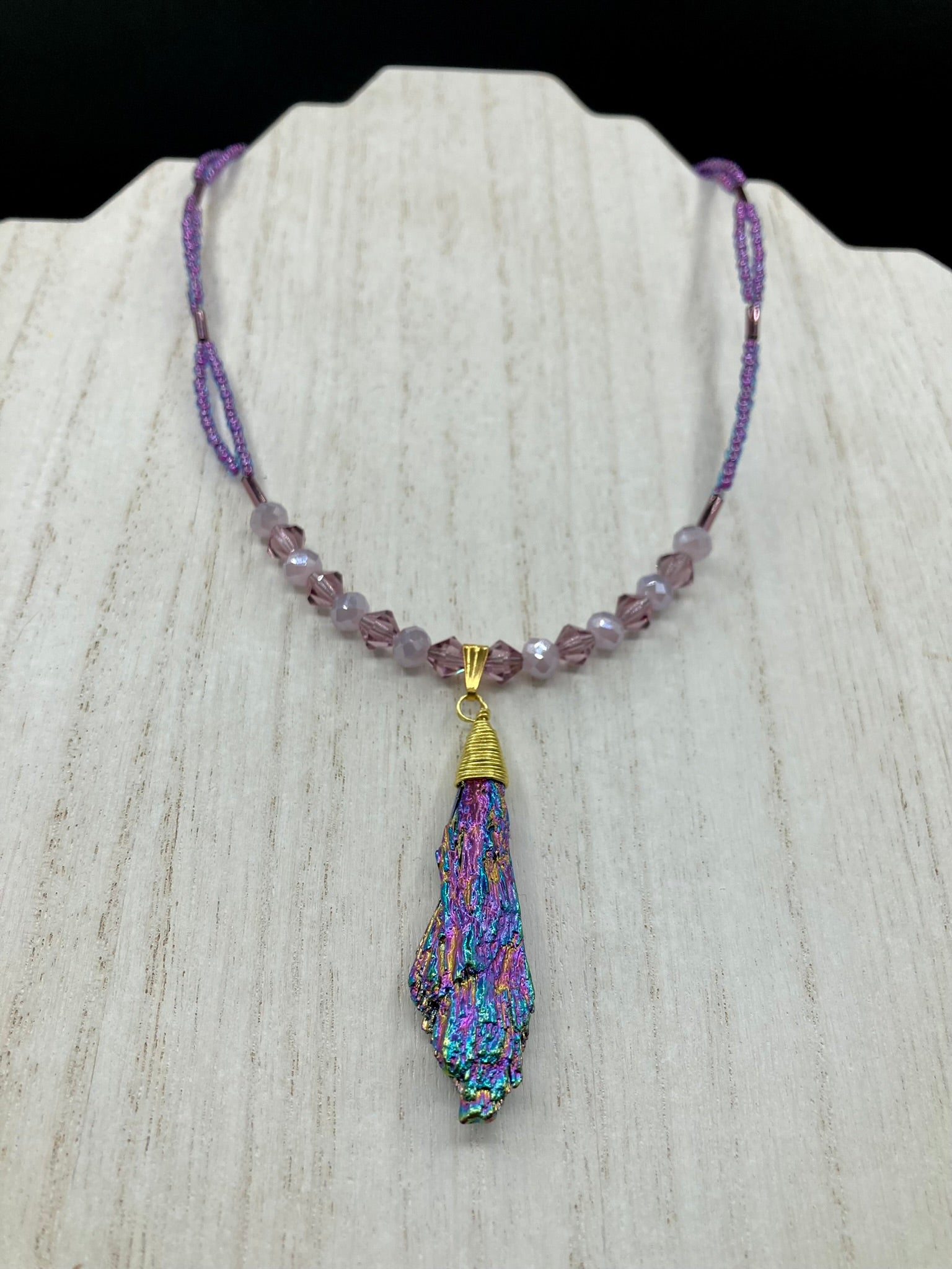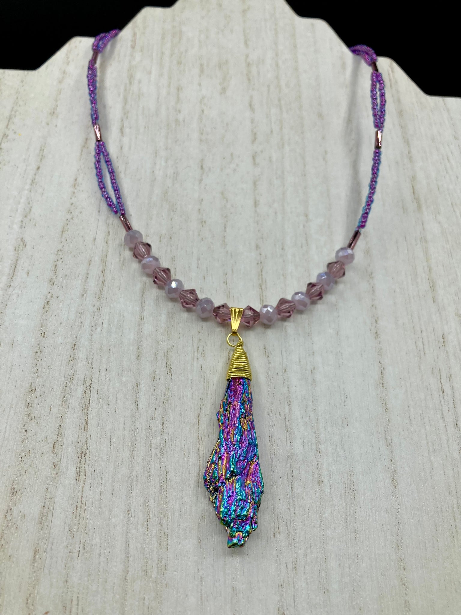 This Rainbow Kyanite Wired Stone Pendant features two strands of glass bead necklaces with a dazzling spectrum of colors, including purple, pink, gold, blue, and green. This bold piece of jewelry is guaranteed to add an eye-catching touch to any collection.