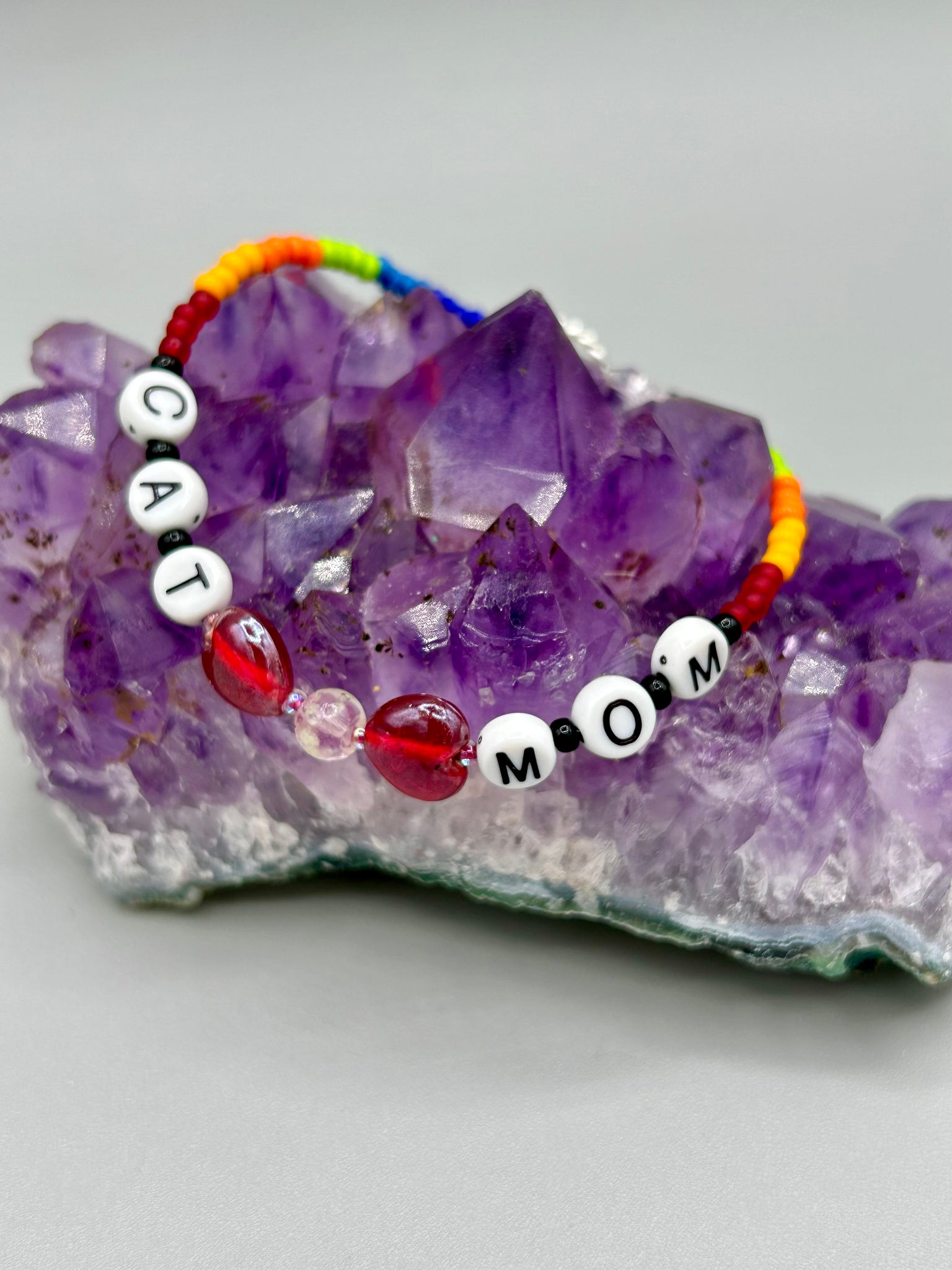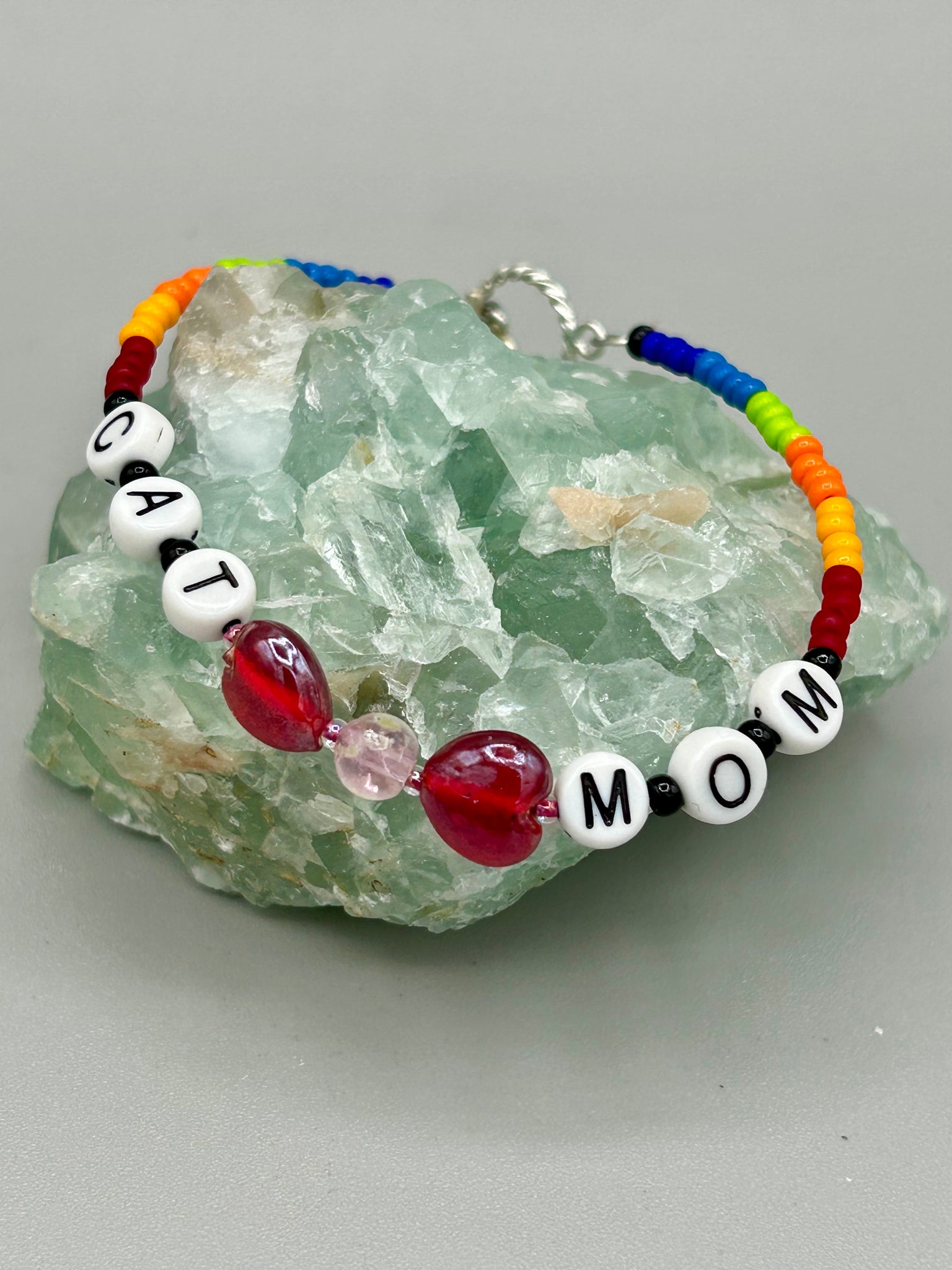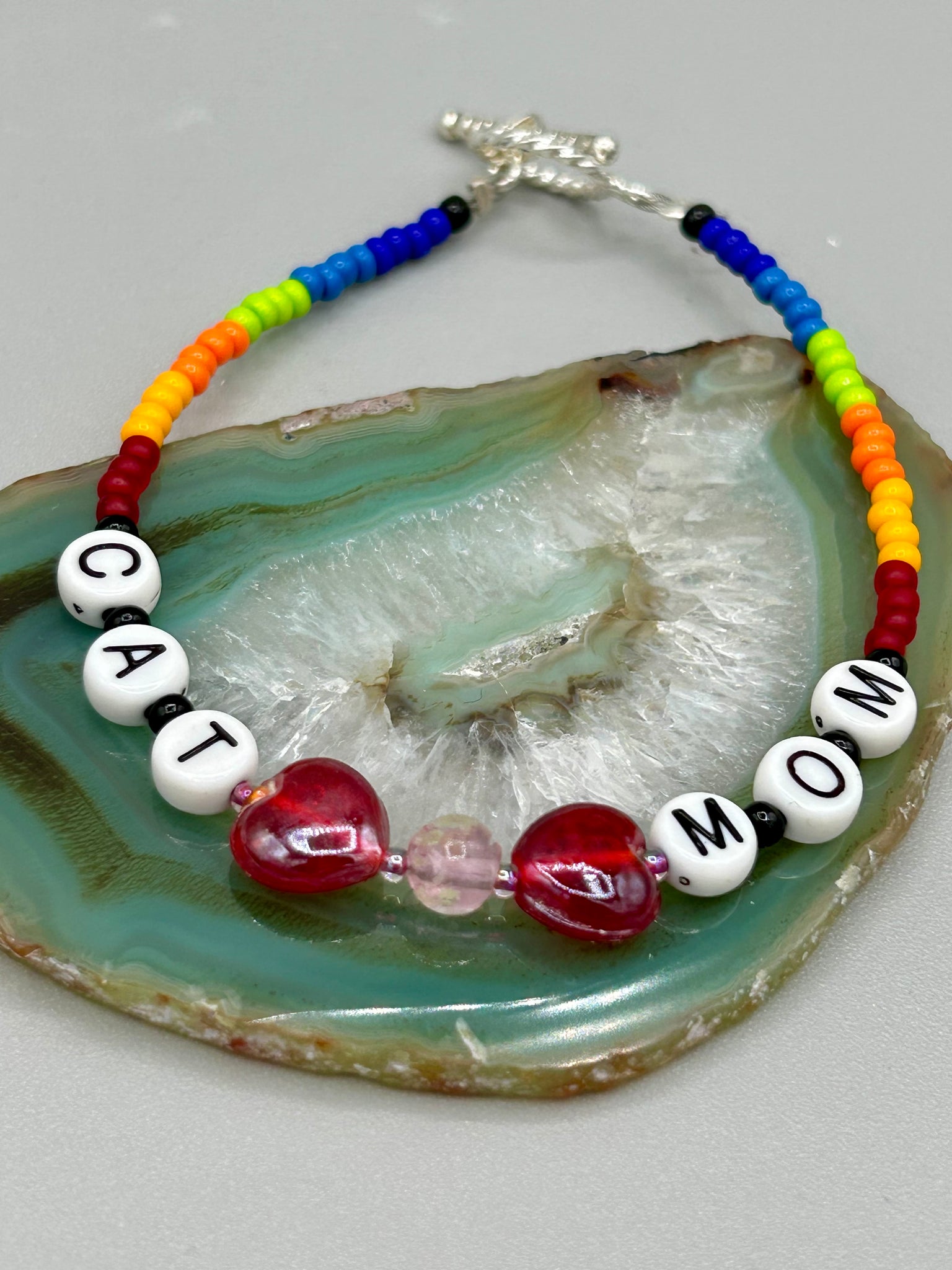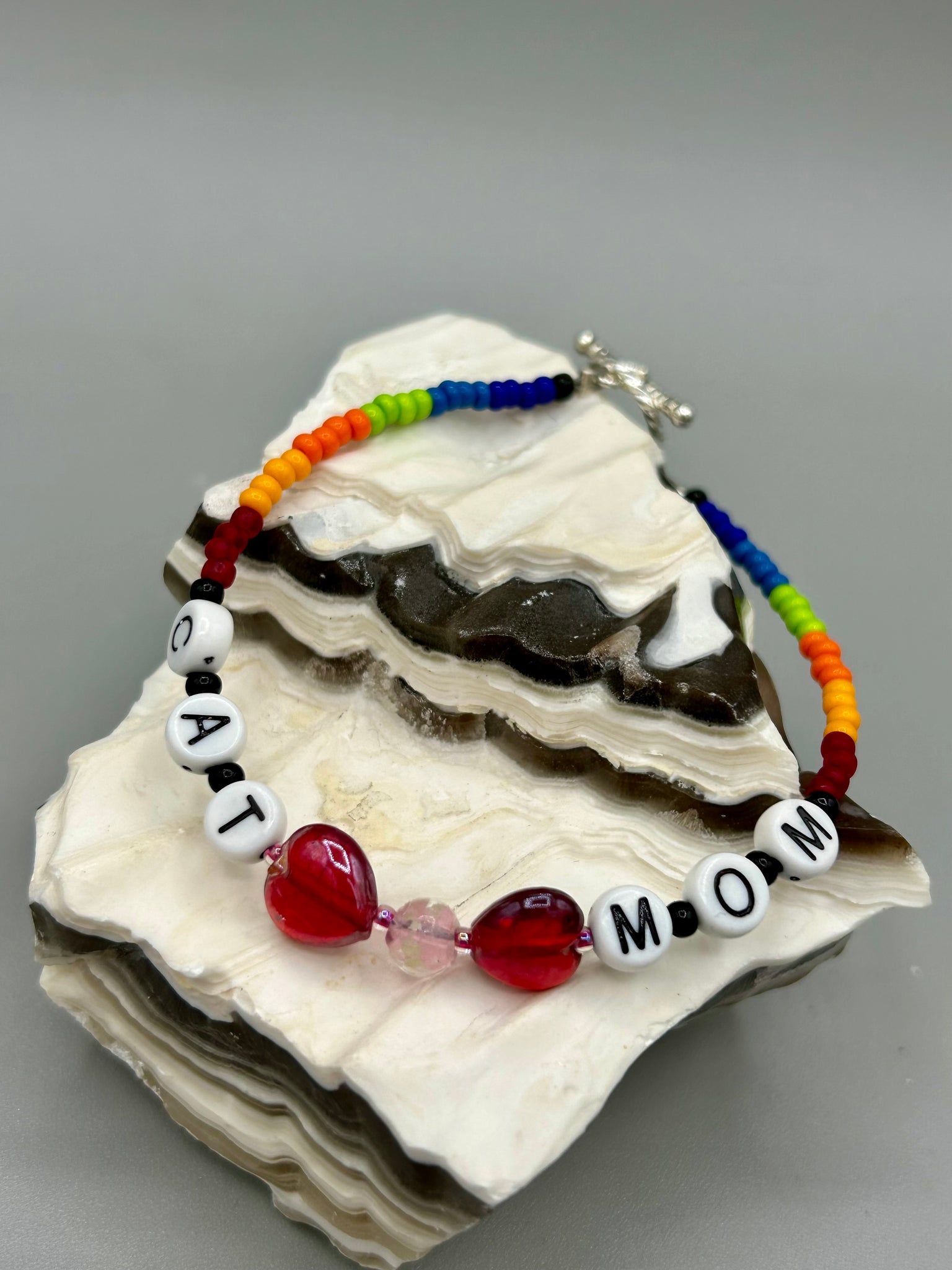 Rainbow stripped glass hook-eye claps. Cat Mom bracelet comes with heart shaped glass beads and one glow in the dark pink bead. Metal wire with toggle and hook-eye clasp.