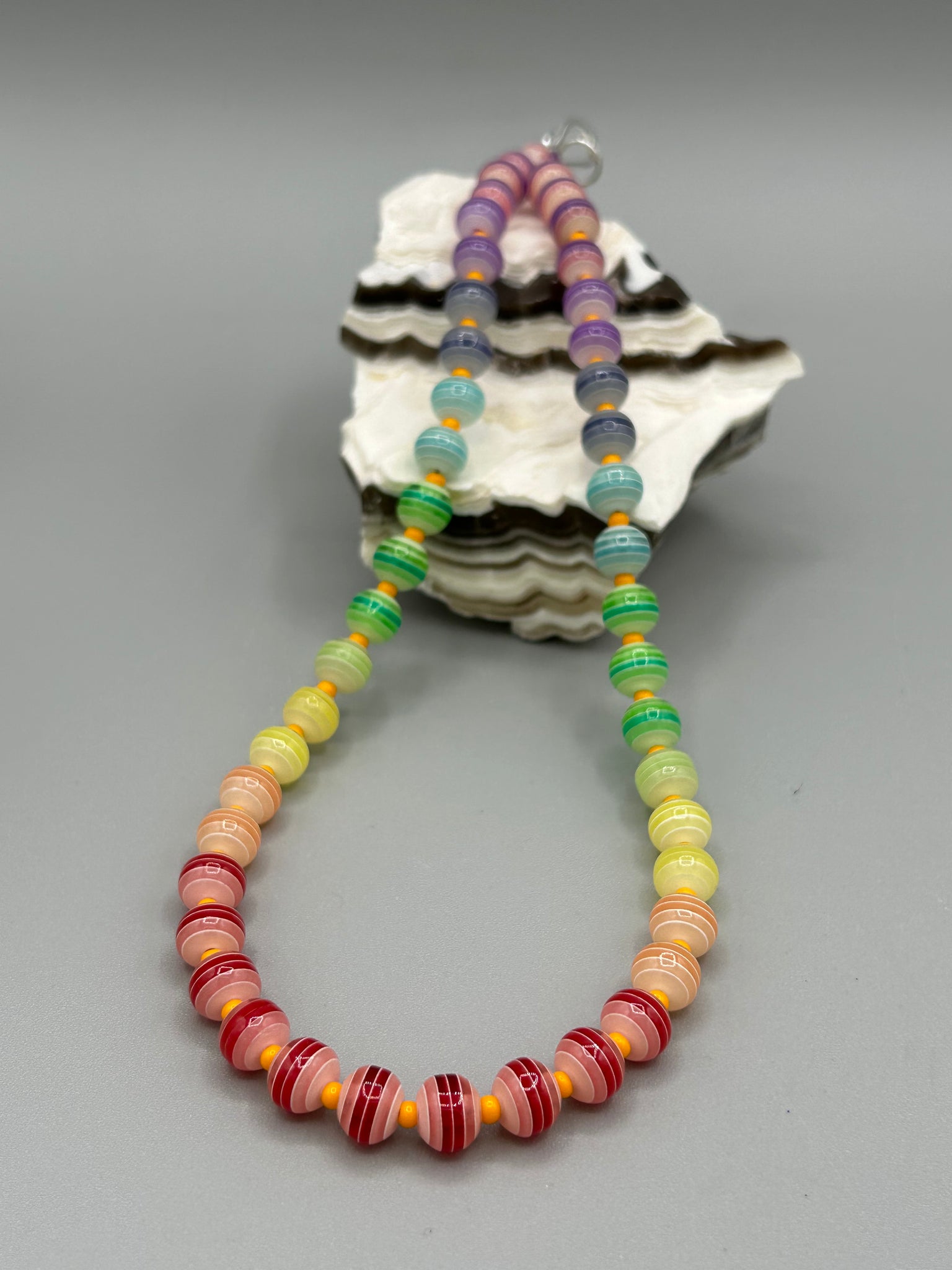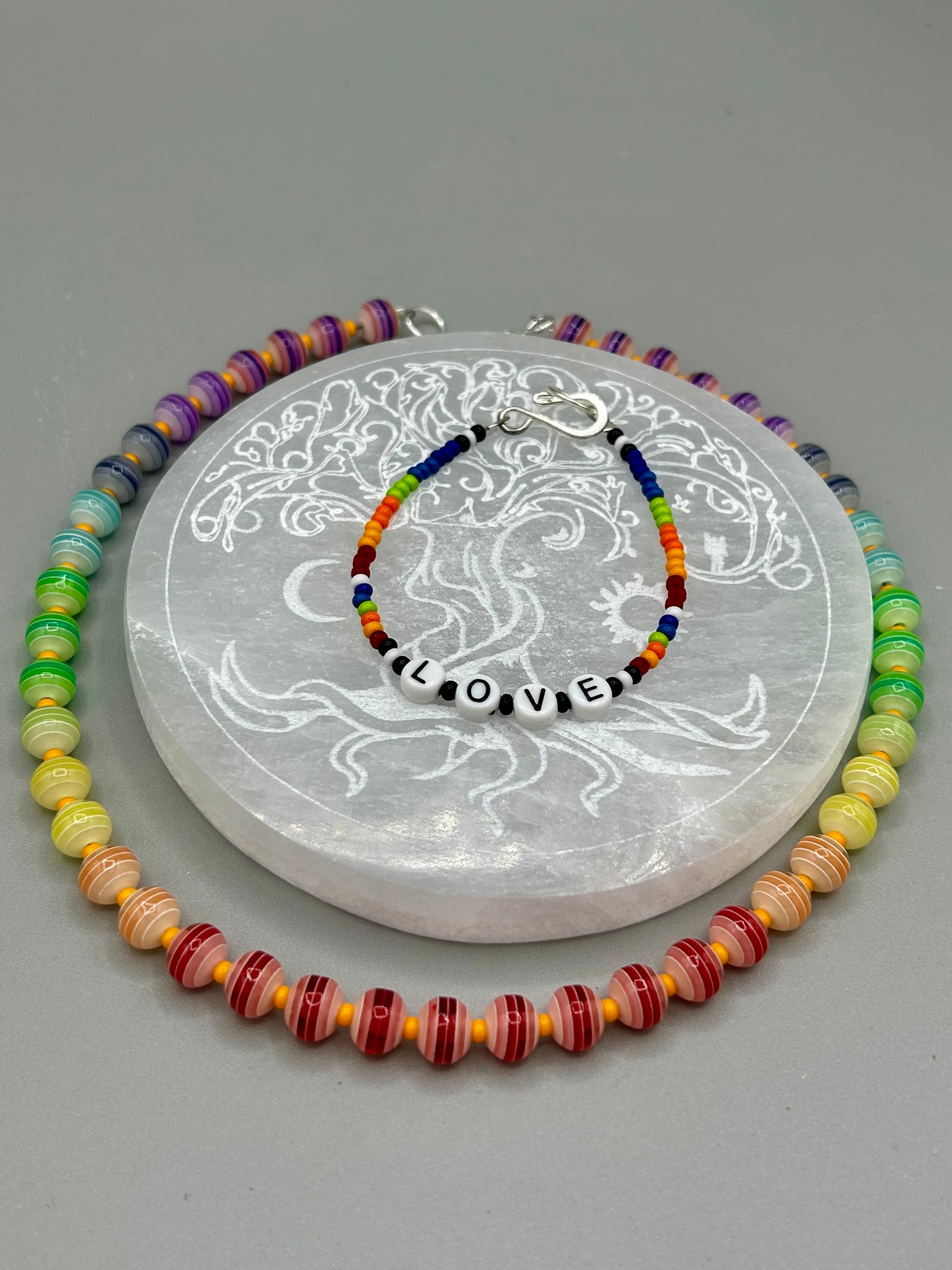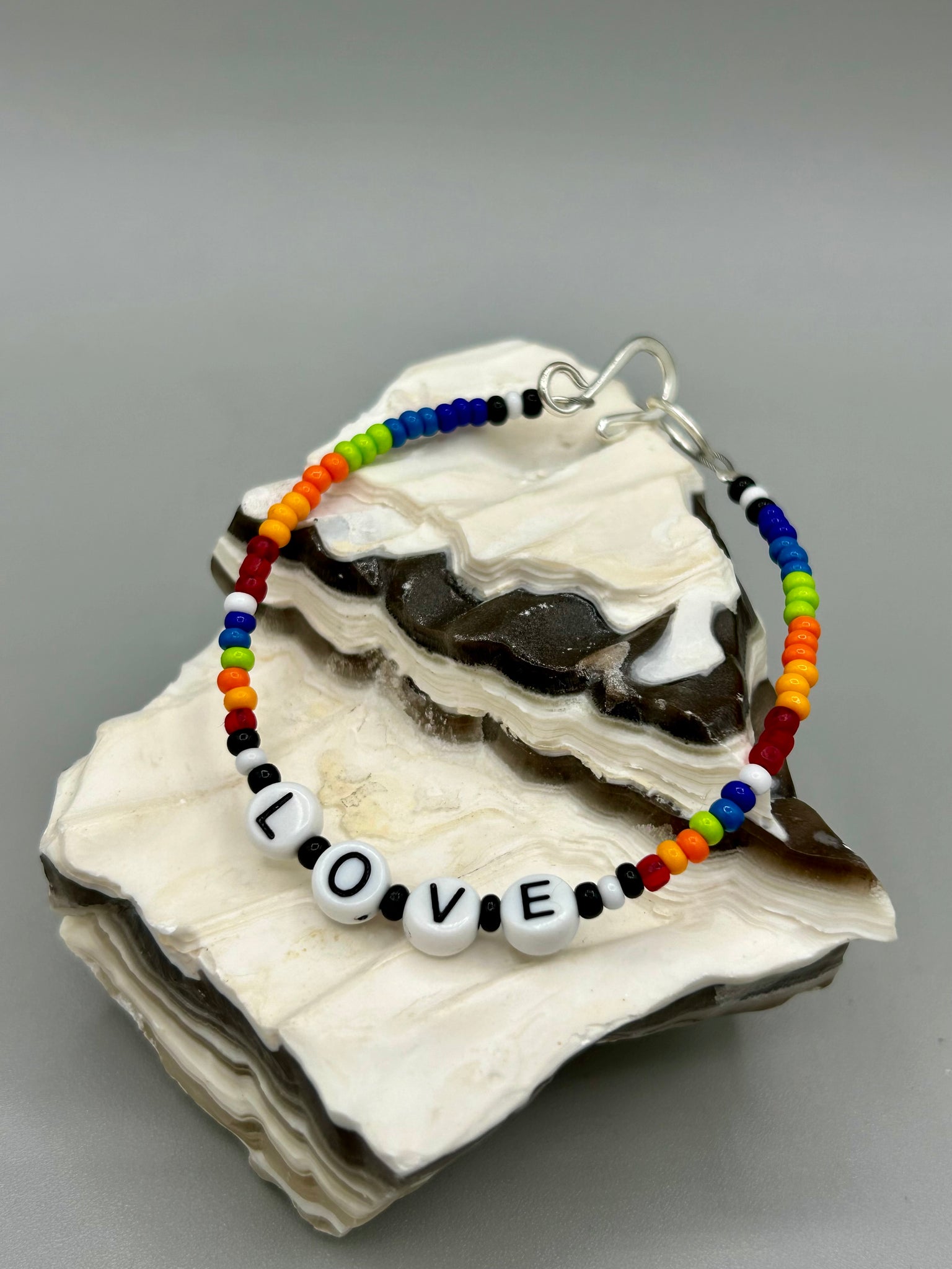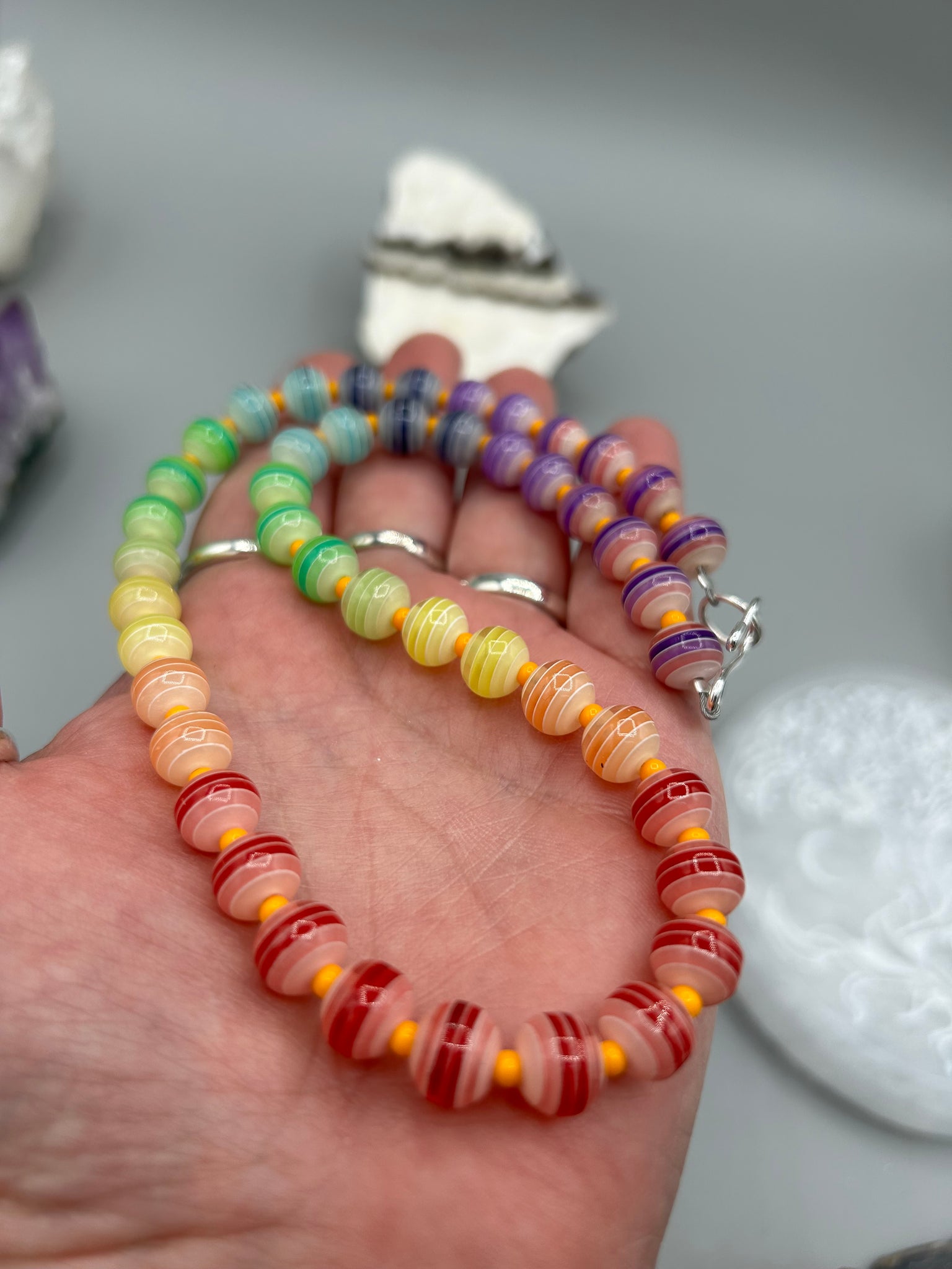 Rainbow stripped glass hook-eye claps. Cat Mom bracelet comes with heart shaped glass beads and one glow in the dark pink bead. Metal wire with toggle and hook-eye clasp.