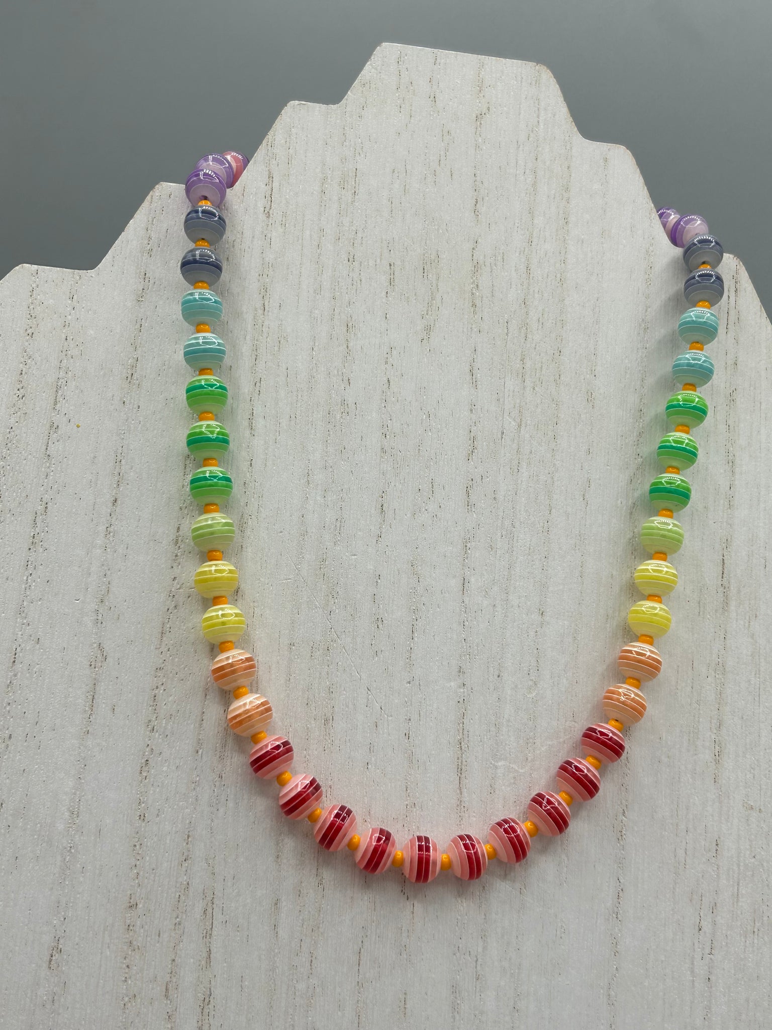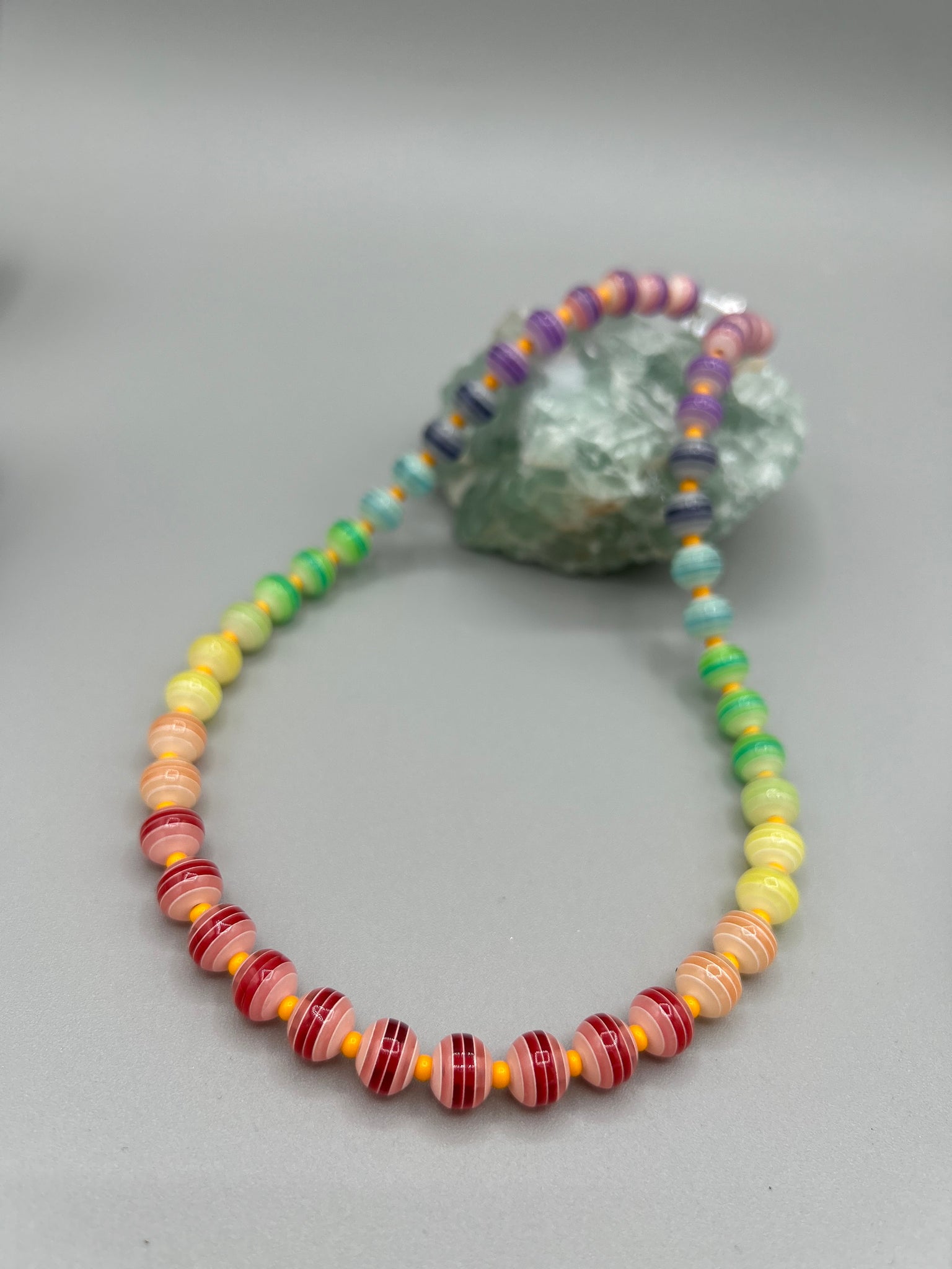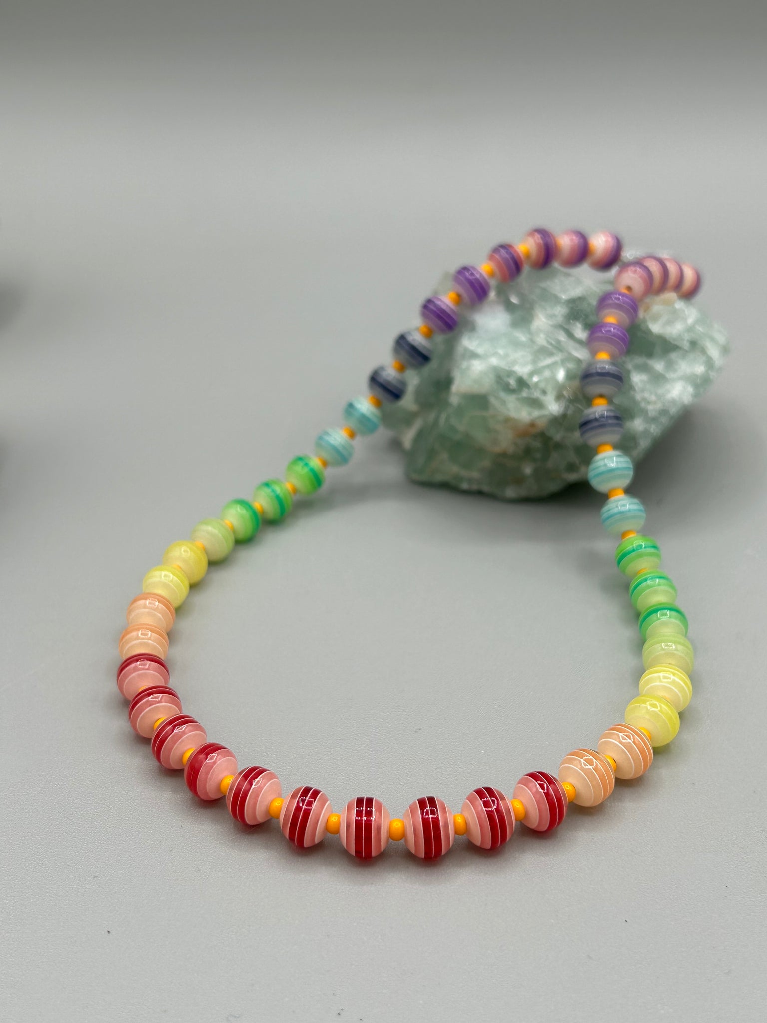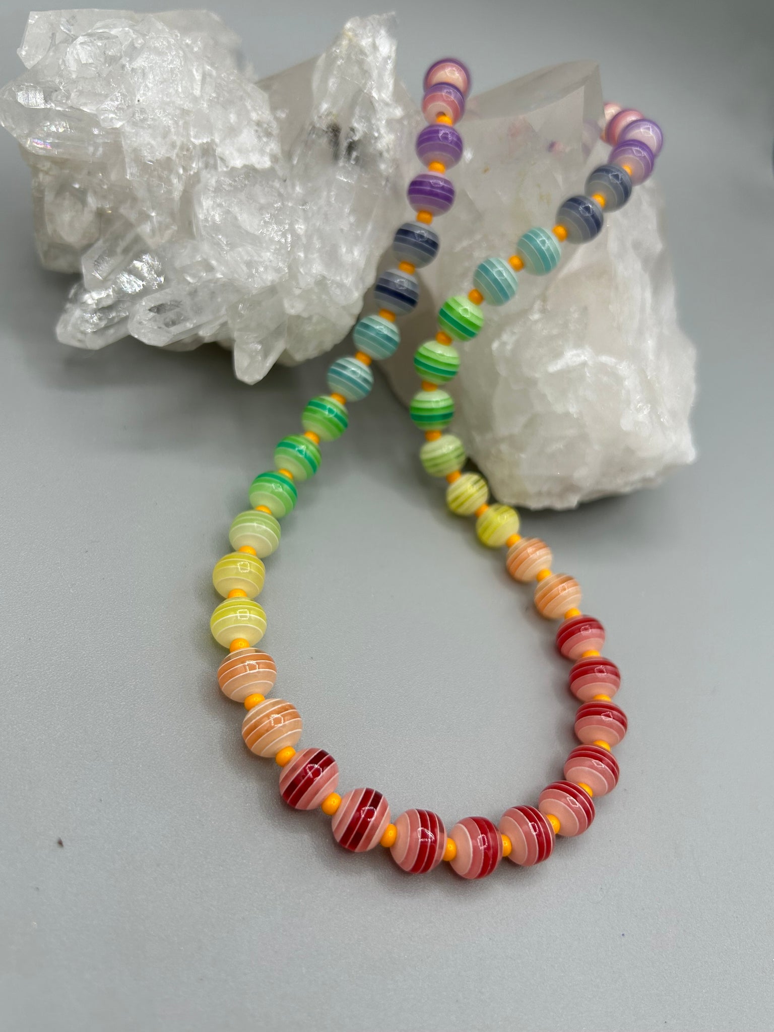 Rainbow stripped glass hook-eye claps. Cat Mom bracelet comes with heart shaped glass beads and one glow in the dark pink bead. Metal wire with toggle and hook-eye clasp.