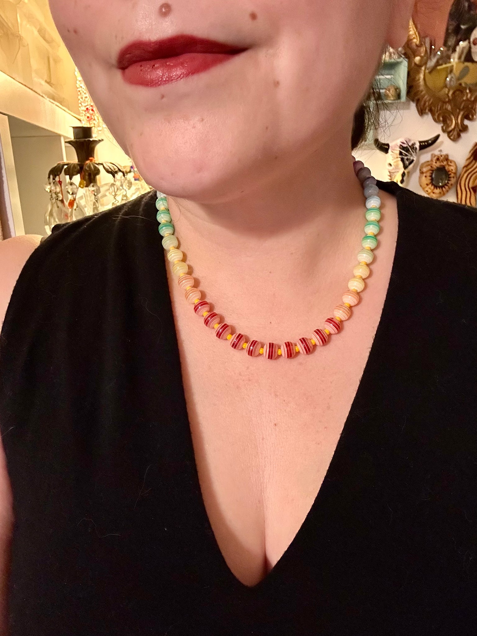 Due to small glass beads in between larger beads, make sure you hang your necklace to retain its shape. One of a kind jewelry, I do not duplicate designs exactly like each other. Dark, beautiful, unique gift for the bold.