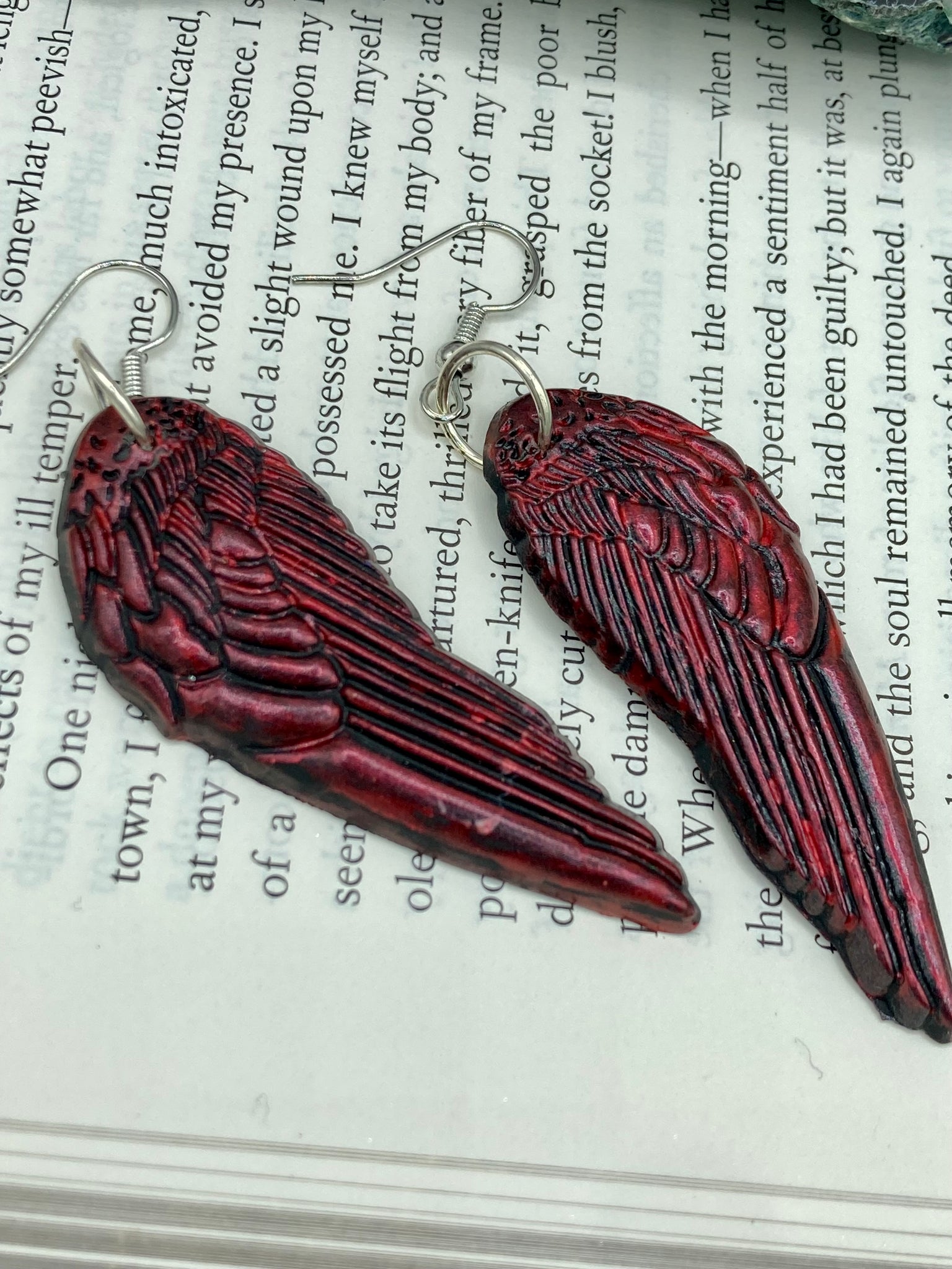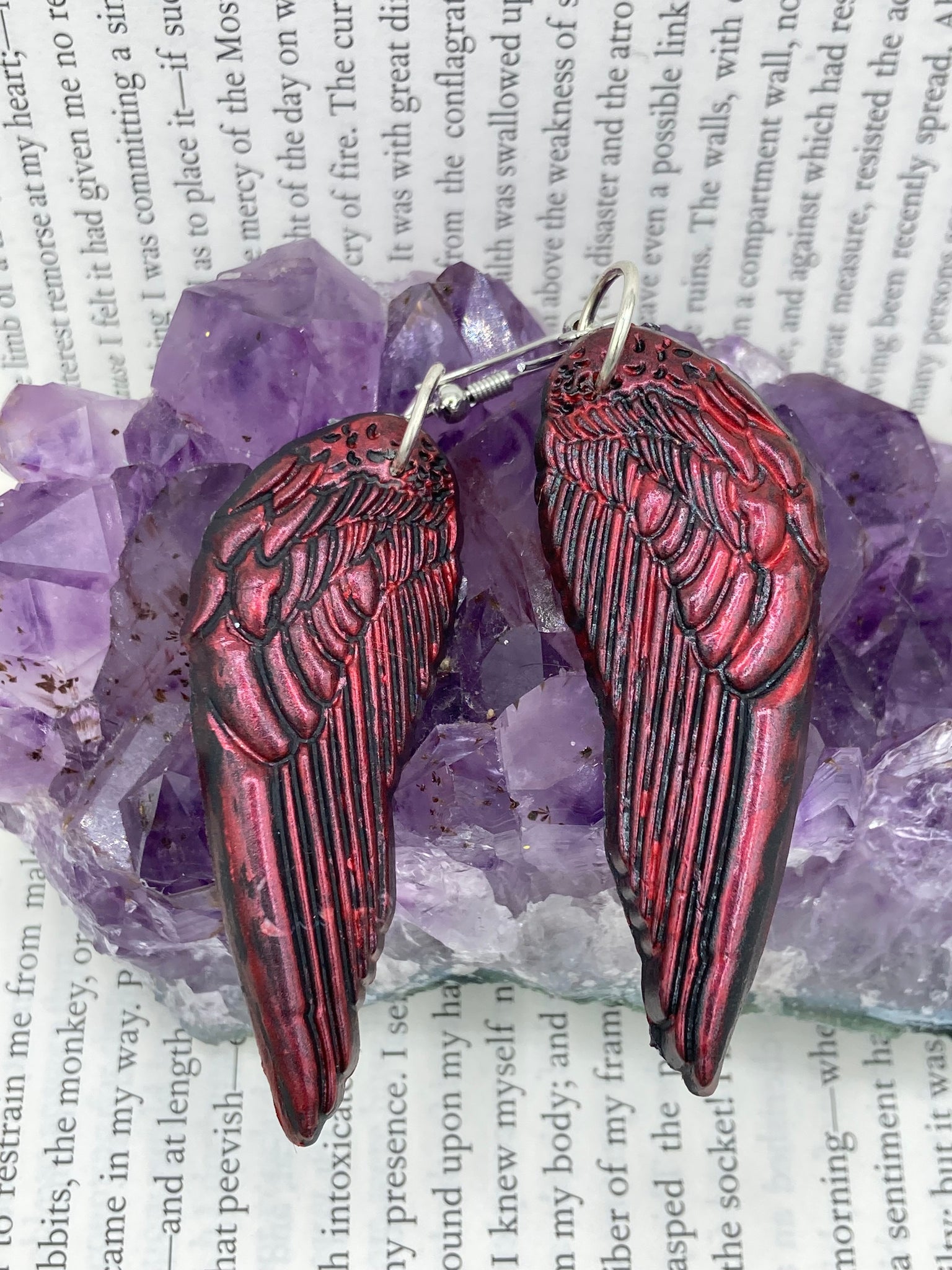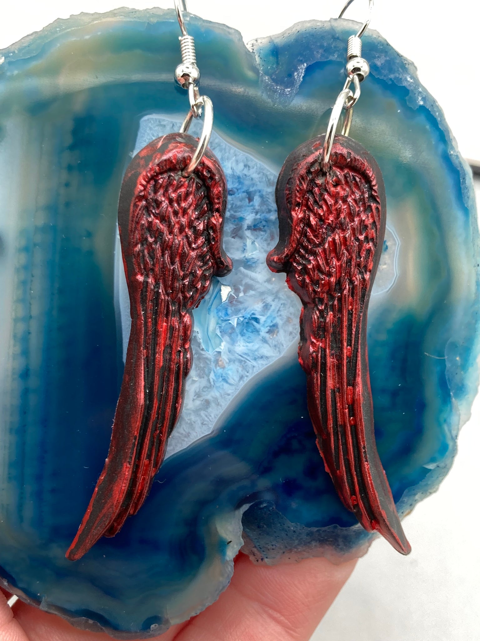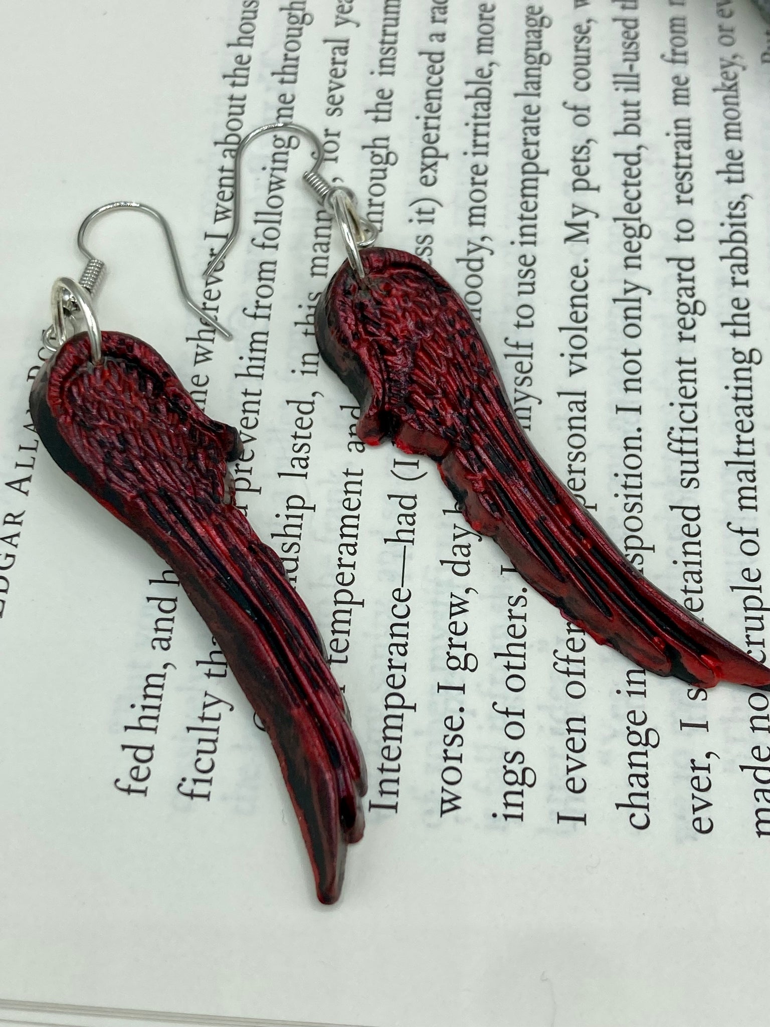 Red angel wings earrings made of polymer clay. These earrings are designed to face forward when worn instead of the front wings showing on the side.