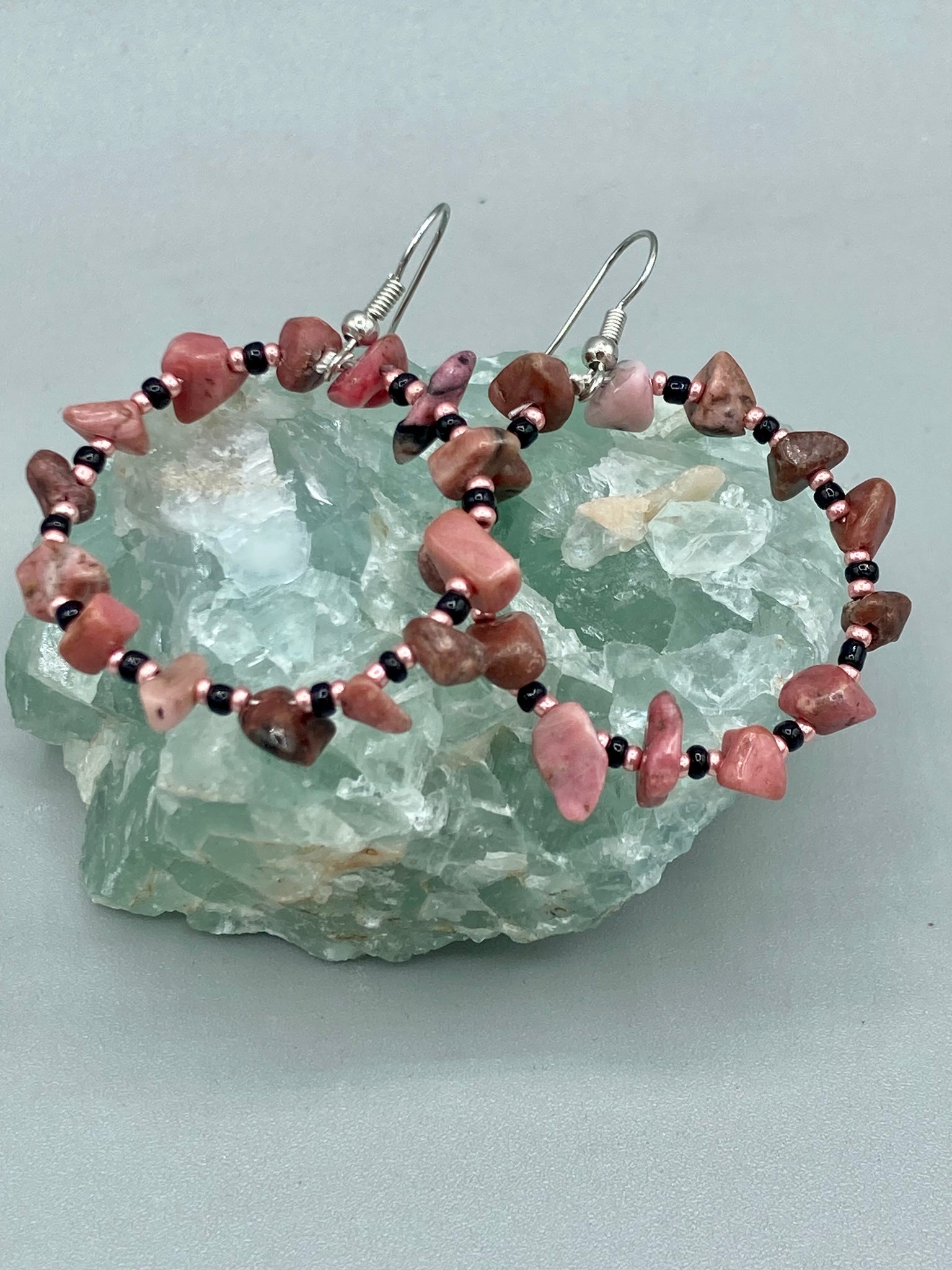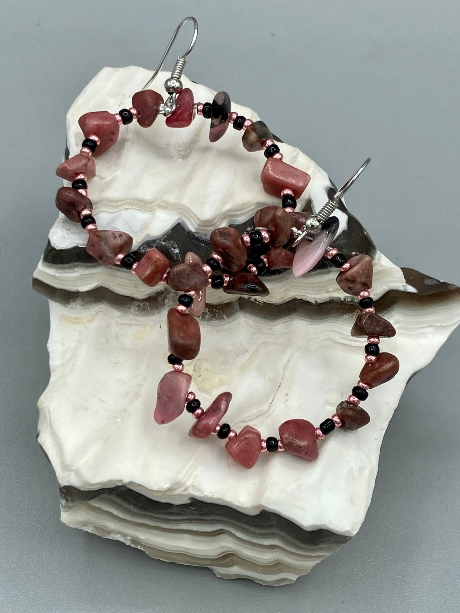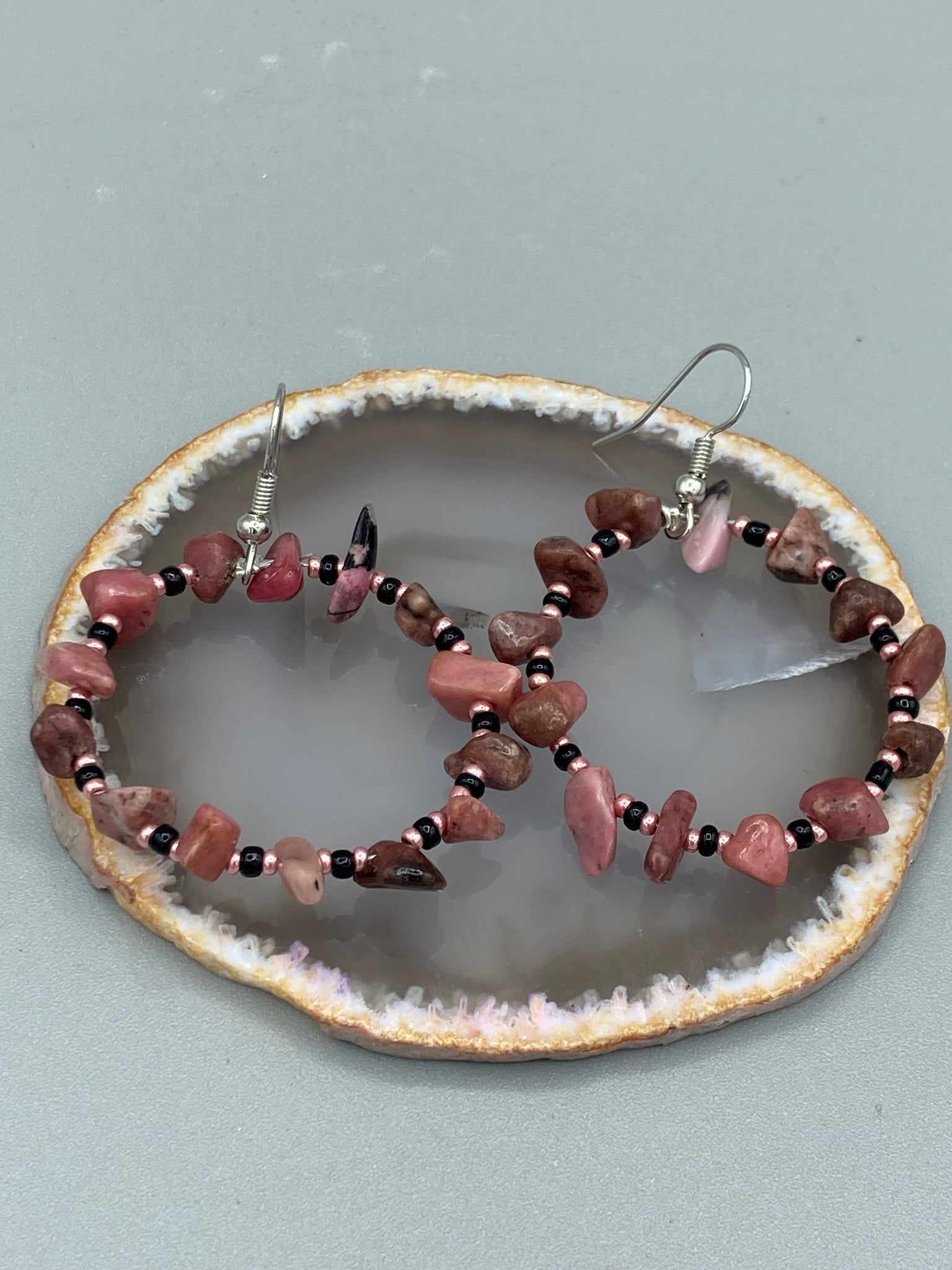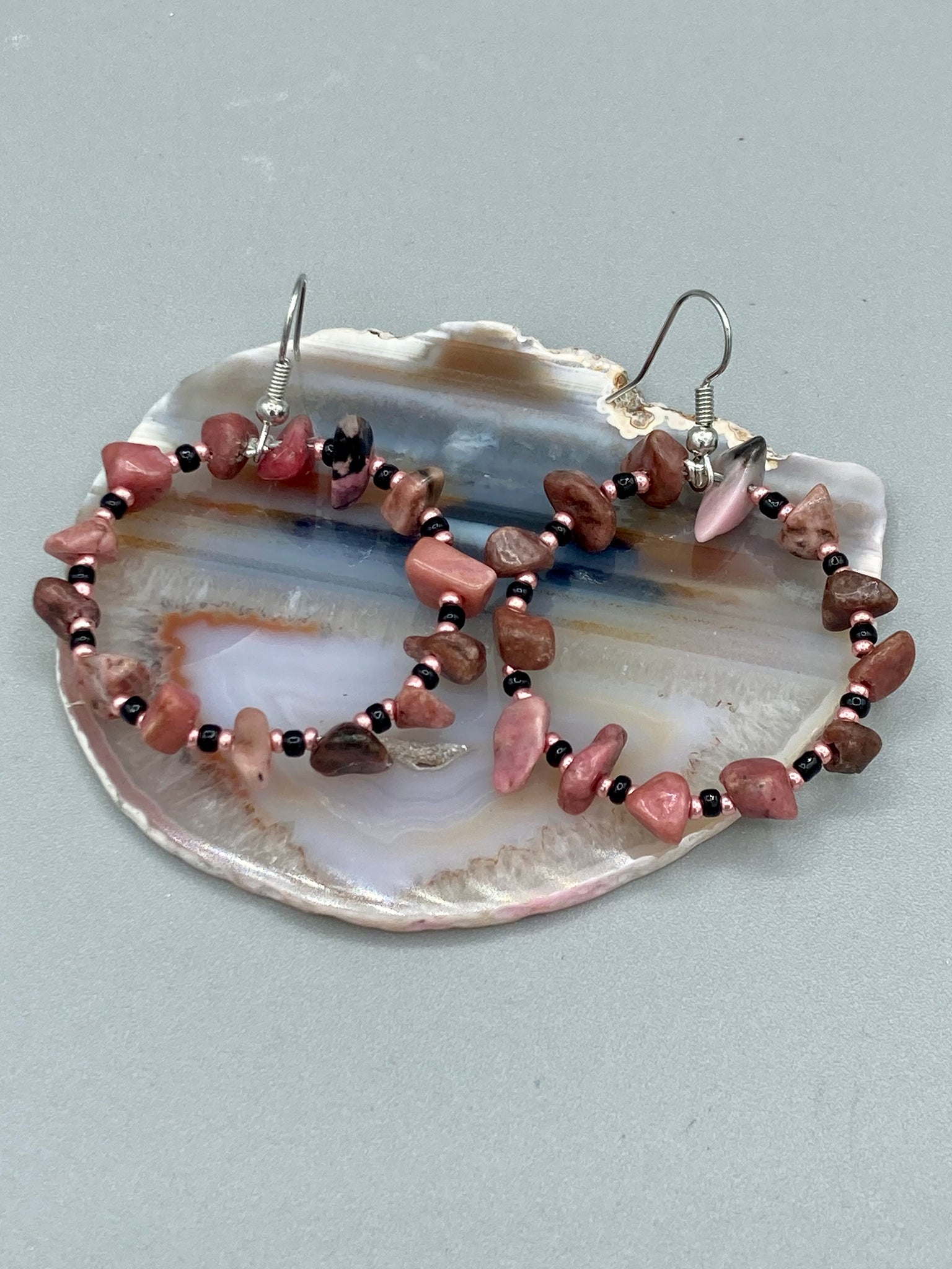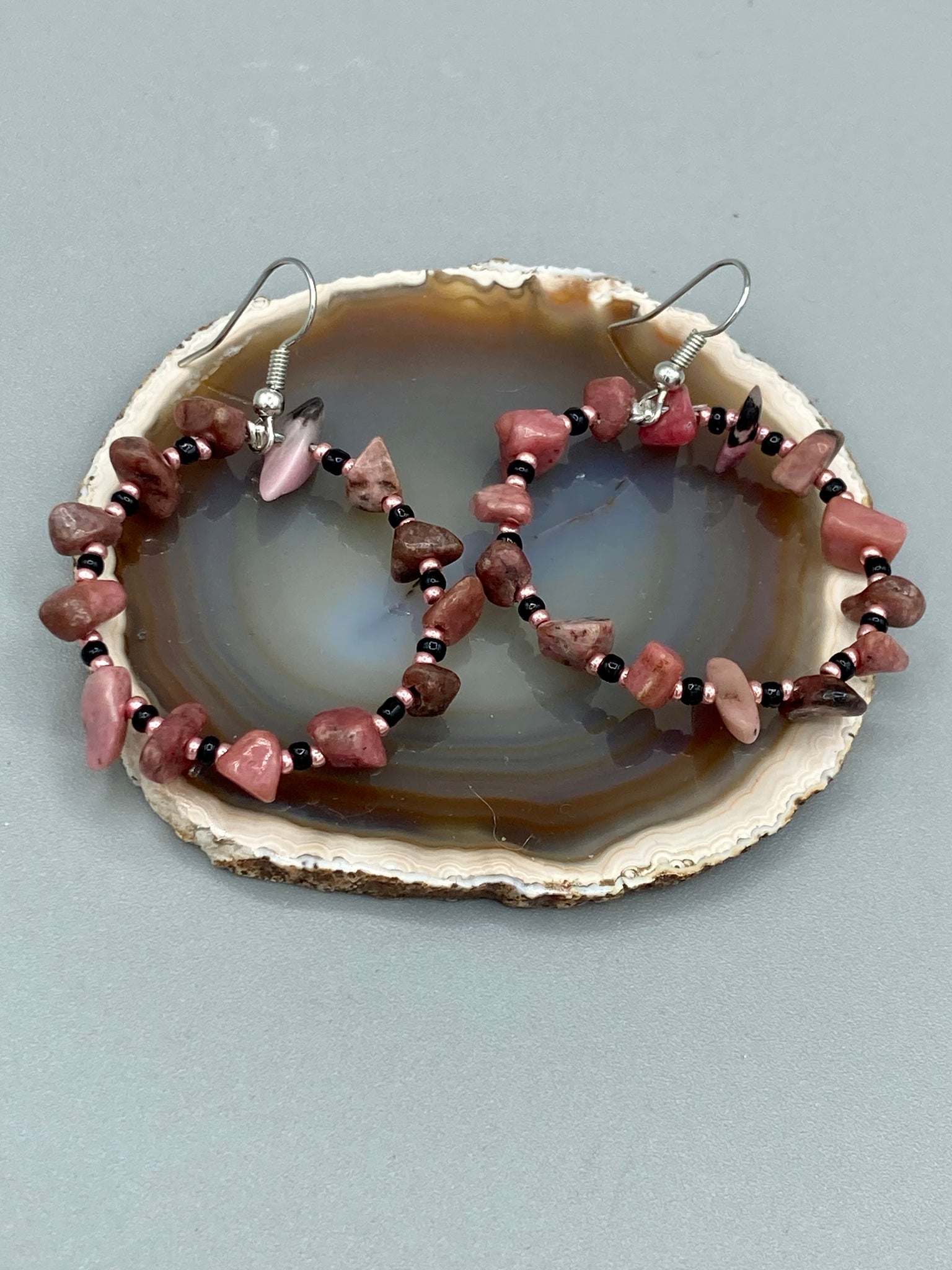Natural rhodonite stone chip with rose gold and black glass beaded hoop earrings.