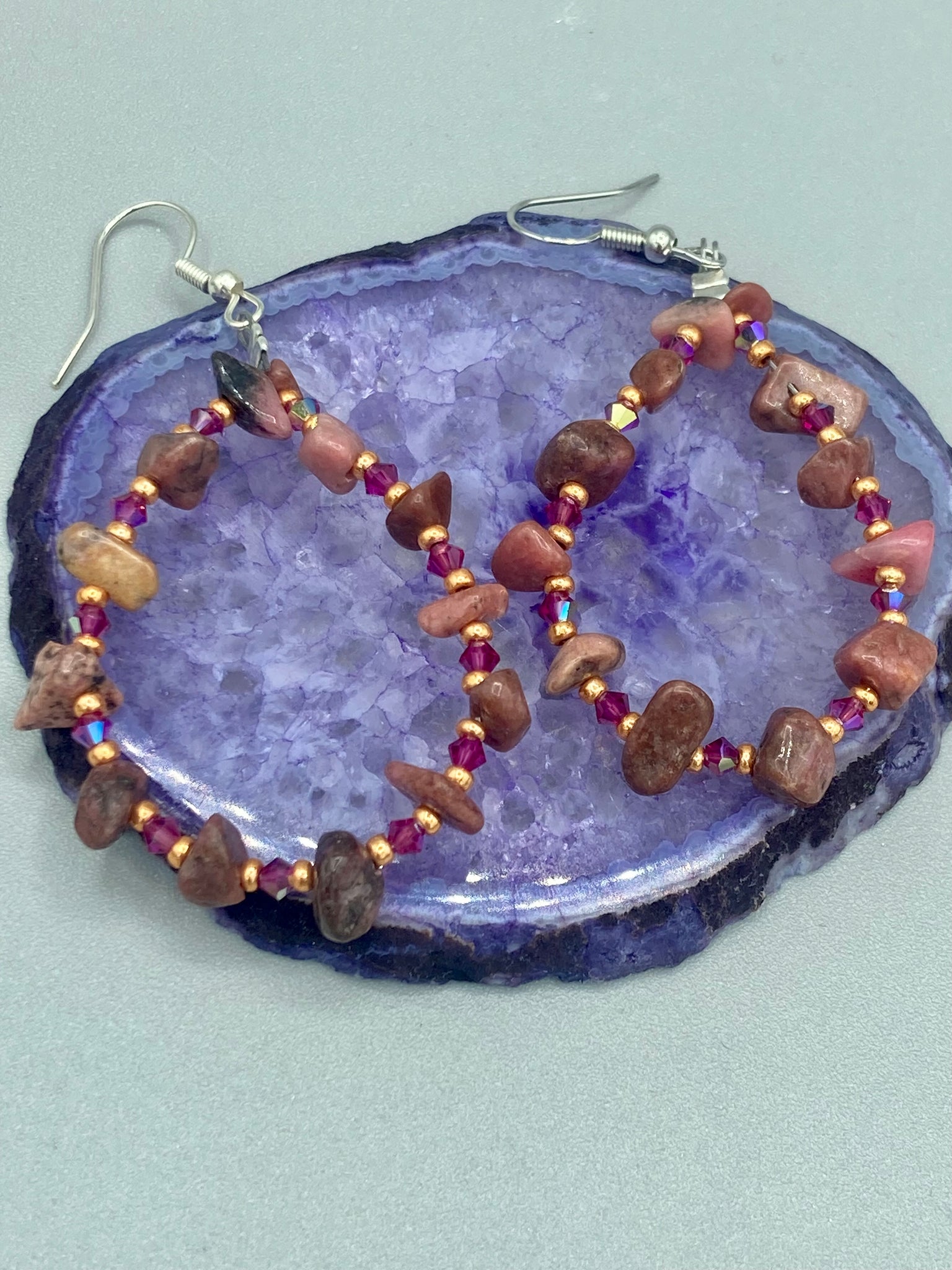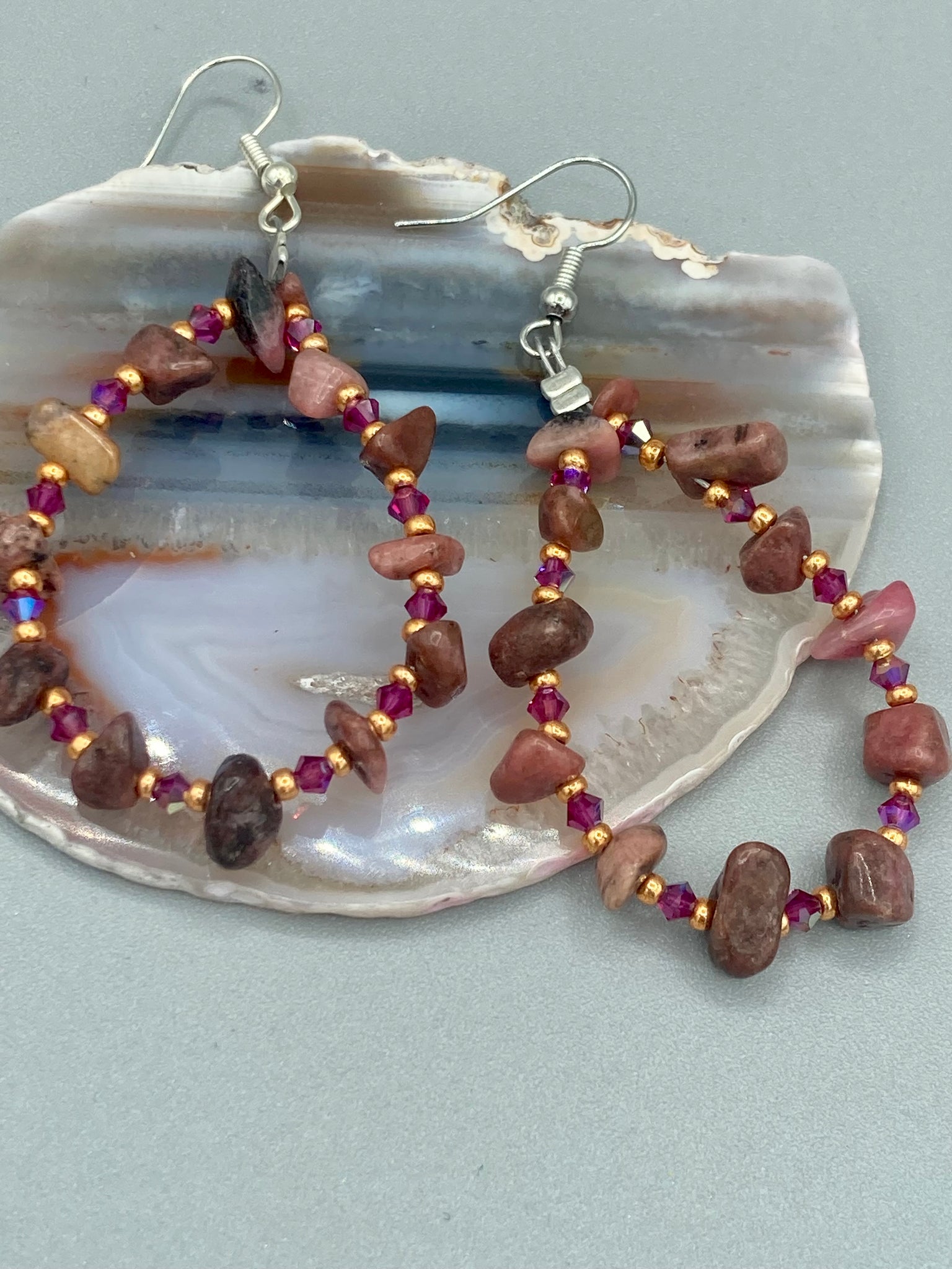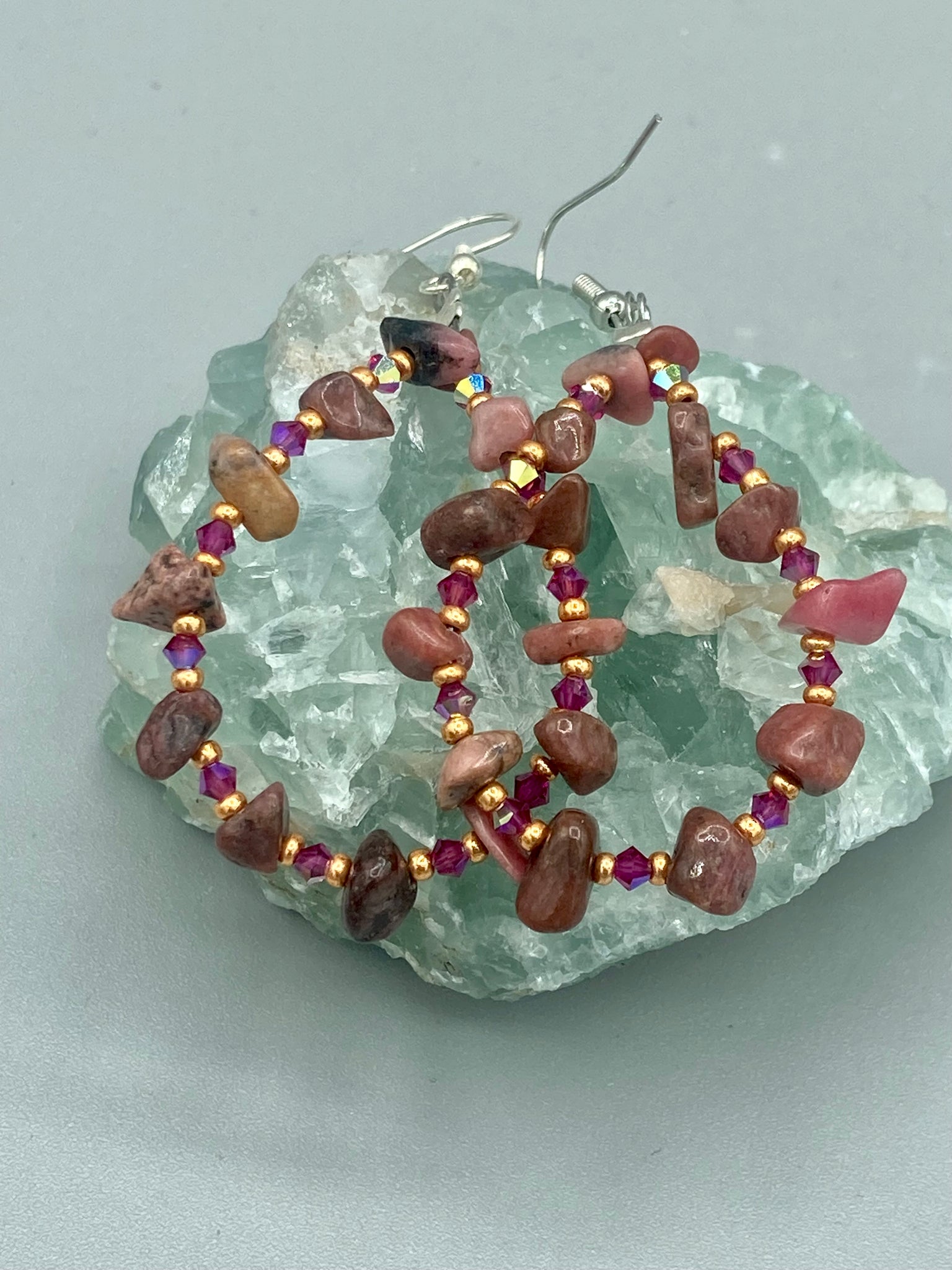 These pure rhodonite stone chip earrings with lustrous fuchsia and gold glass beading boast shimmering accents of blue, gold, and purple.