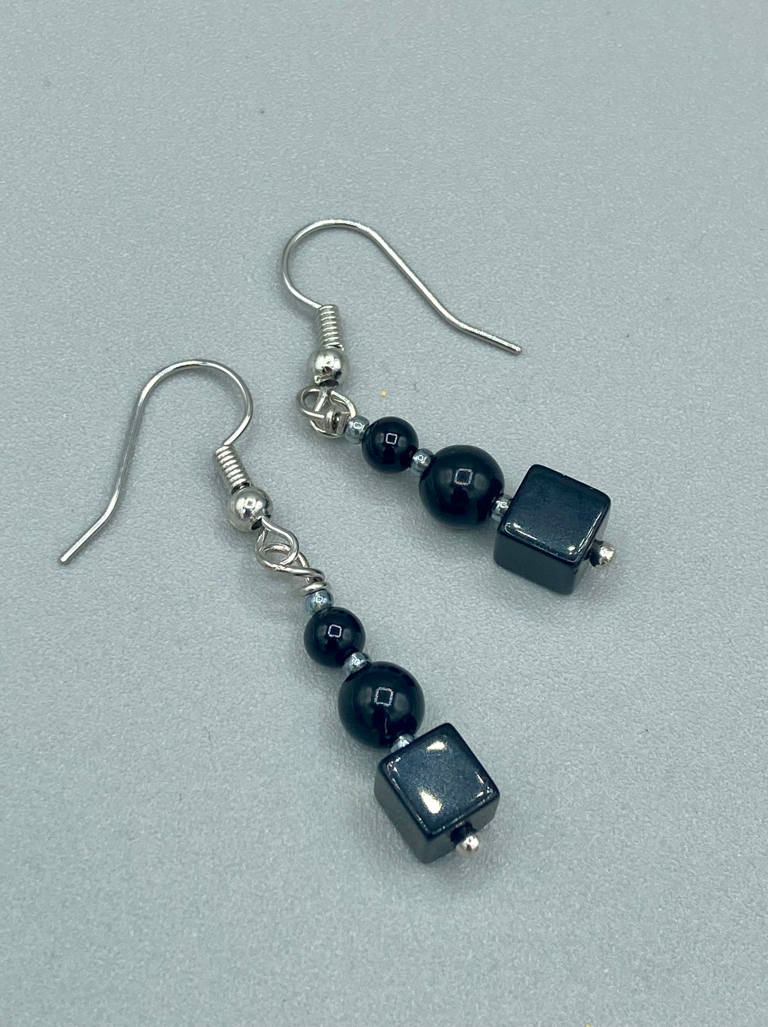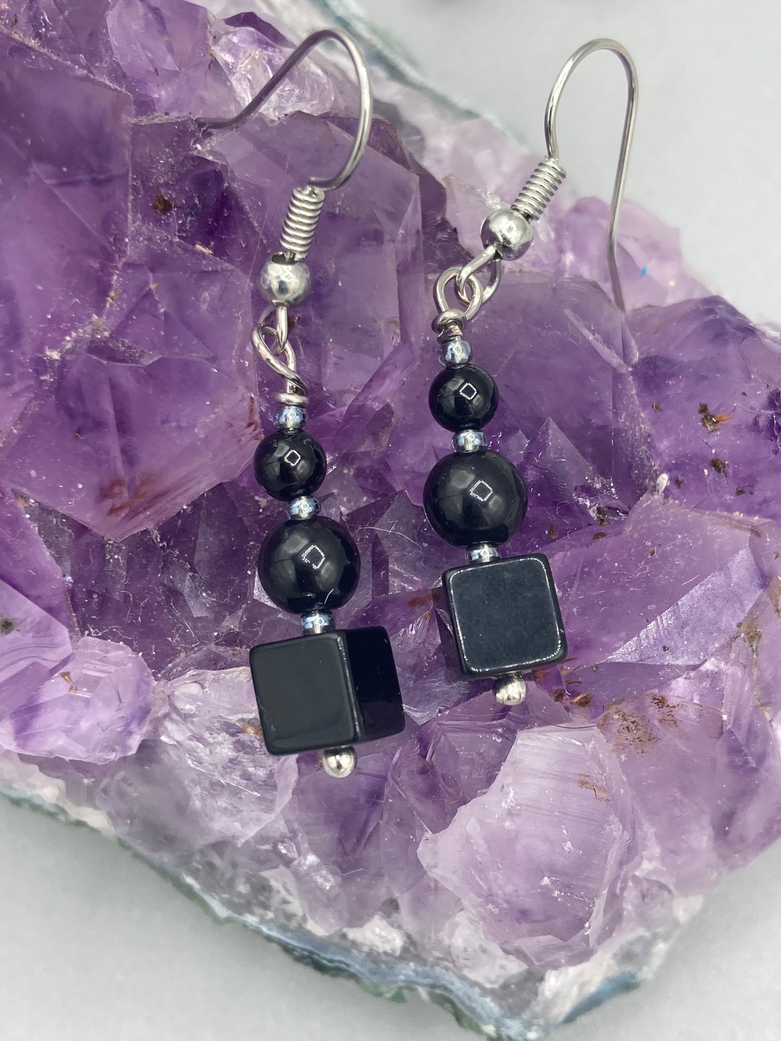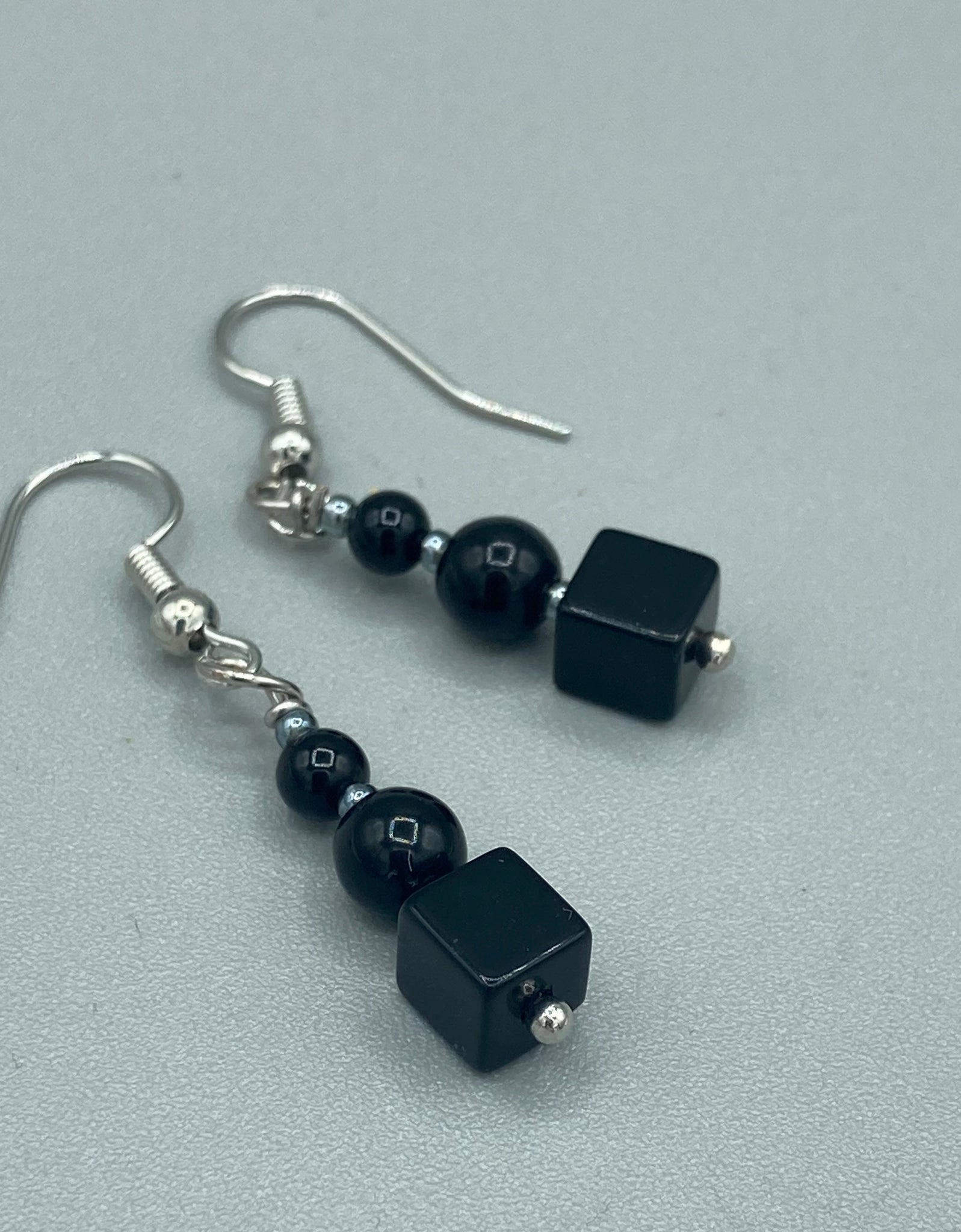 These earrings are crafted with large square-shaped black obsidian beads and small round-shaped black obsidian beads, paired with light gray glass beads. This combination provides an eye-catching, yet versatile look.