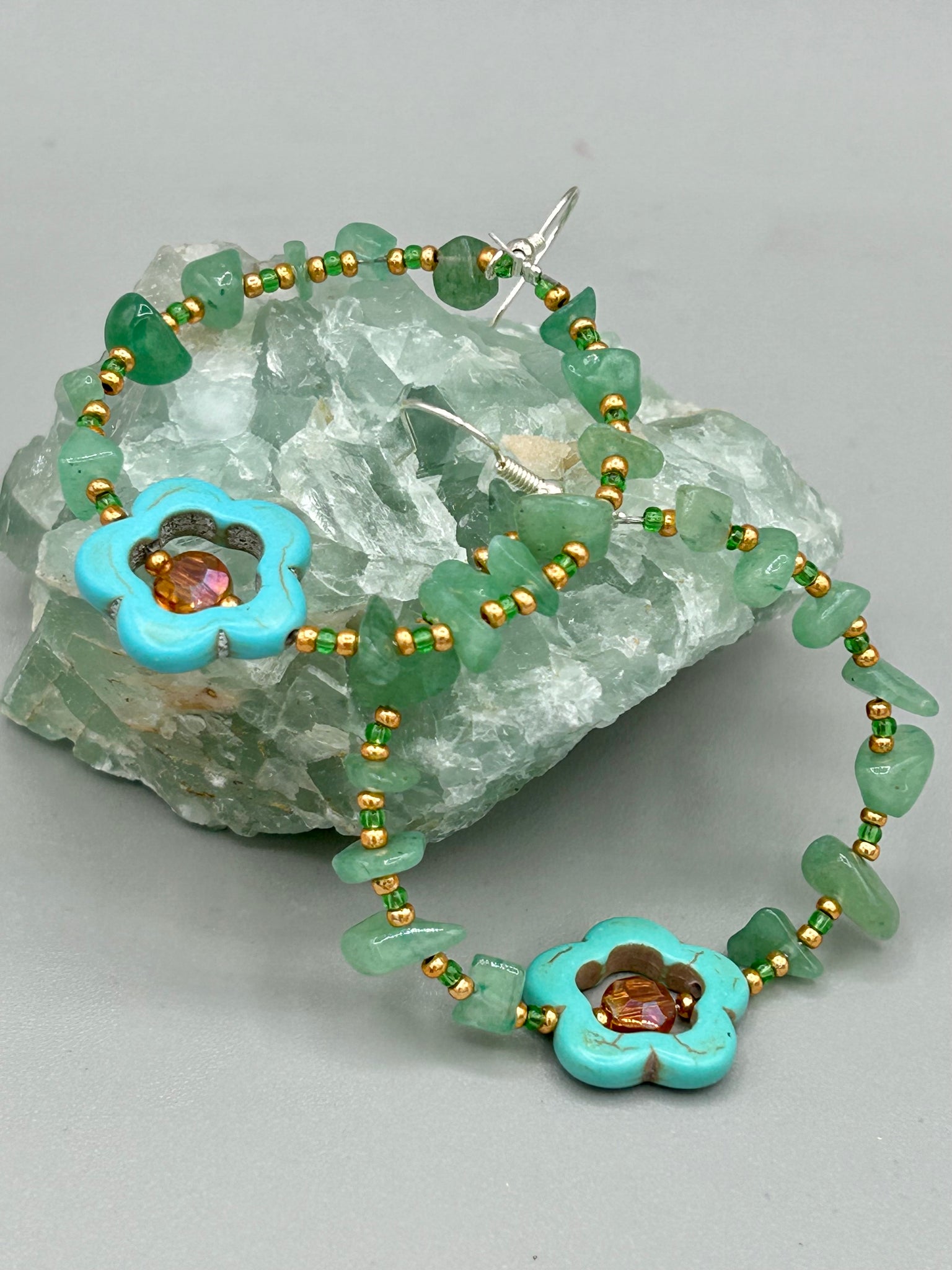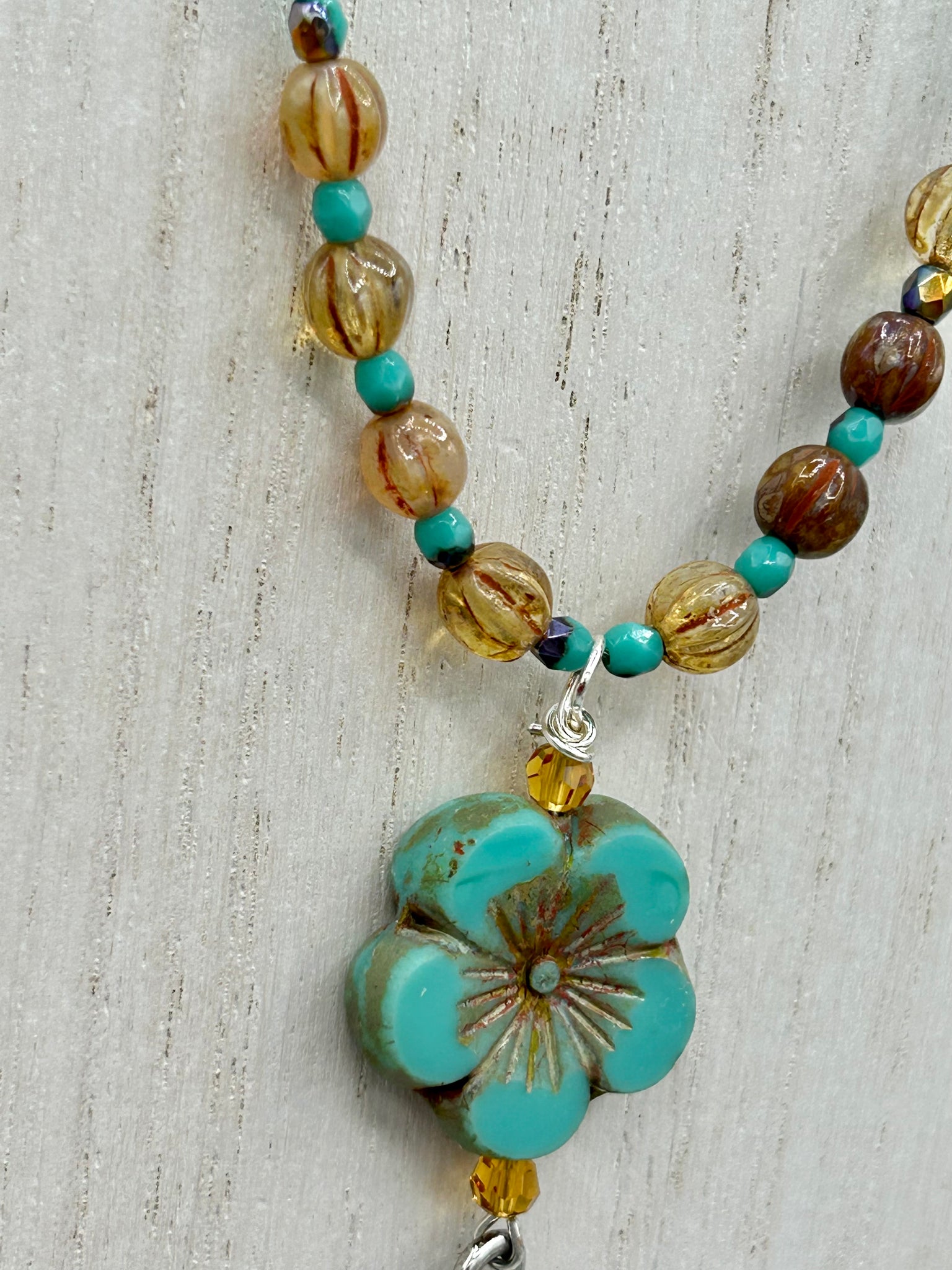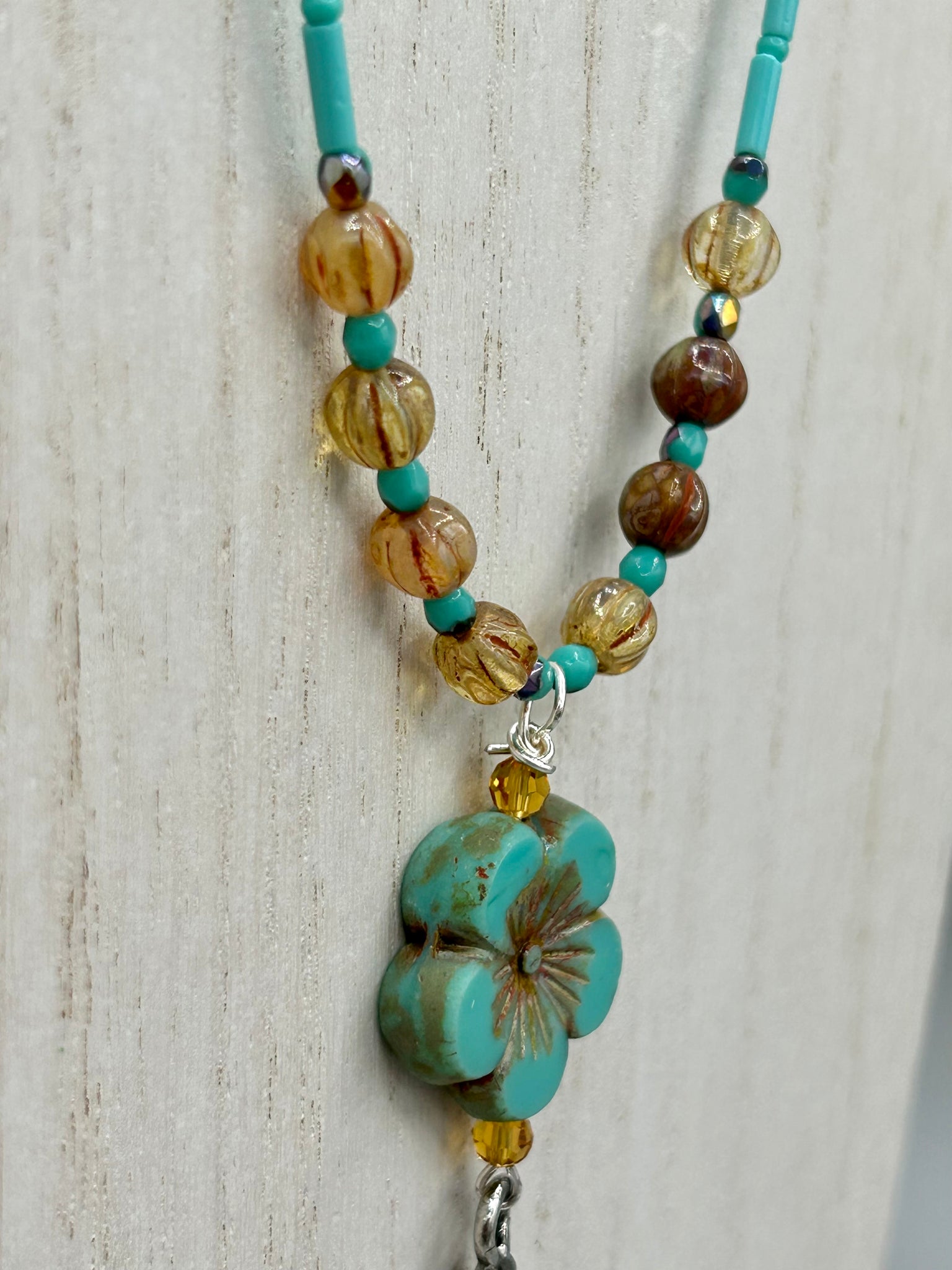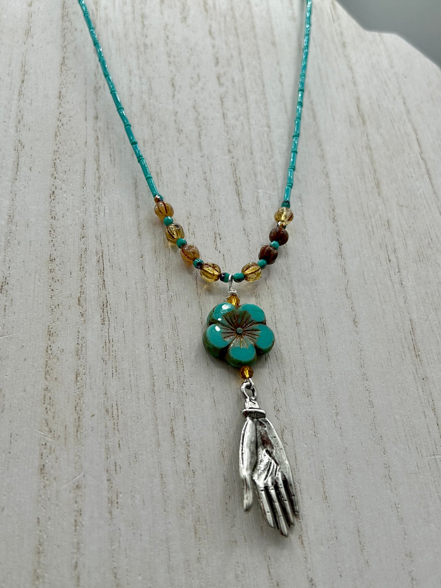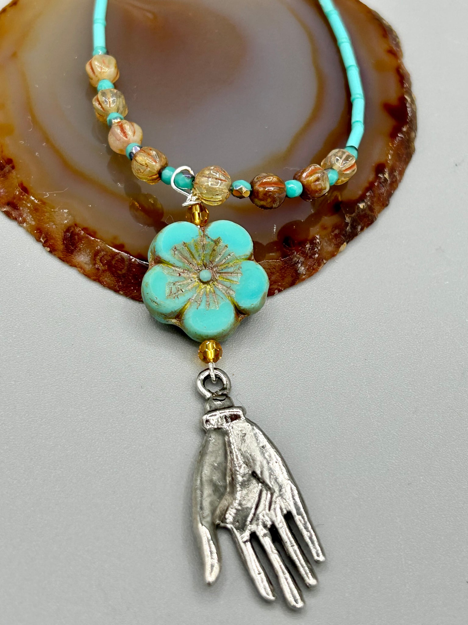 Complete your look with this carefully crafted necklace, featuring a large sea-green hibiscus pressed glass bead, a lucky hand charm, assorted champagne melon beads, and turquoise glass beads. All these elements are combined with a hook-eye clasp, ensuring lasting wear. This nature-inspired accessory adds a touch of charm to all kinds of outfits, making it ideal for both day and night.