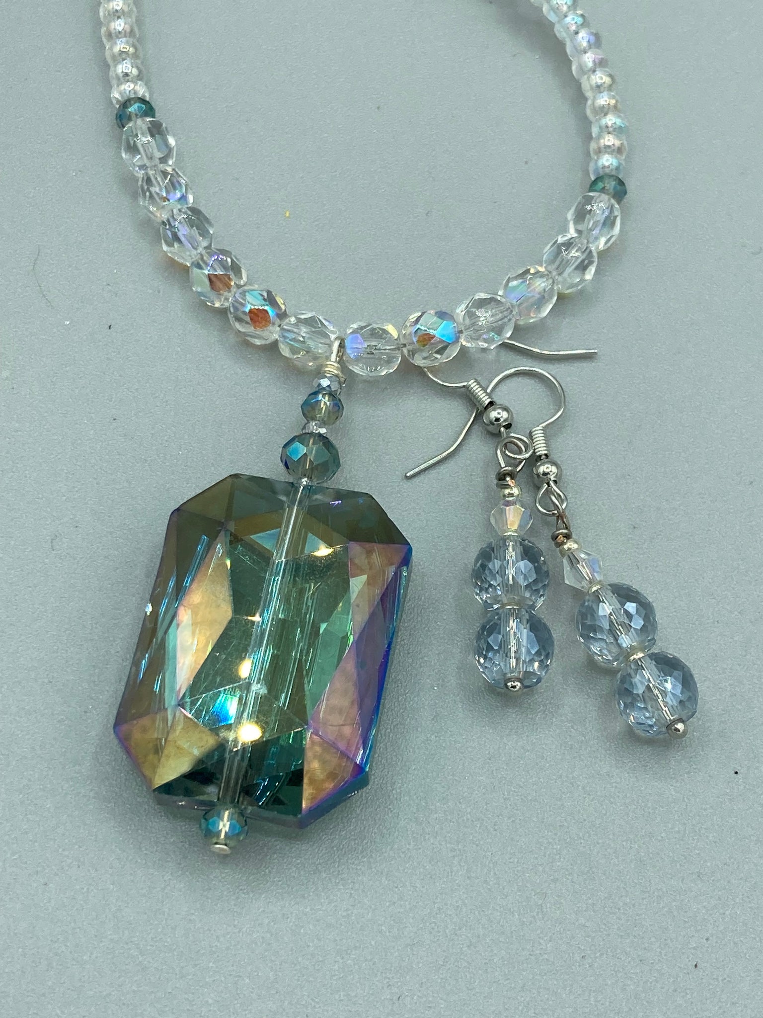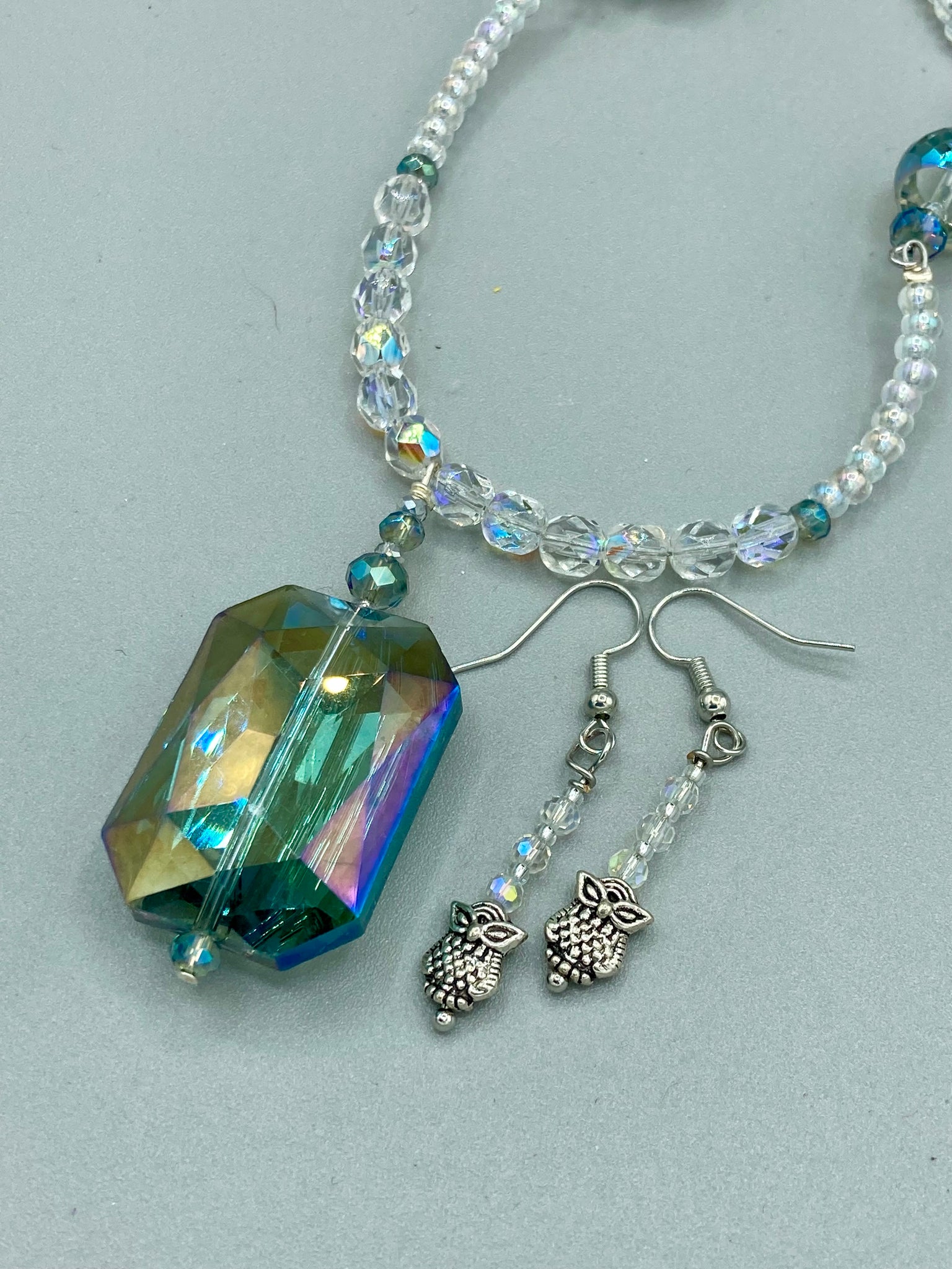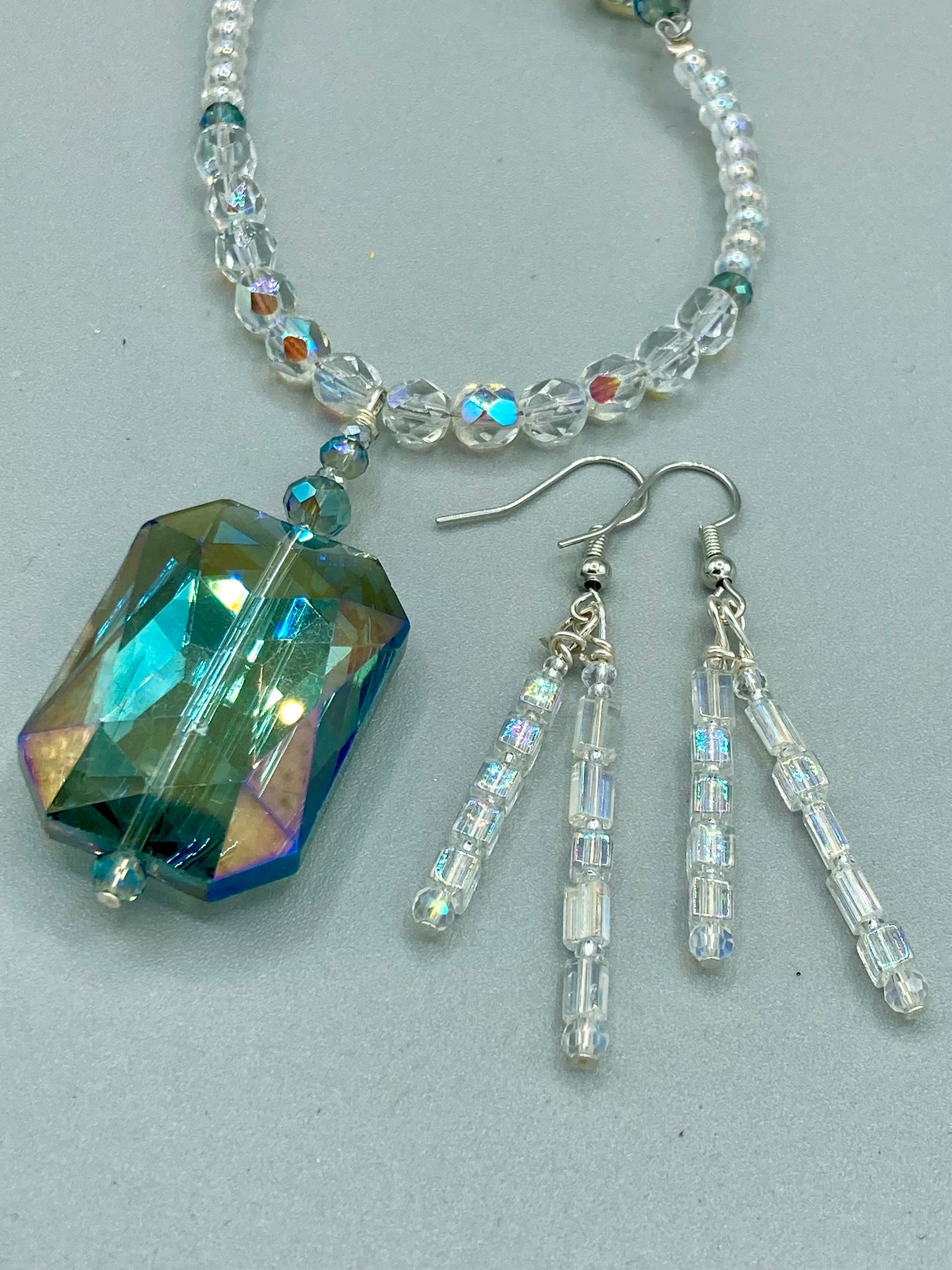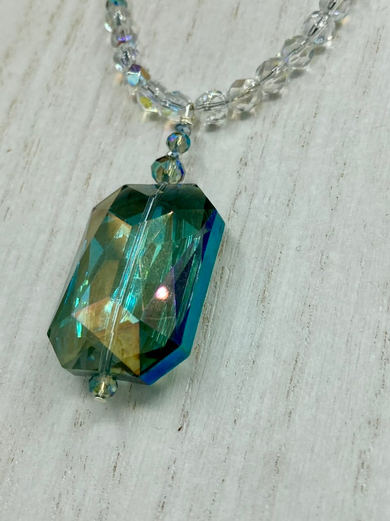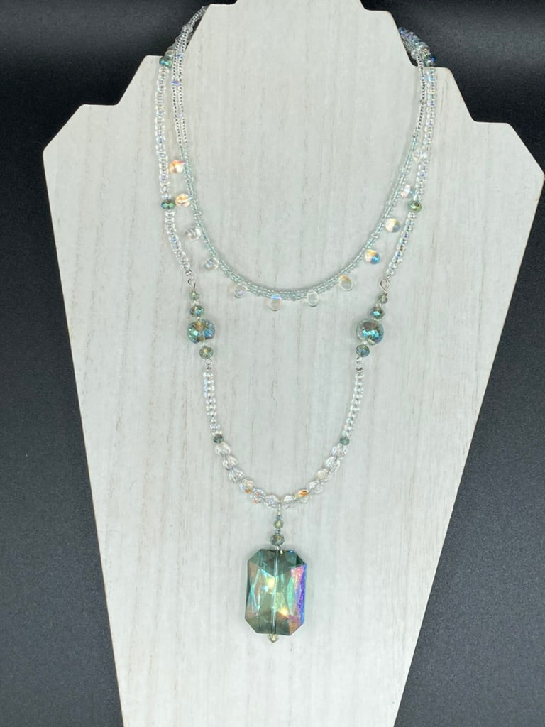 This stunning aqua blue and silver glass beaded necklace is a bold statement piece, composed of an adjustable necklace featuring blues, silver, and iridescent beads. Its shorter, "Collar" style strand contains two-hole iridescent beads to keep its shape and adds a generous helping of iridescent teardrop glass beads for maximum sparkle. Its accompanying large, rectangular faceted pendant has a shimmering mix of gold, green, pink, and blue hues, and elegantly drapes across the neck. The perfect addition to any outfit as the seasons change and add a splash of color.