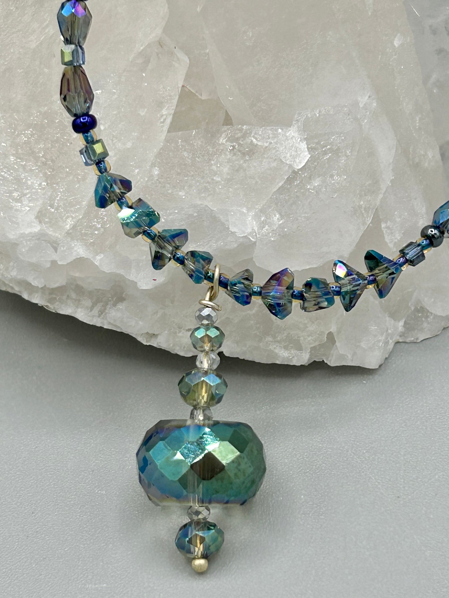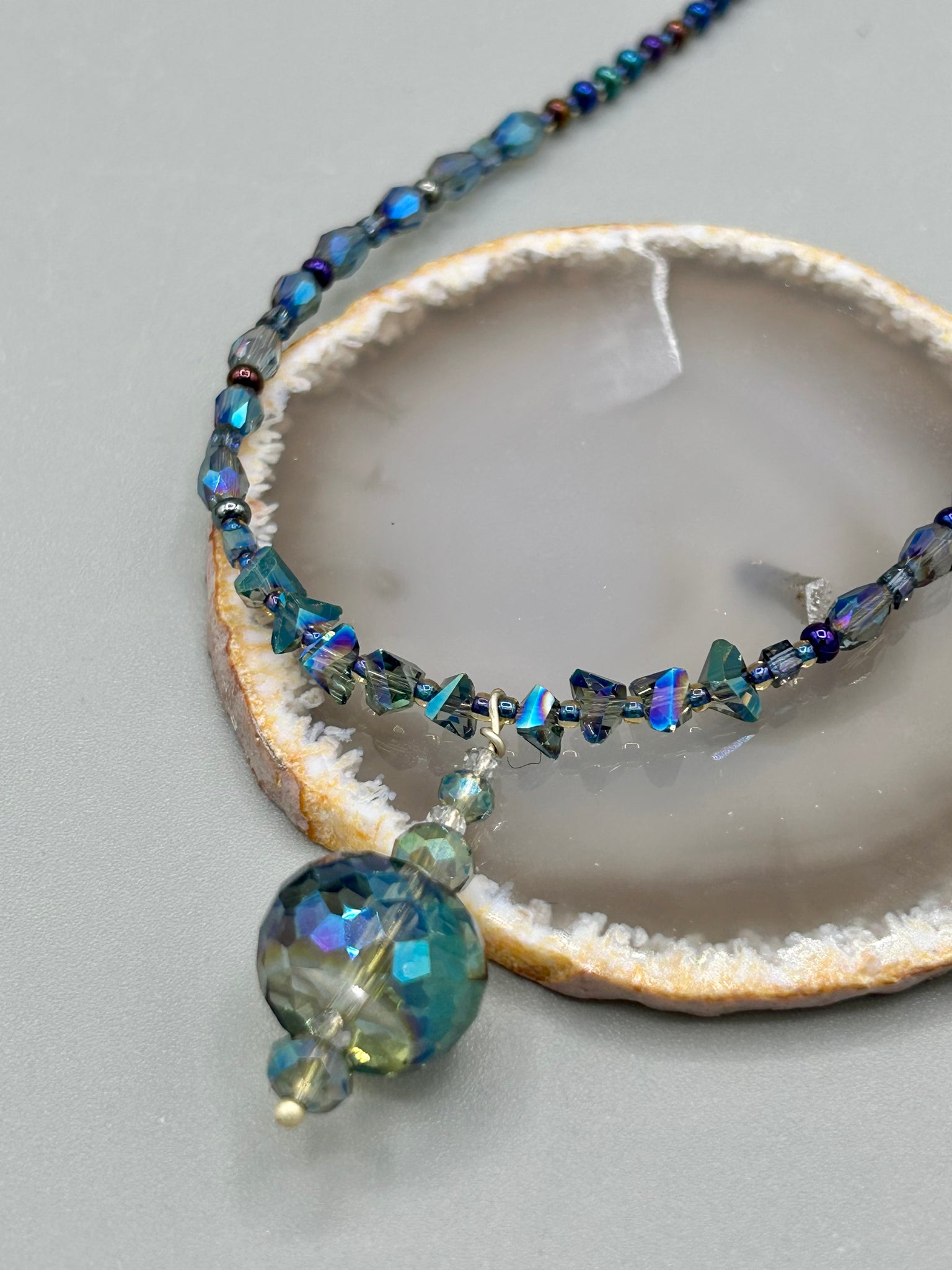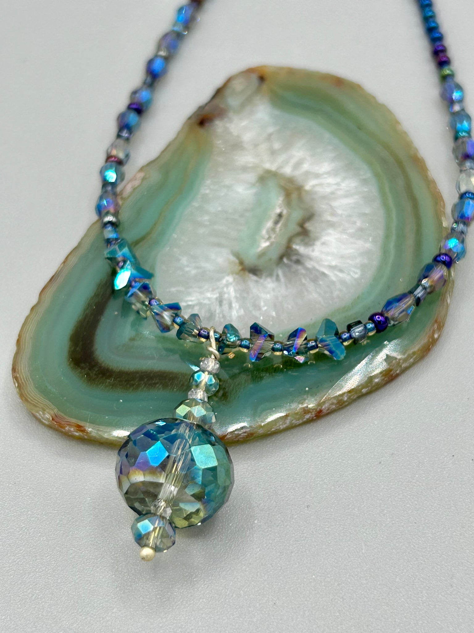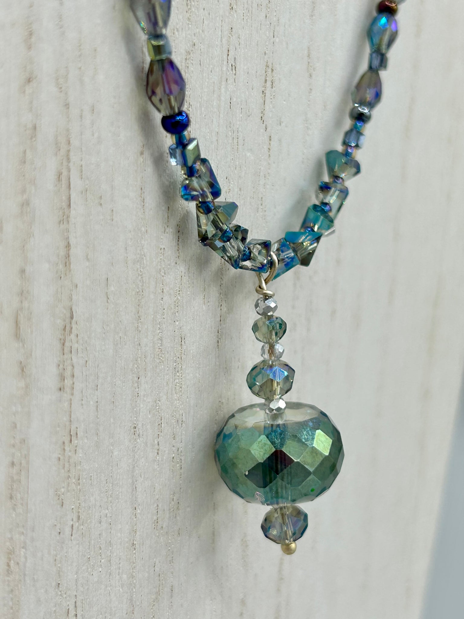 Make a bold statement with this shimmery aqua blue and blue tones glass beaded necklace. The round faceted shaped aqua blue pendant compliments the cool tones of the necklace, perfect for adding a rich pop of color to any Spring outfit. The draped design gives this piece an elegant, bohemian look.