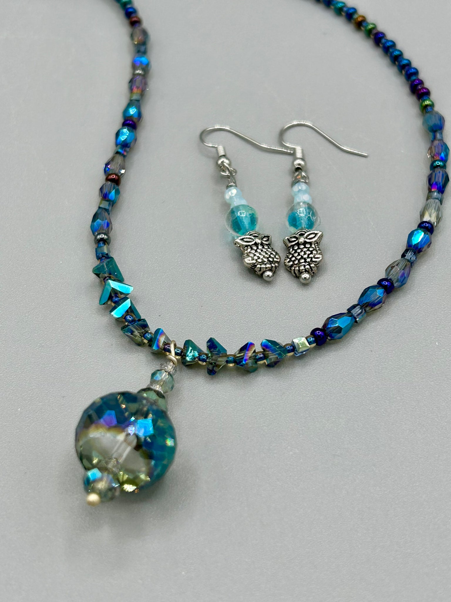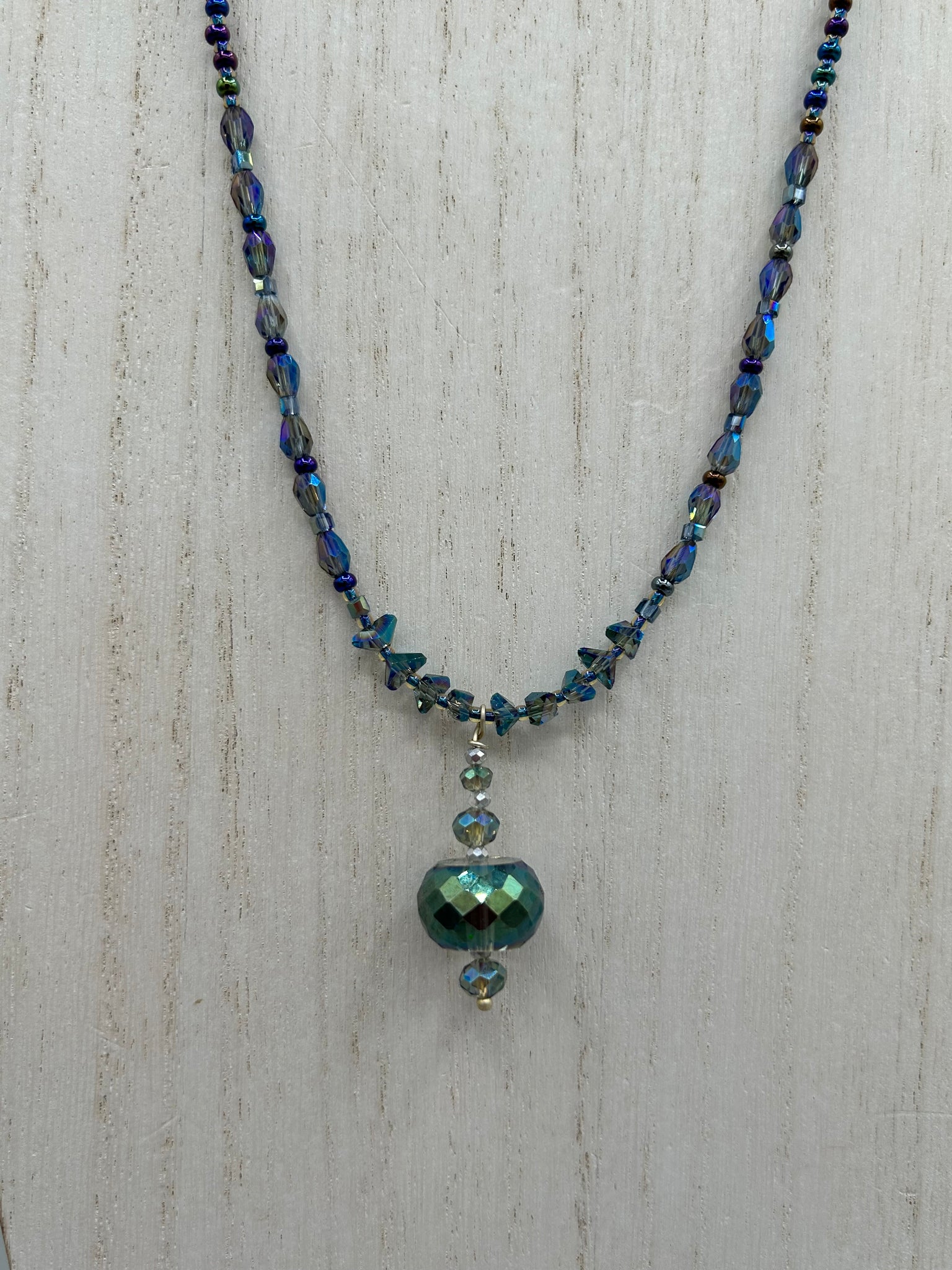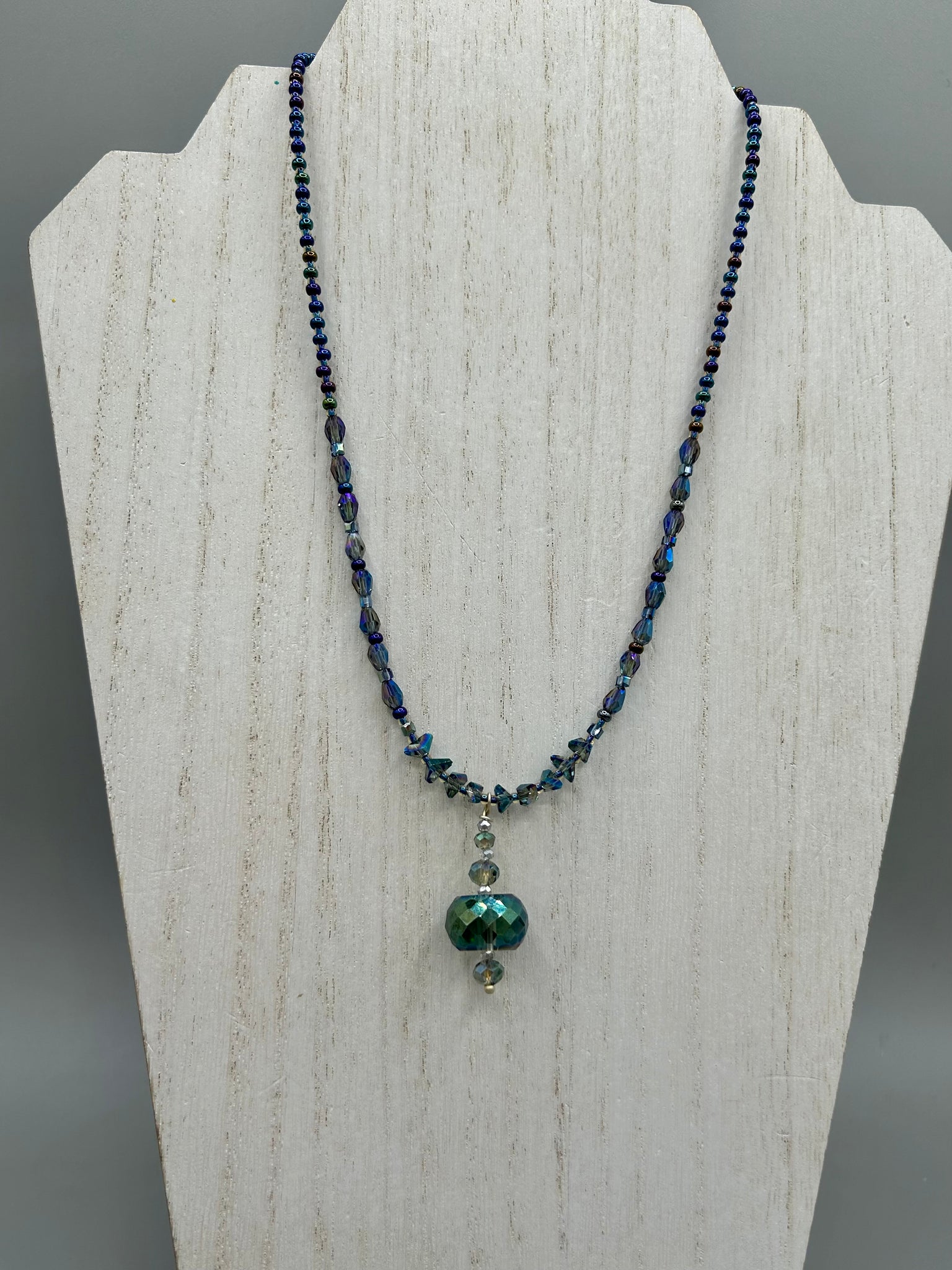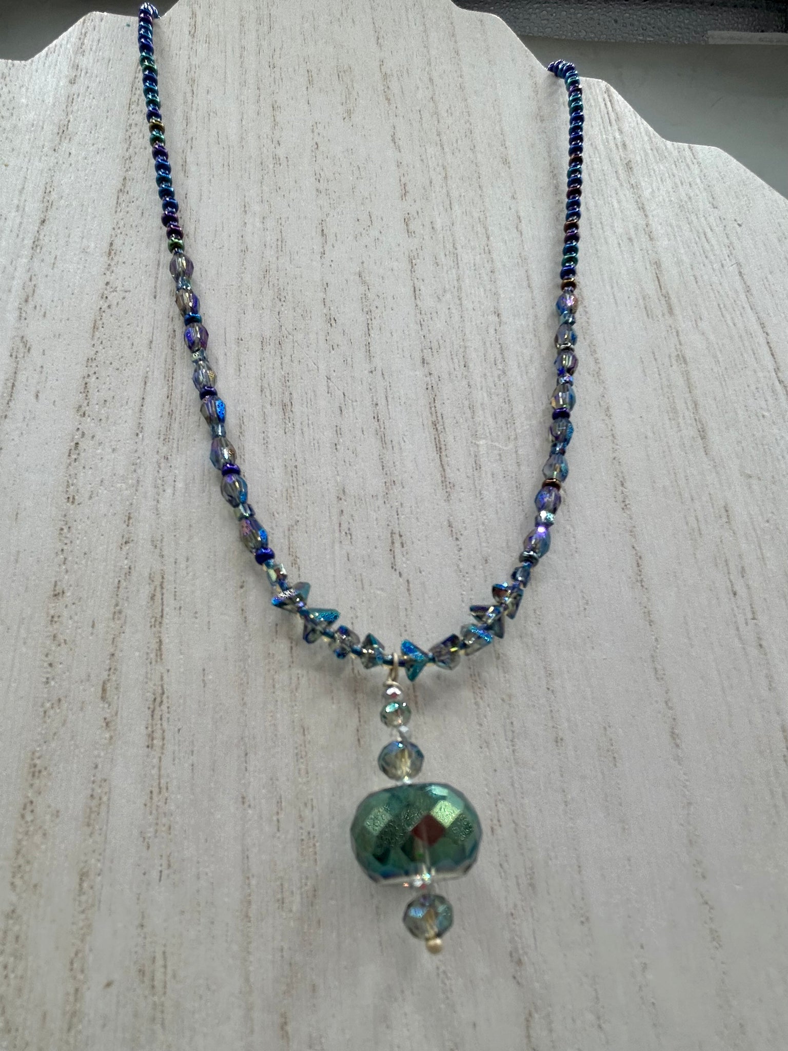 Make a bold statement with this shimmery aqua blue and blue tones glass beaded necklace. The round faceted shaped aqua blue pendant compliments the cool tones of the necklace, perfect for adding a rich pop of color to any Spring outfit. The draped design gives this piece an elegant, bohemian look.