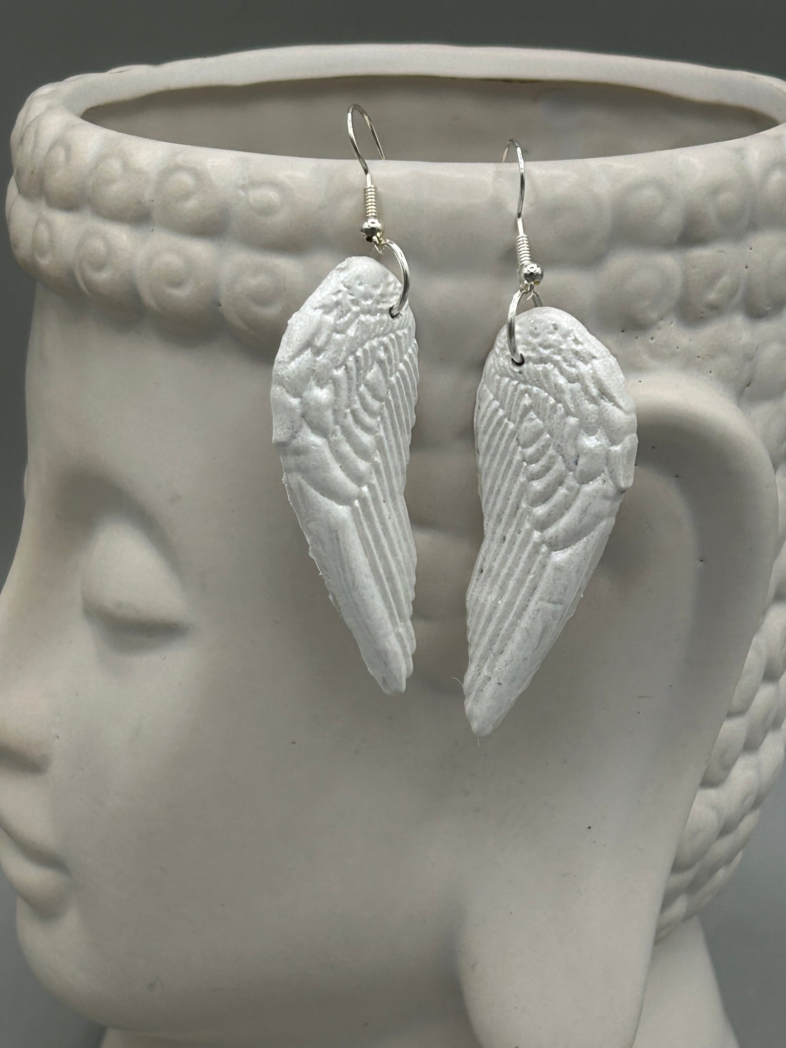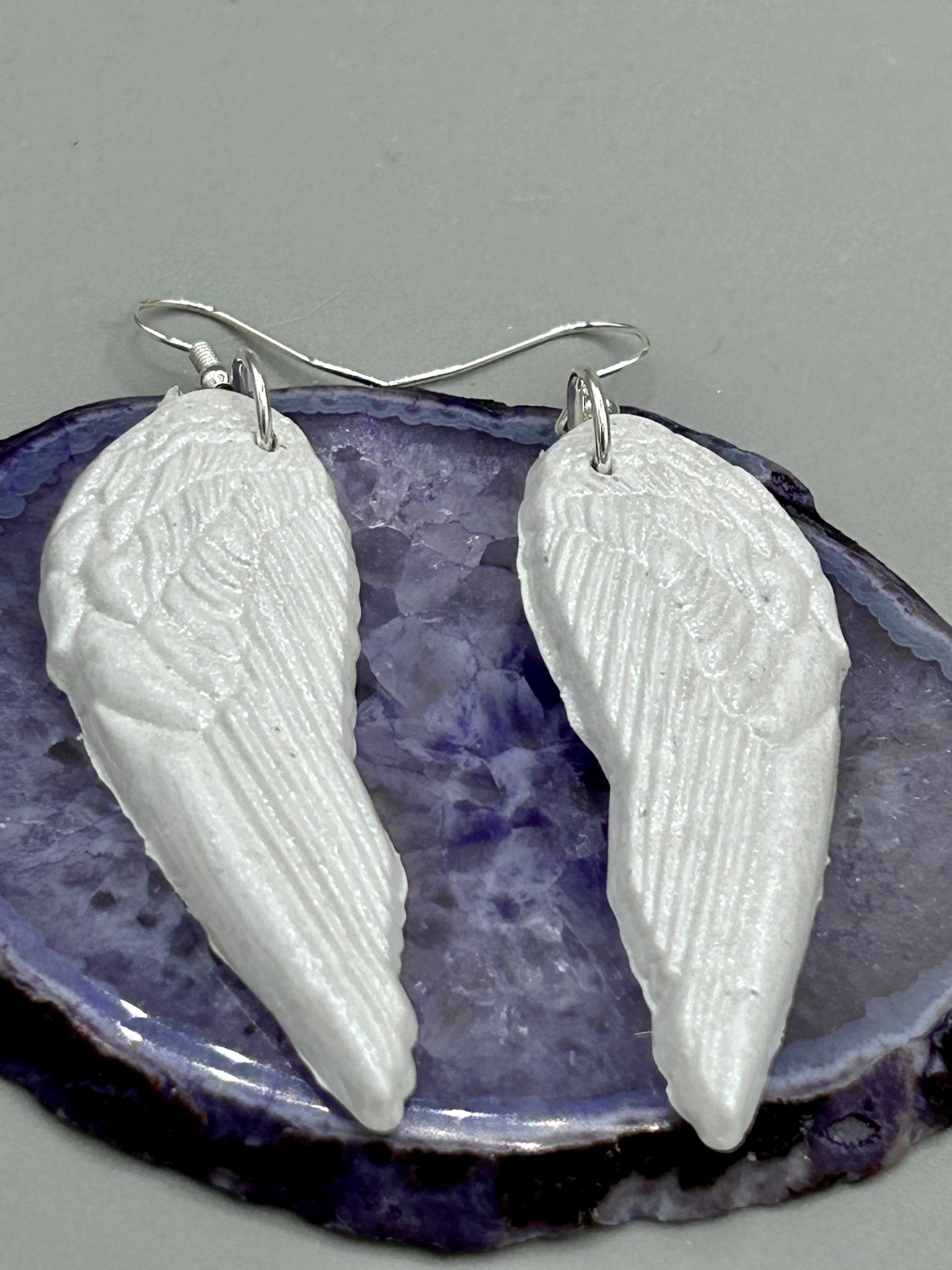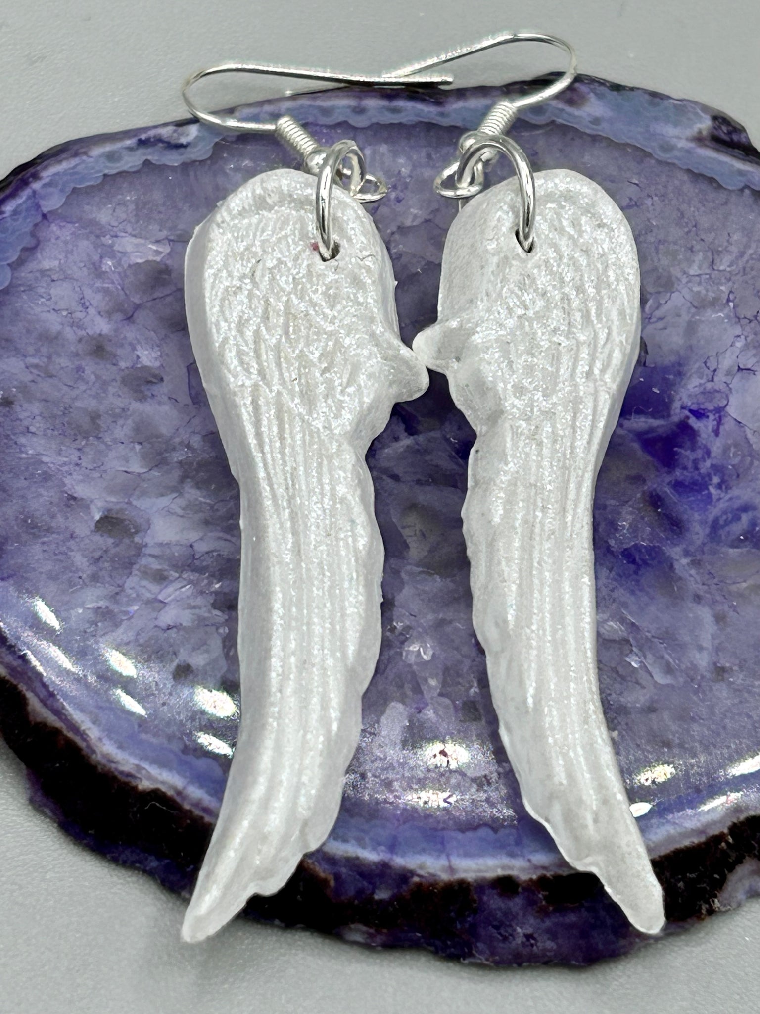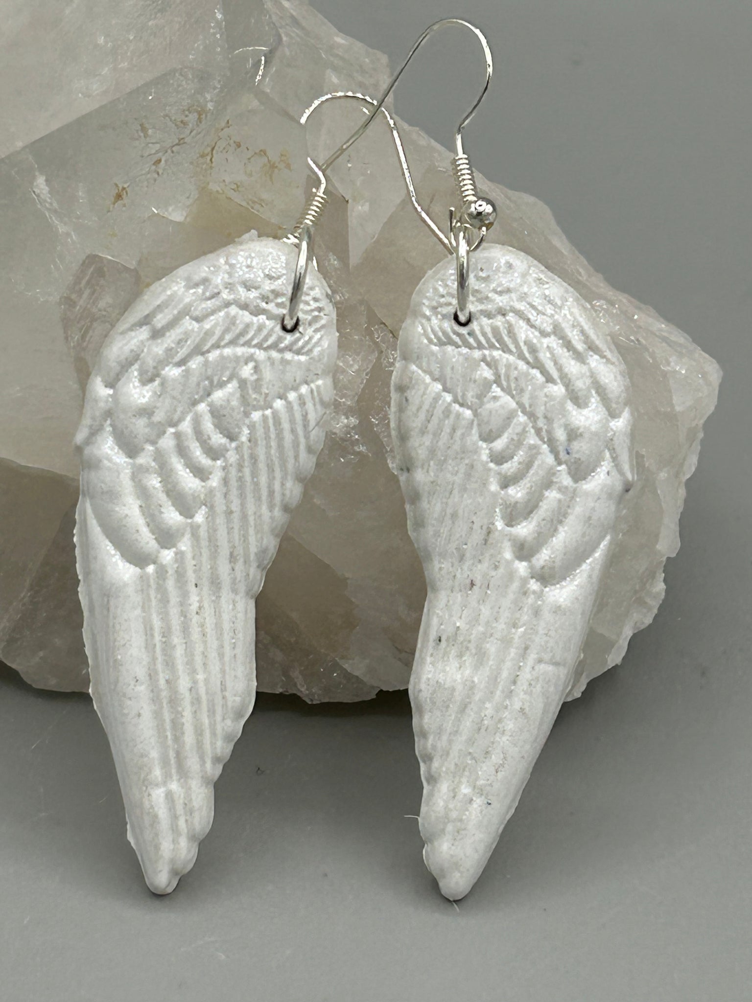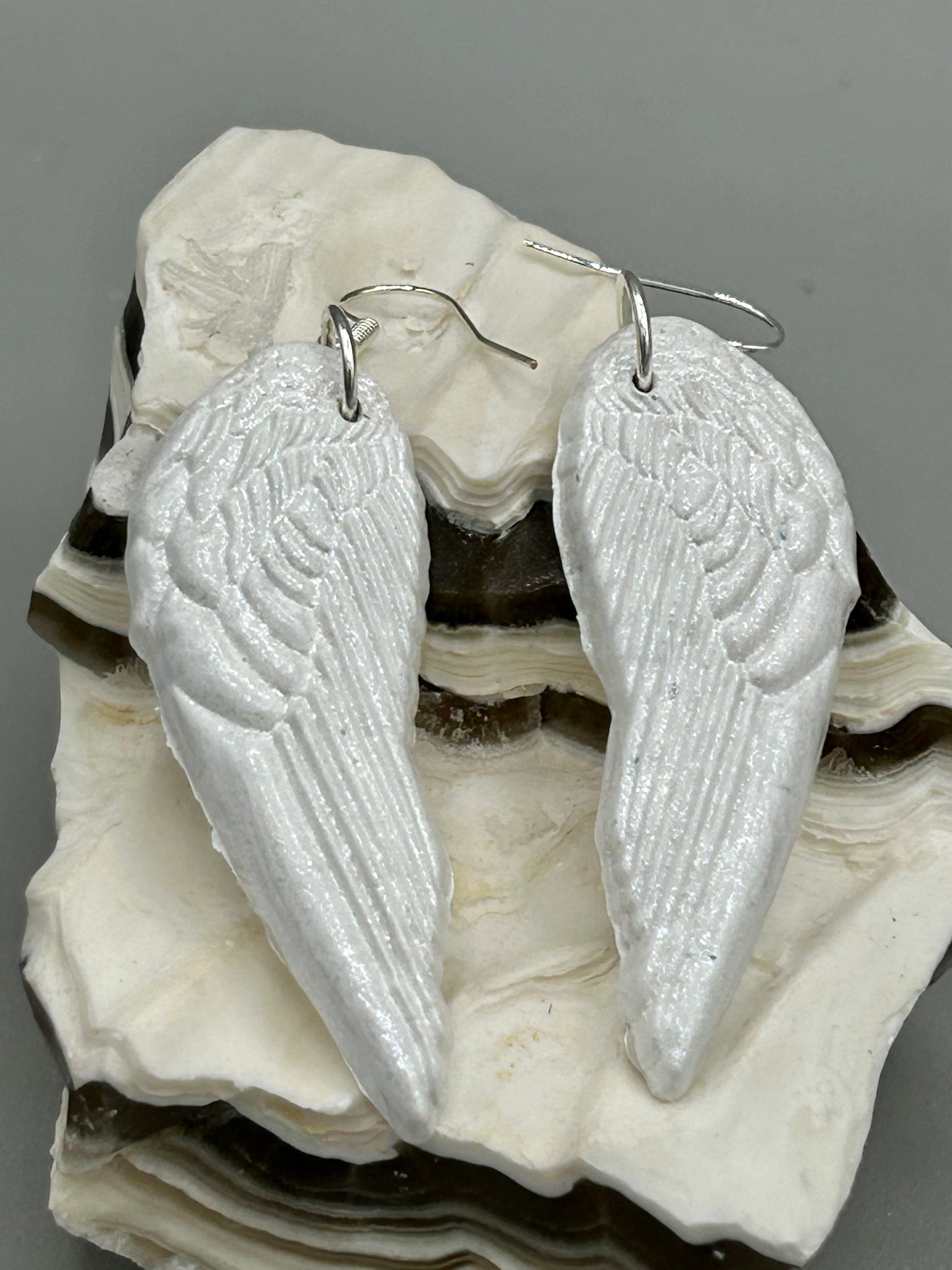 Shimmery white polymer clay earrings in the shape of angel wings are perfect for a subtle yet elegant look. These earrings are designed to face forward when worn for a more flattering silhouette.