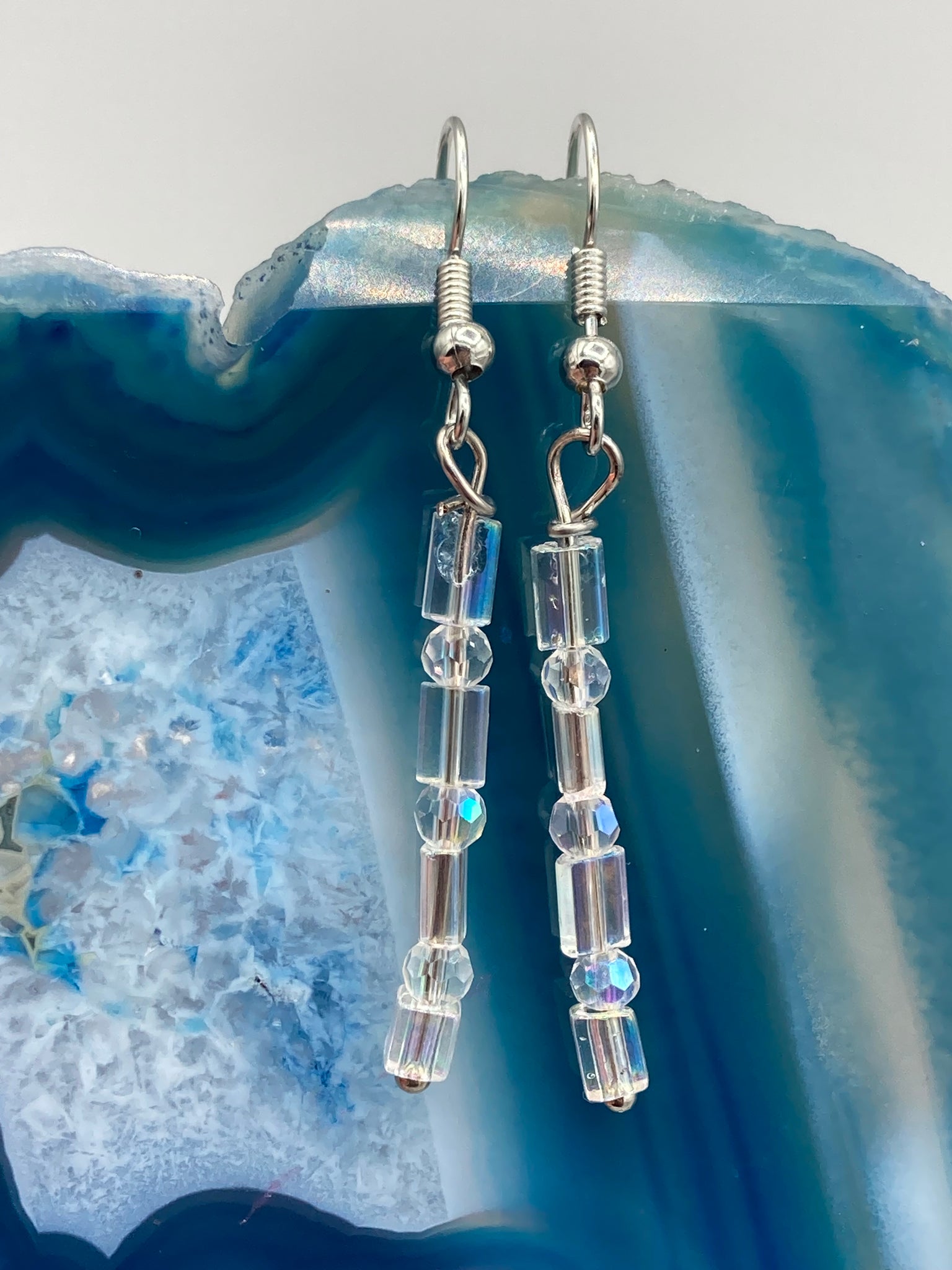 This pair of earrings features two strands of sparkling glass beads, in both rectangular and round shapes, with an iridescent sheen.