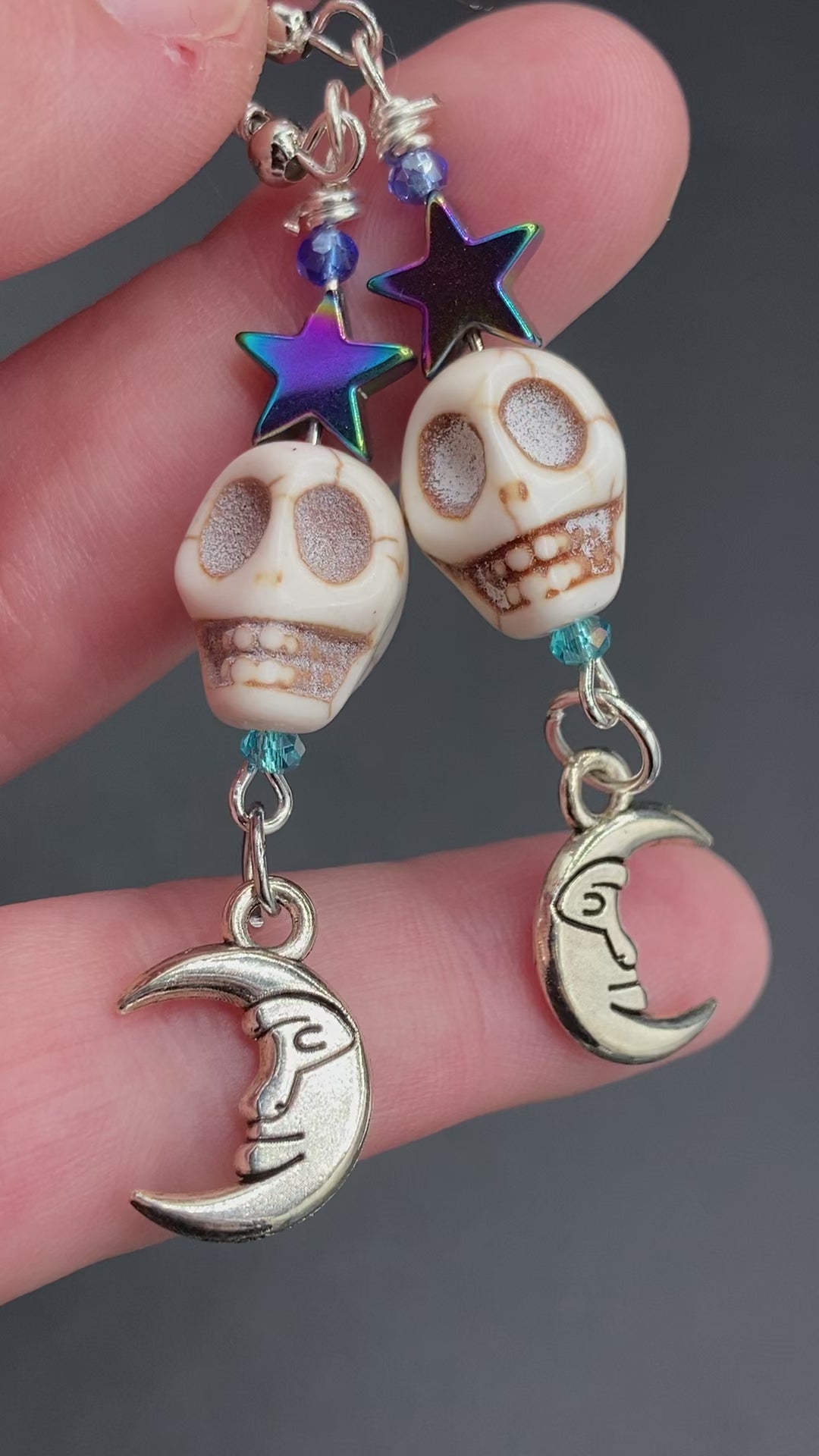 These Galaxy Cosmos Stardust Howlite Skull Bead Earrings feature star-shaped rainbow hematite beads and smiling crescent moons, creating a mesmerizing effect with a subtle witchy vibe. The versatile design allows you to dress them up or down to give any outfit a unique look.