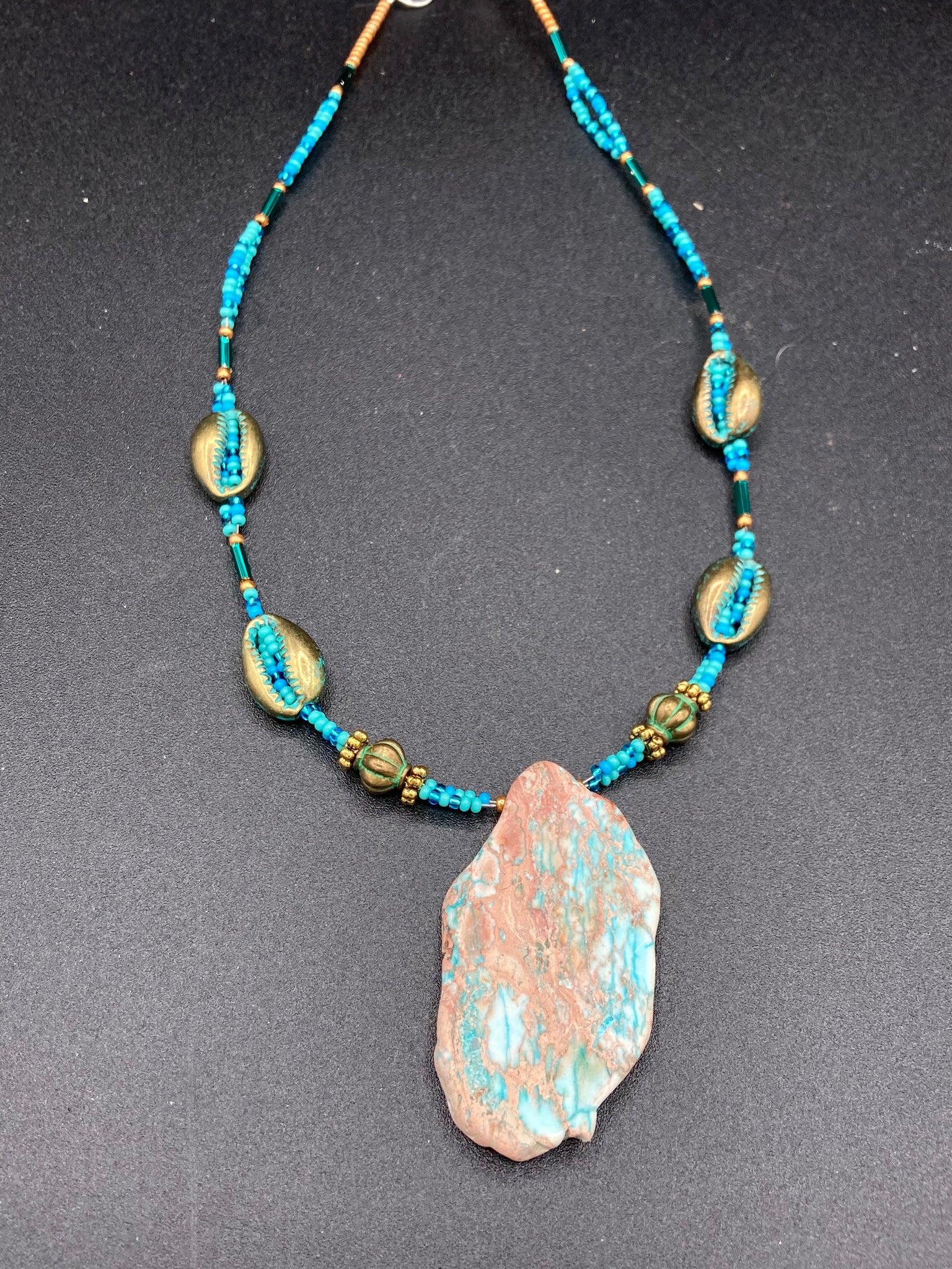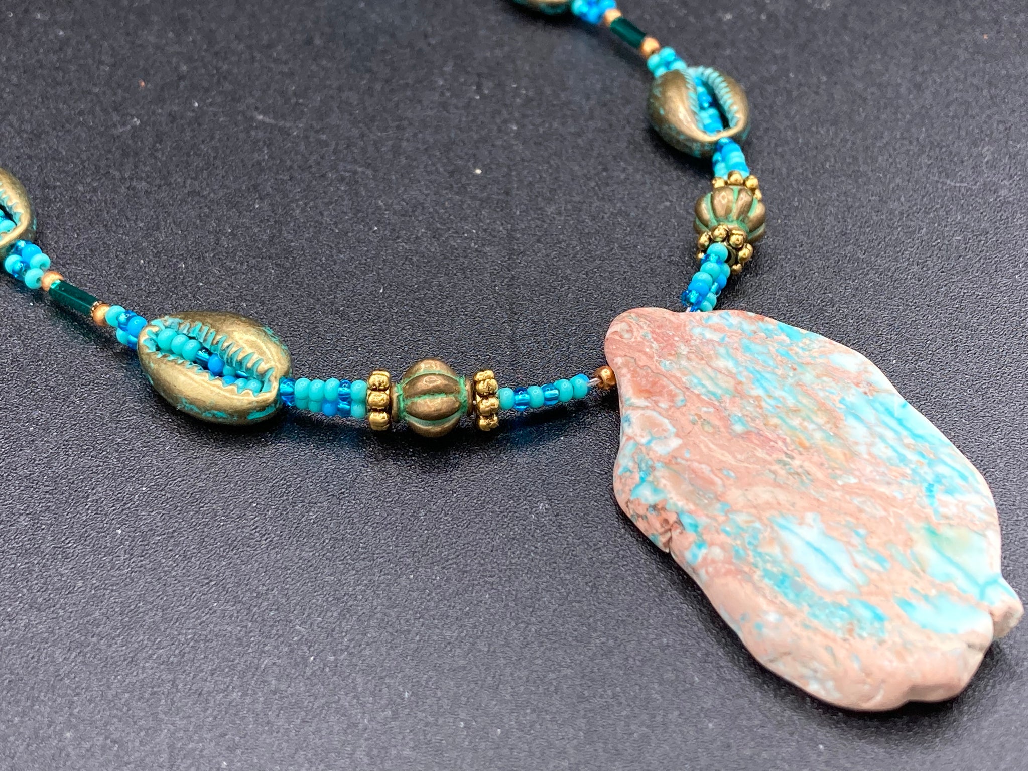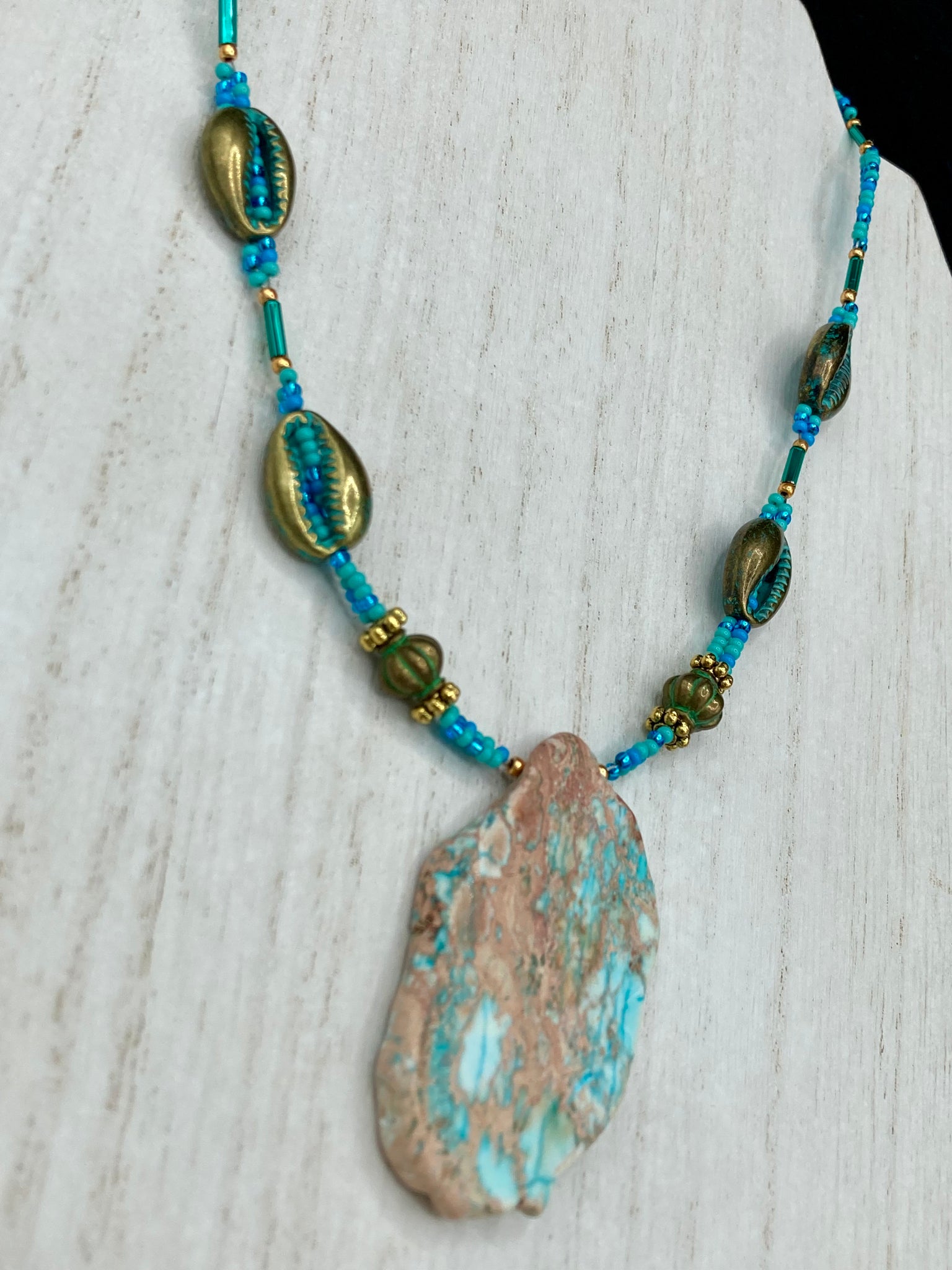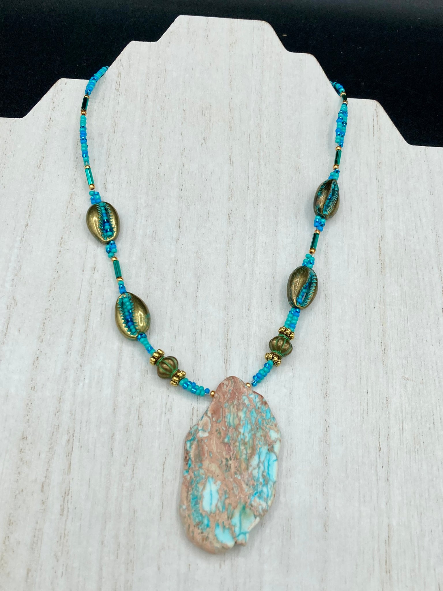 This stunning two-strand necklace features an array of glass beads in hues of green and blue turquoise, gold and green for a vibrant, colorful and bold look. The centerpiece is a large howlite stone chip dyed in turquoise color, accented by the bronze patina cowry beads.